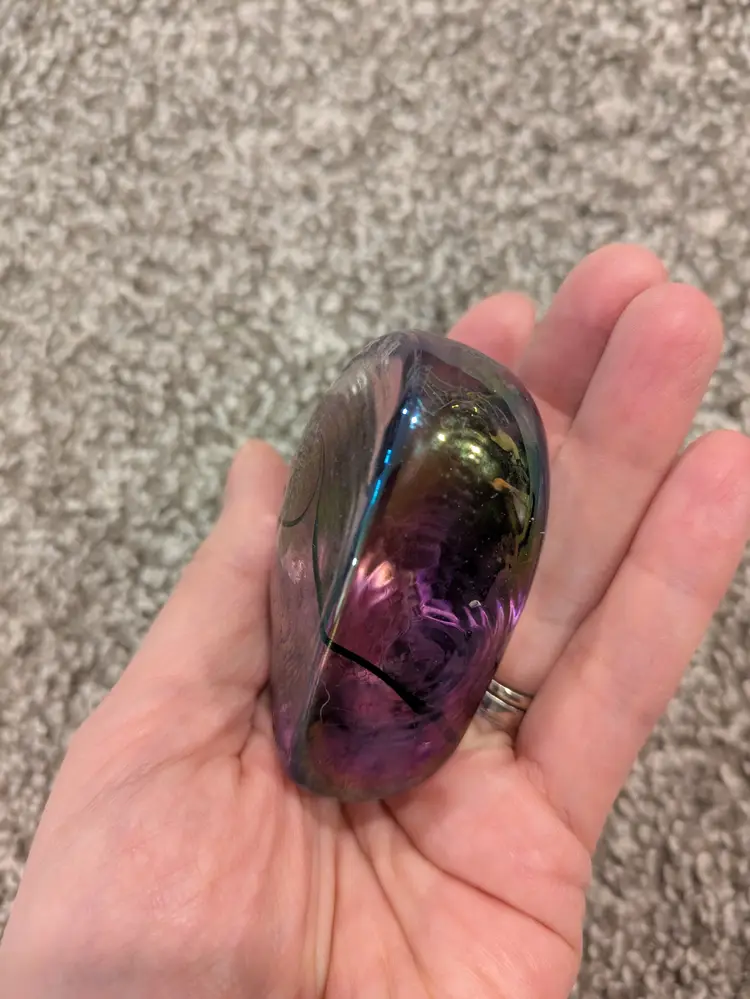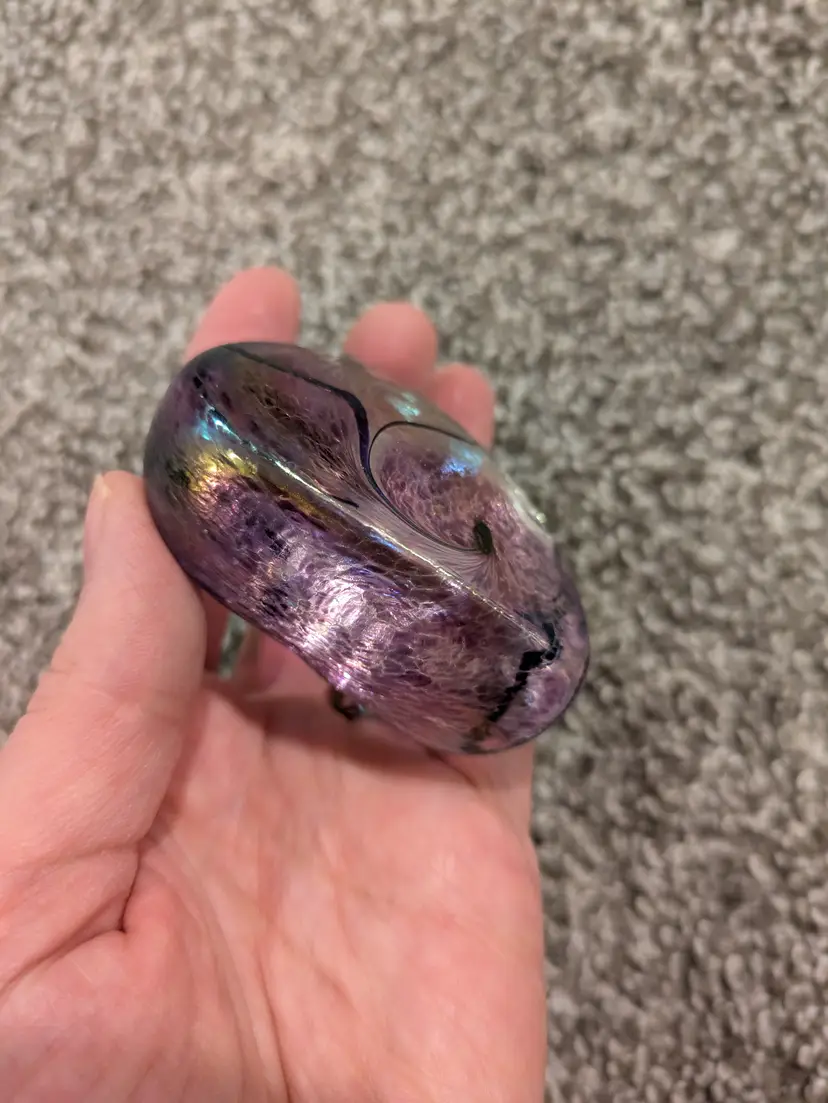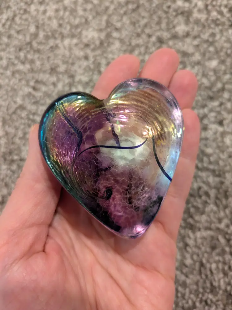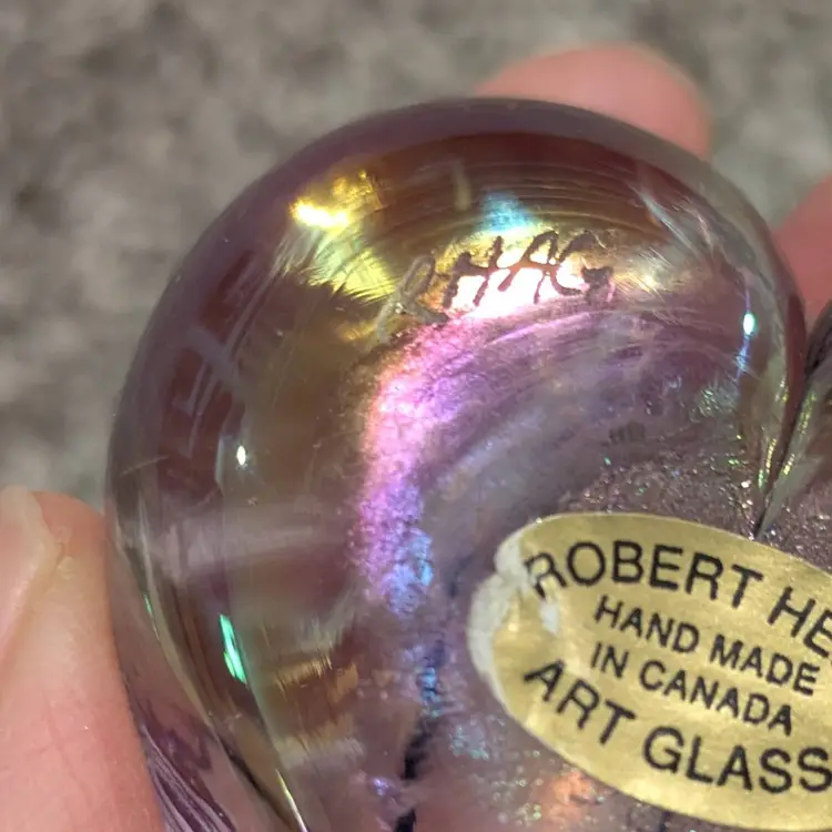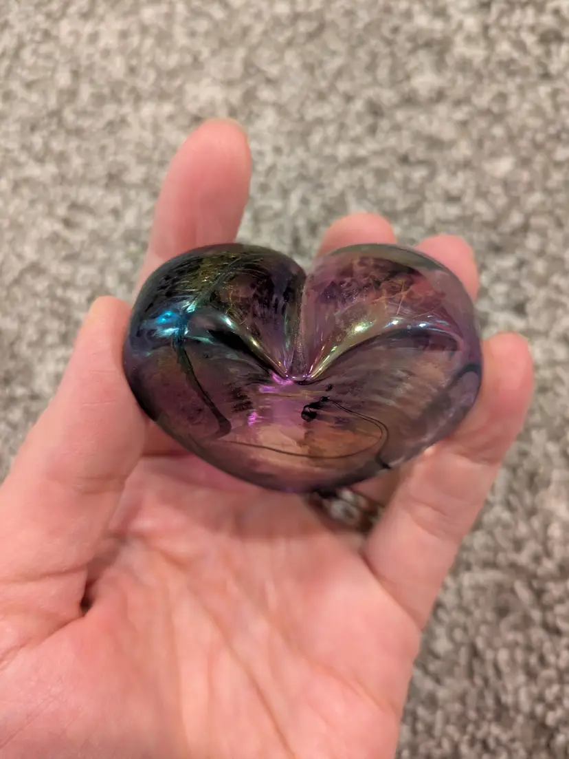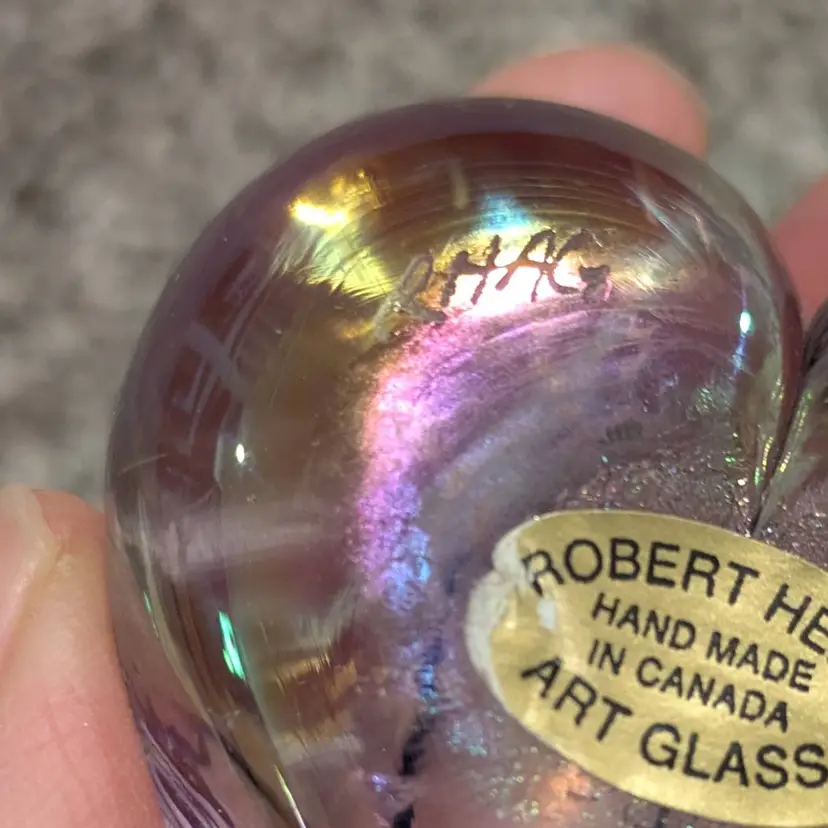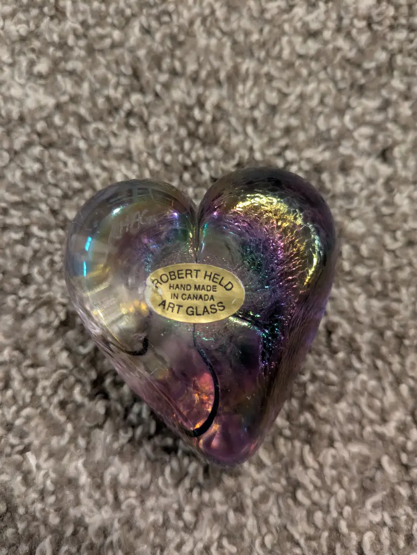 Purple iridescent signed Robert Held art glass heart in excellent condition. This piece measures about 2.5" x 2".