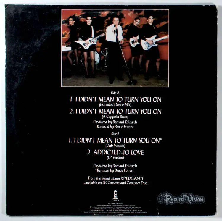 I Didn't Mean to Turn You On, by Robert Palmer, is a song written by Jimmy Jam and Terry Lewis and originally performed by Cherrelle in 1984. In 1986, I Didn't Mean to Turn You On was covered by Robert Palmer. Palmer's cover fared better on the pop charts while Cherrelle's version was a hit on the R&B charts. It was released as the fifth single from Palmer's album Riptide. The single hit No. 2 on the Billboard Hot 100 in 1986, only behind Amanda by Boston, and the music video, which featured women much like those featured in Addicted to Love, which hit No. 1 on MTV on October 17, 1986.