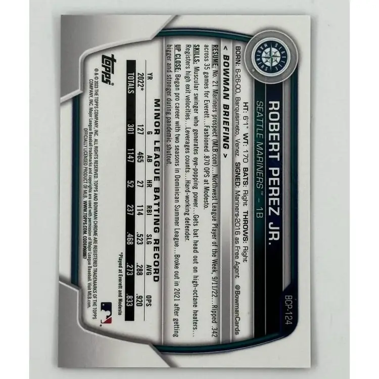 Robert Perez Jr 2023 Bowman Purple Mojo Refractor /250 Seattle Mariners