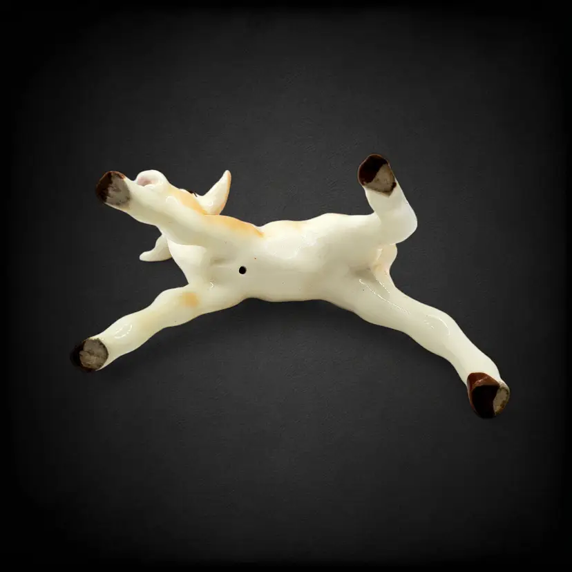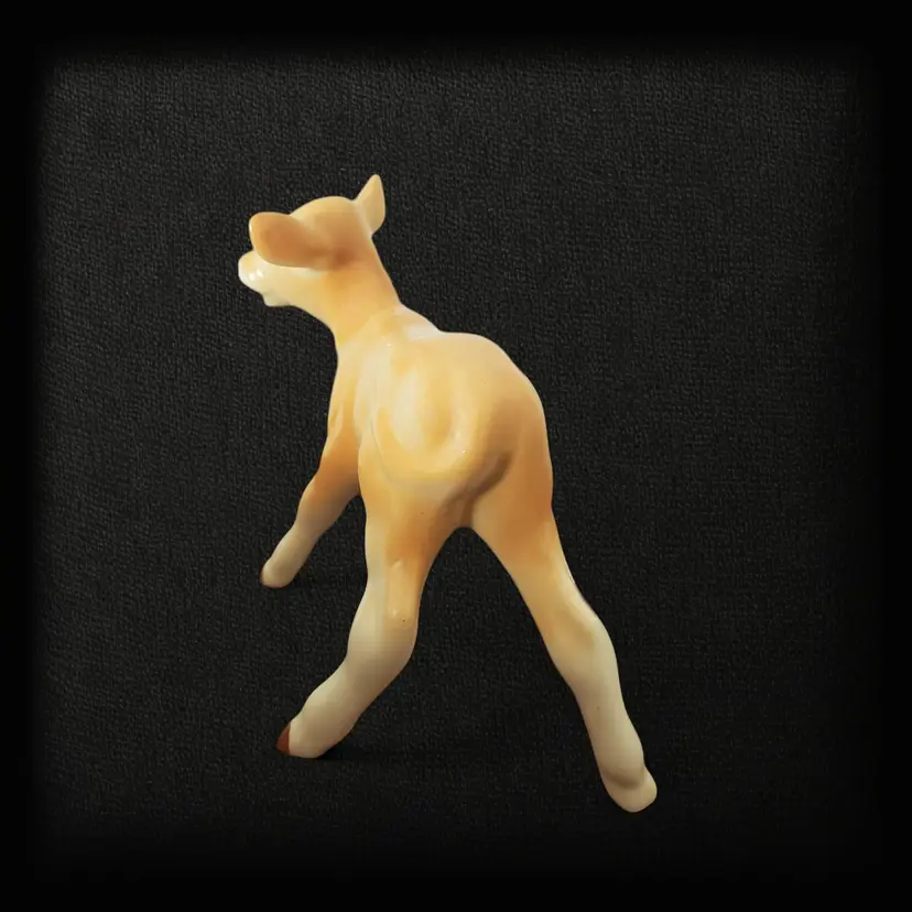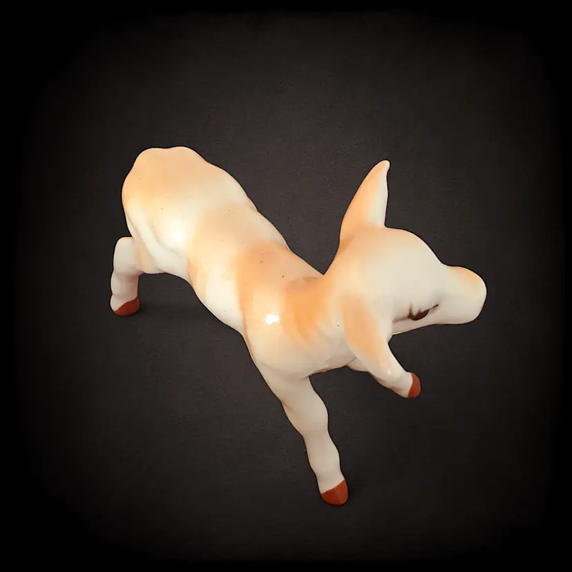 This vintage porcelain figurine by Robert Simmons is a charming addition to any collection. The piece features an adorable calf named Twinkle and is beautifully crafted with intricate details. The figurine measures 2.5"x4"x3.5 and would make a great gift for any animal lover or collector. No chips, cracks, or paint loss.