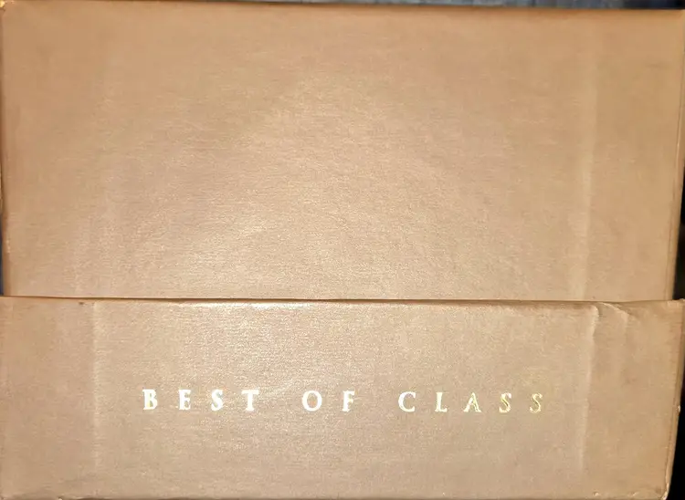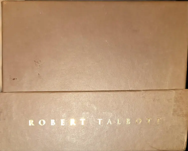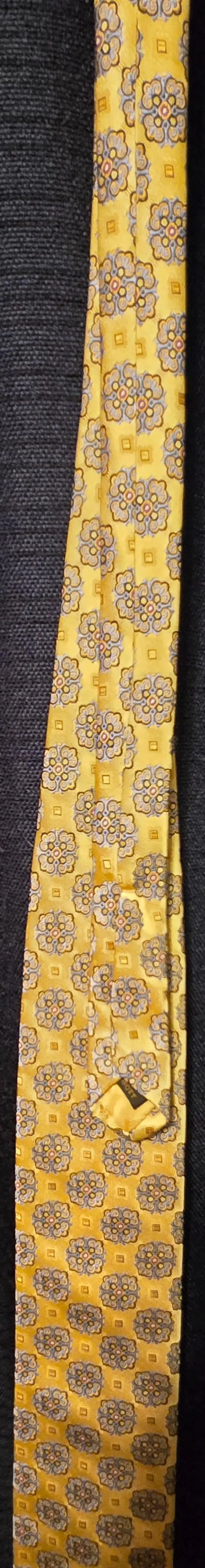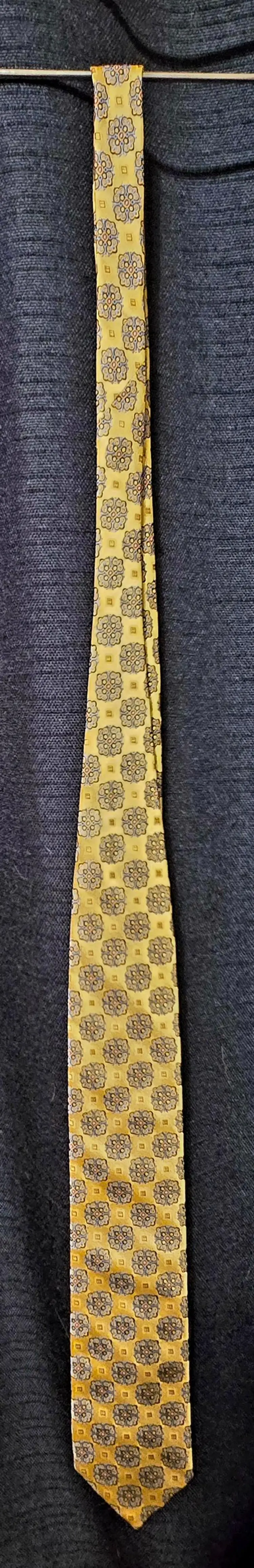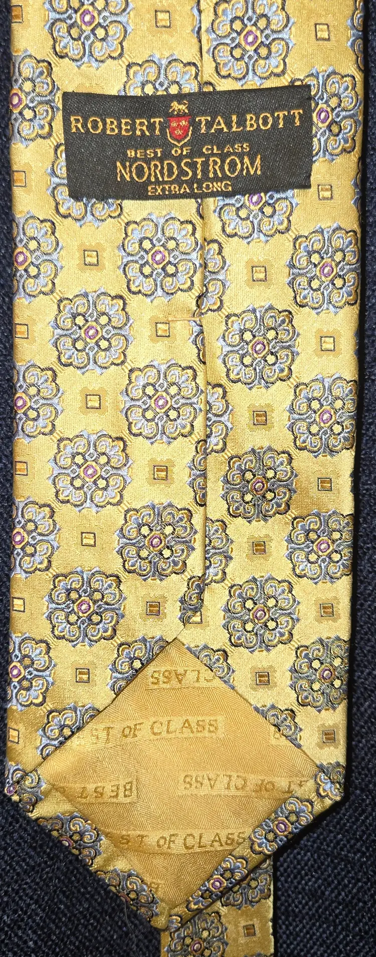 This is a vintage Robert Talbott "Best in Class" tie, made in the USA for Nordstrom. It features a yellow background with a repeating geometric floral pattern in shades of blue, gold, and brown. Robert Talbott is known for high-quality ties, made from silk, and this tie is crafted from silk with a jacquard texture