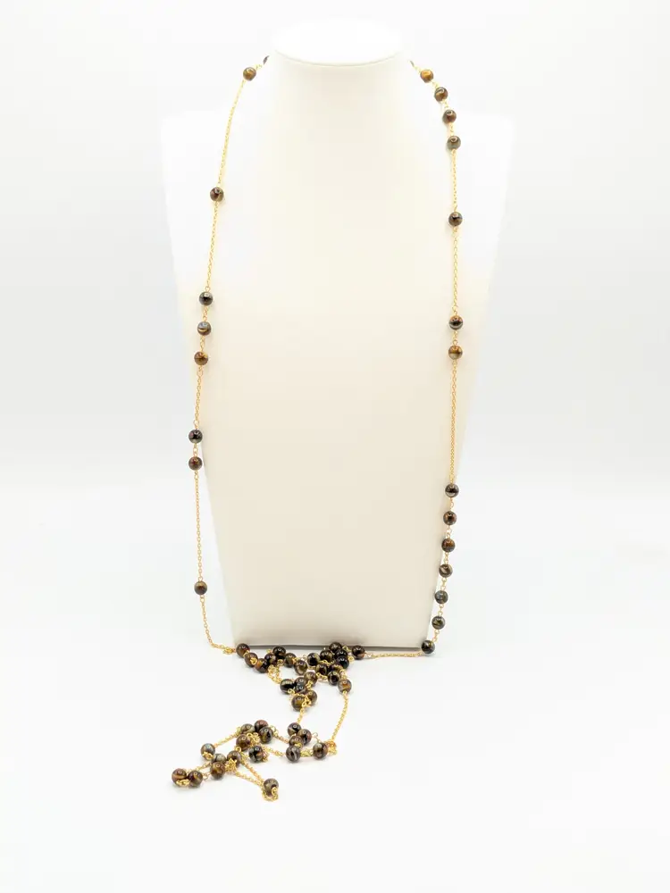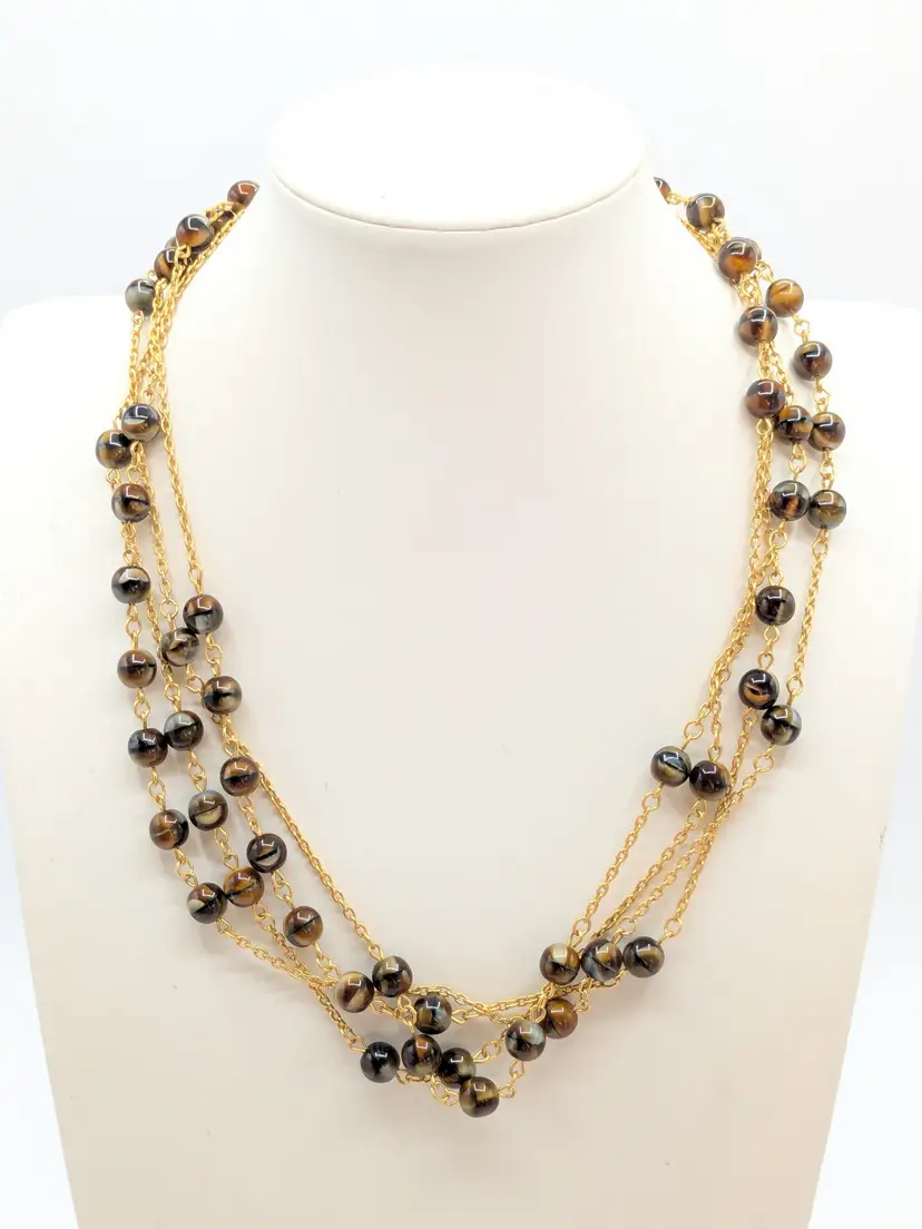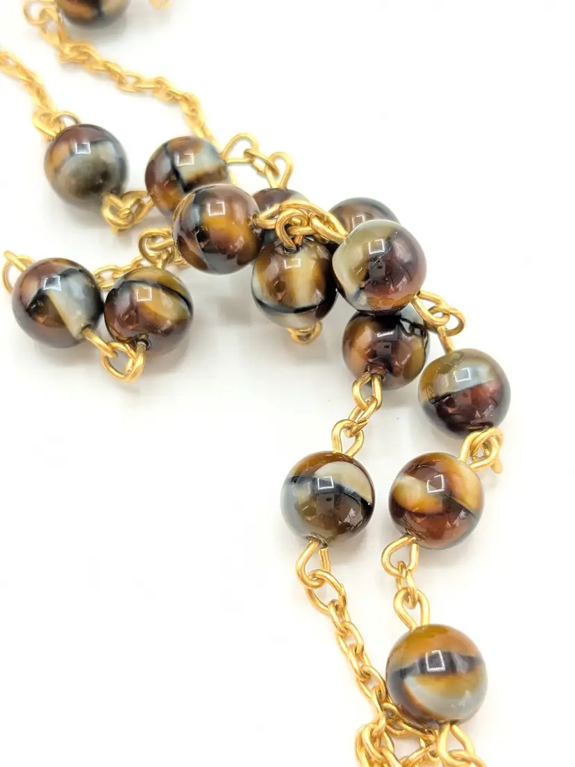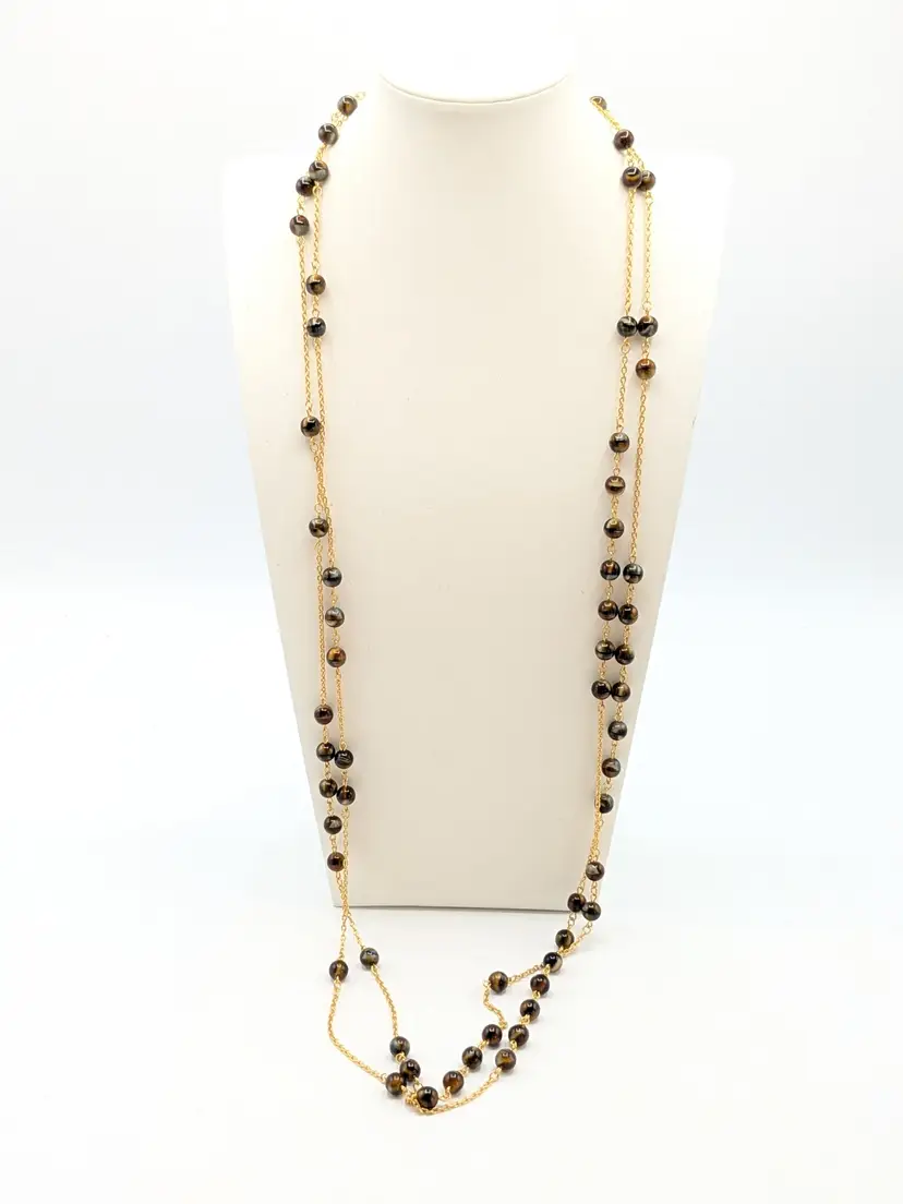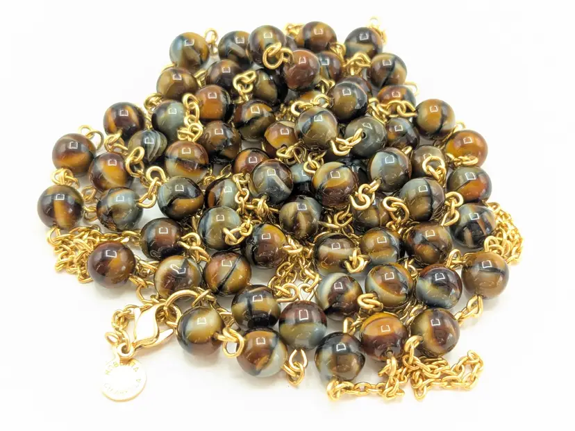 Good condition. Extra long necklace measures approximately 80" with a 4" extender. Gold tone is bright and shiny with no color loss. Beads are shades of brown and black. EN3