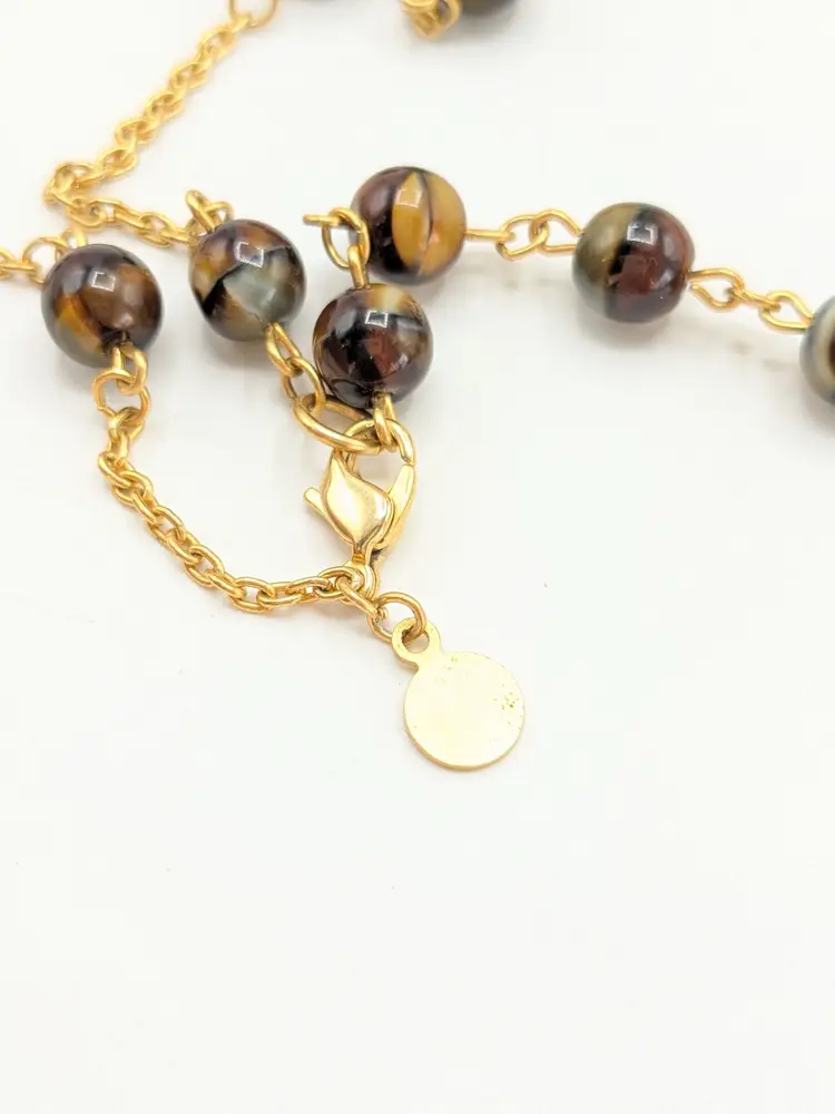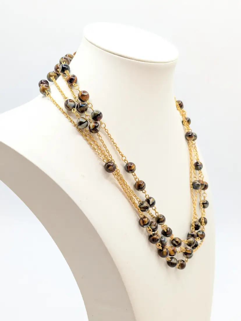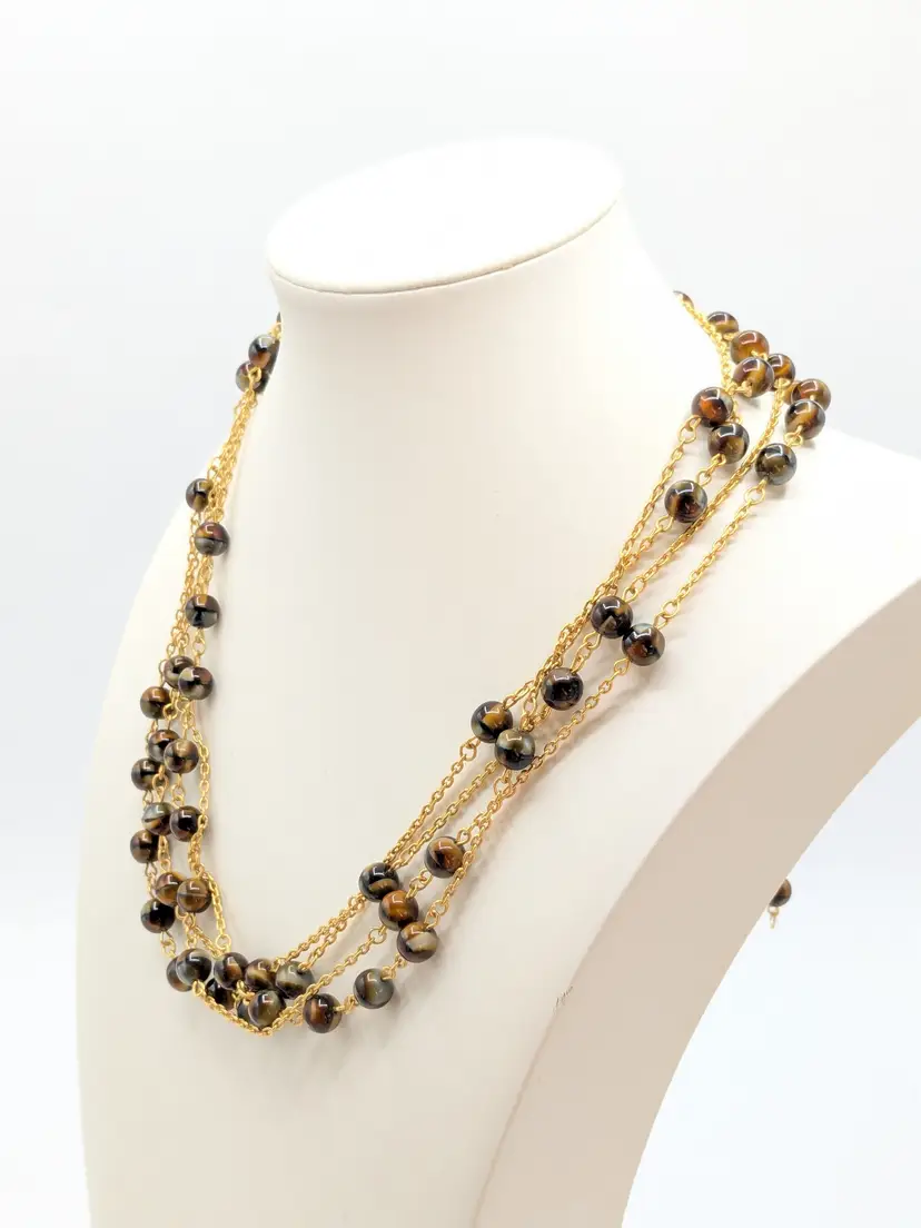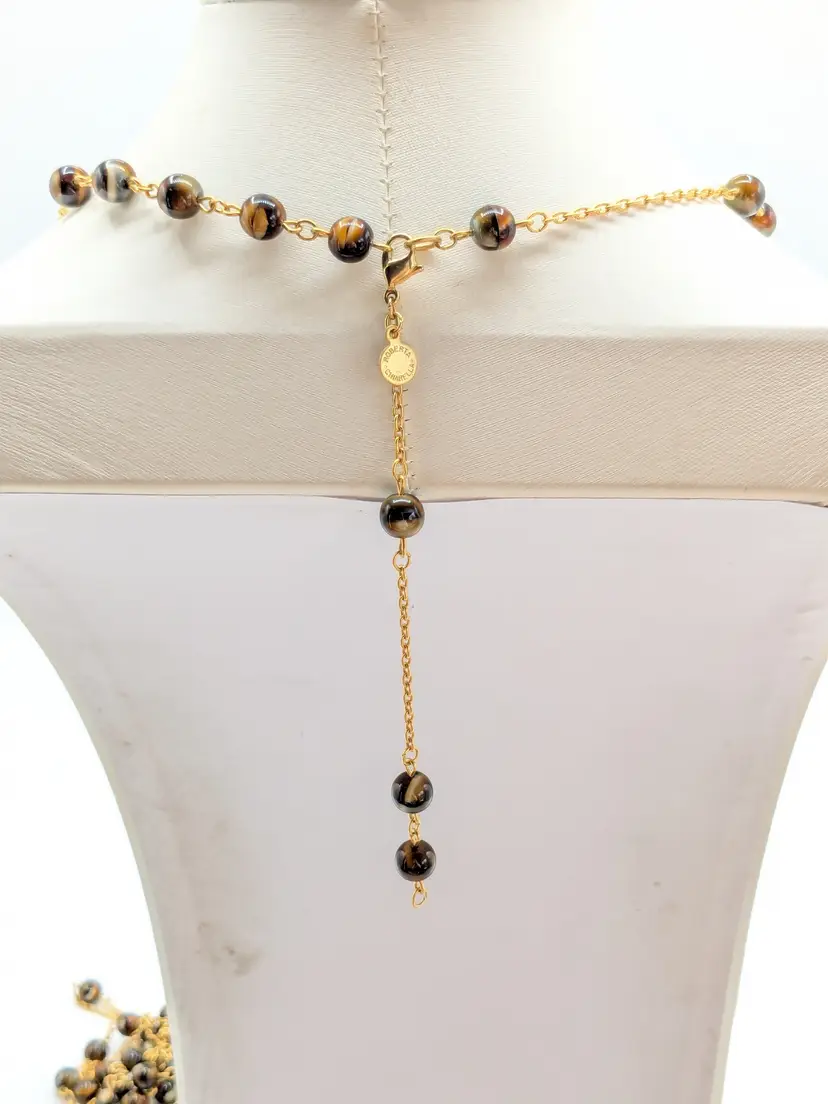 Good condition. Extra long necklace measures approximately 80" with a 4" extender. Gold tone is bright and shiny with no color loss. Beads are shades of brown and black. EN3