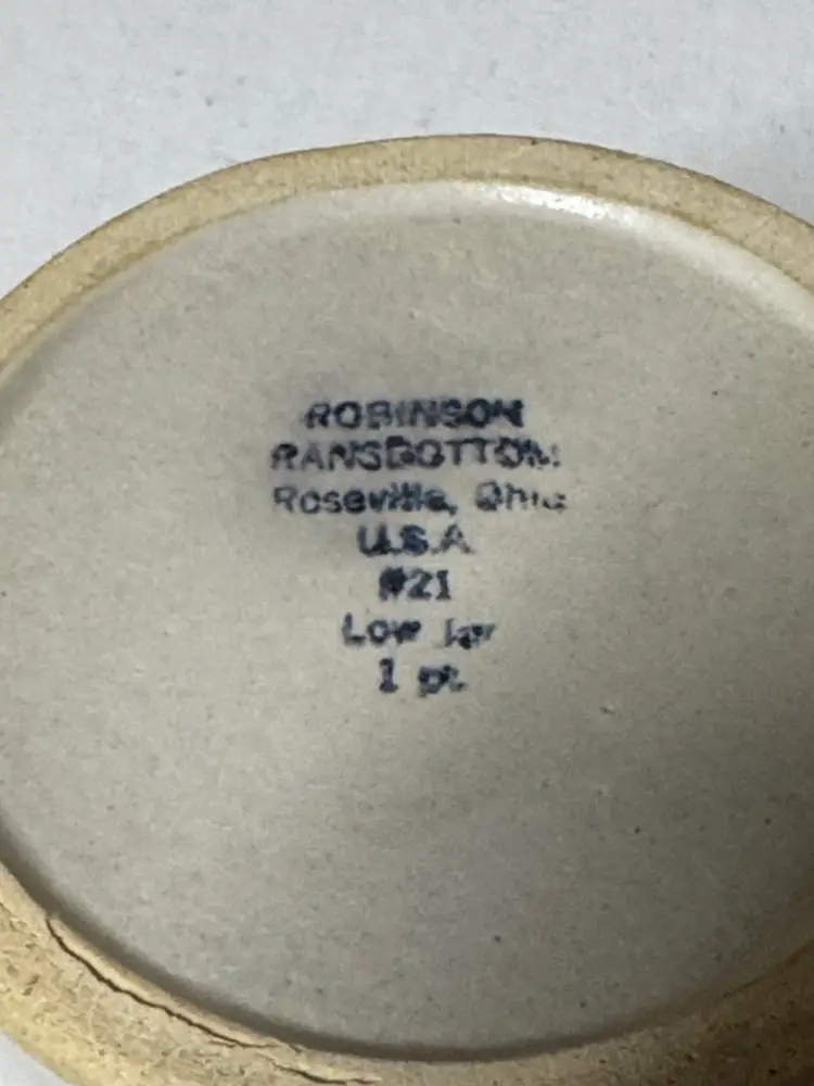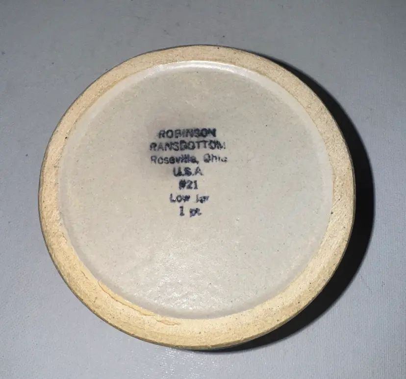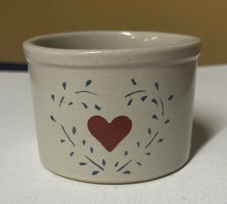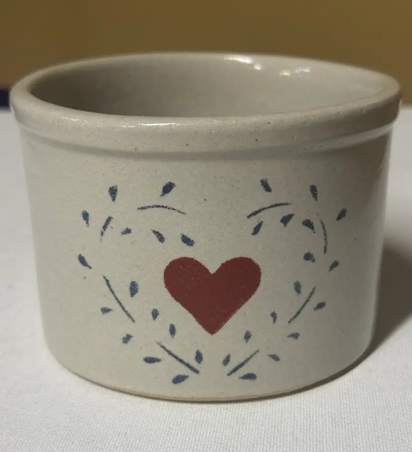 Elegant ceramic pot by Robinson-Ransbottom. Features a red heart with blue decorative accents. Ideal for home decor. Robinson Ransbottom Pottery USA 1 Pint Low Crock Jar Red Heart Blue Leaves Roseville Ohio USA 3.25” tall 4.5” diameter Excellent like new condition with no breaks or chips (1194103025a)