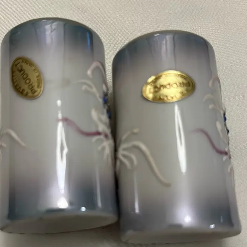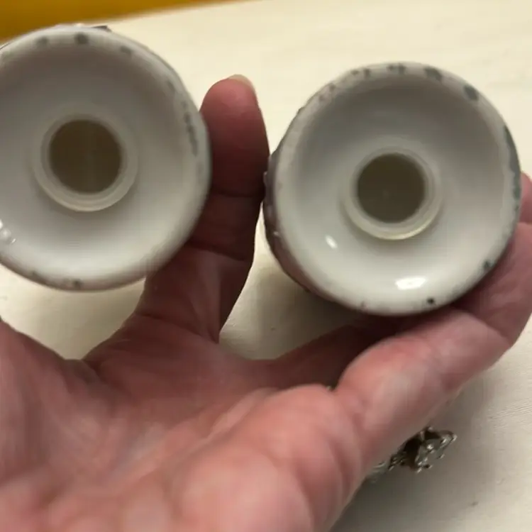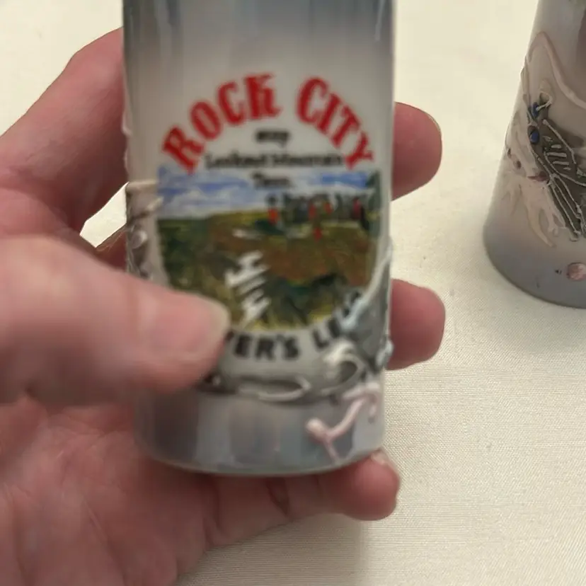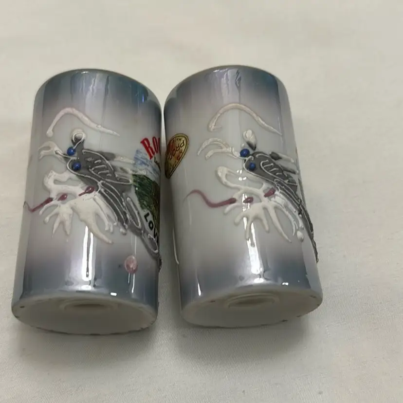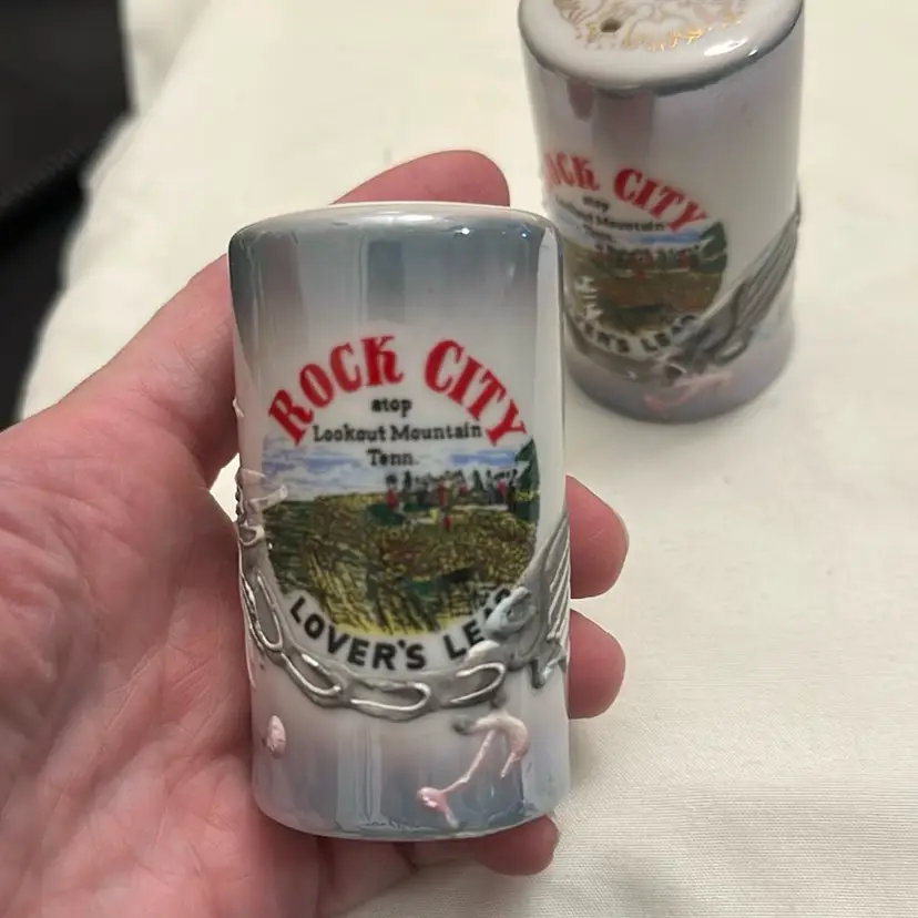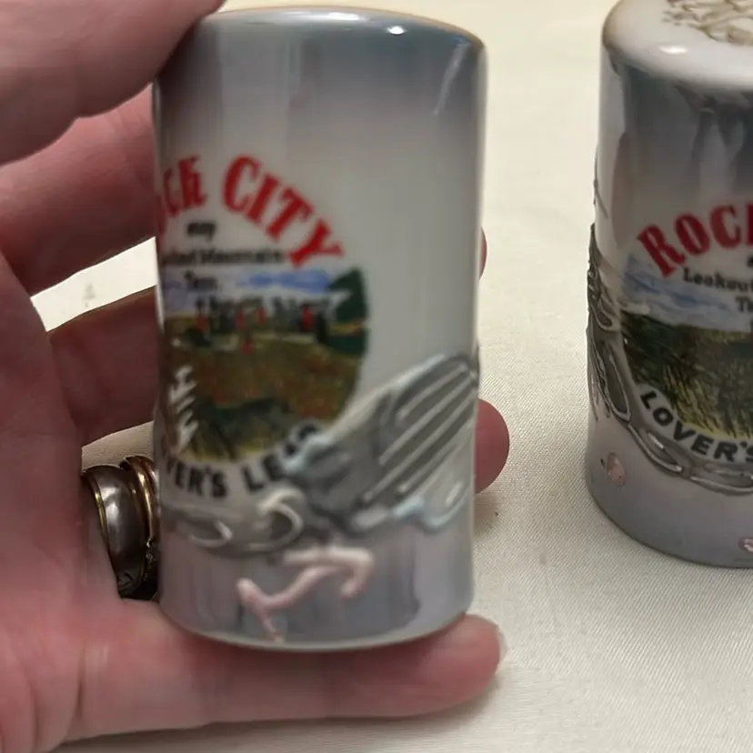 Scenes atop Lookout Mountain, TN on these shakers, original design made in Japan. The pepper shaker has a chip in design, as pictured!