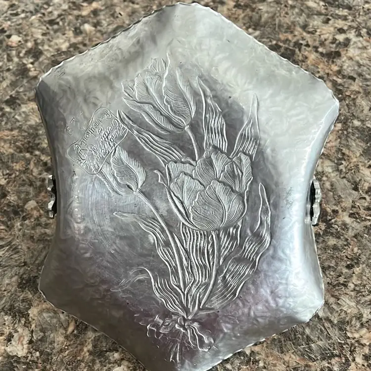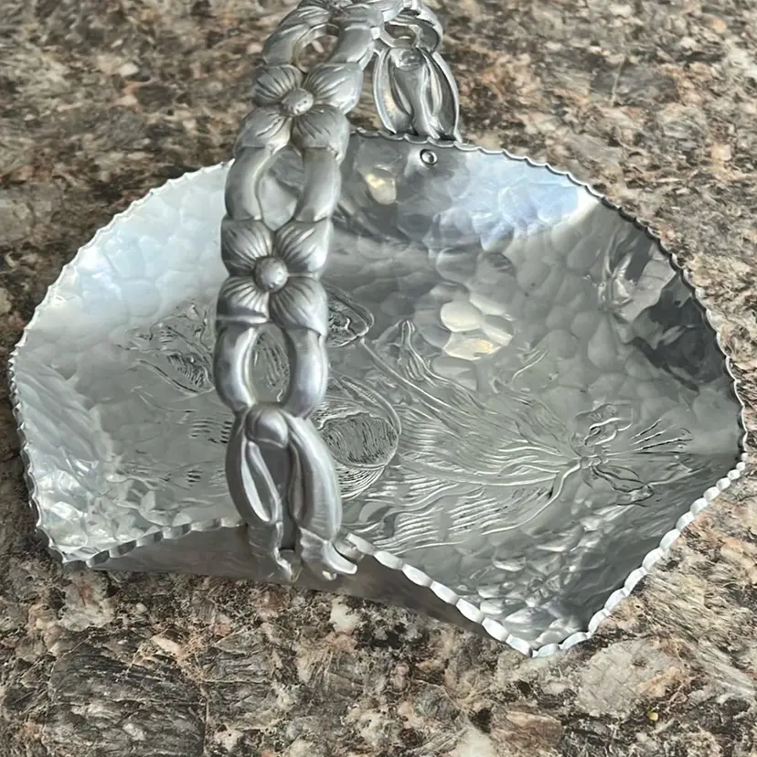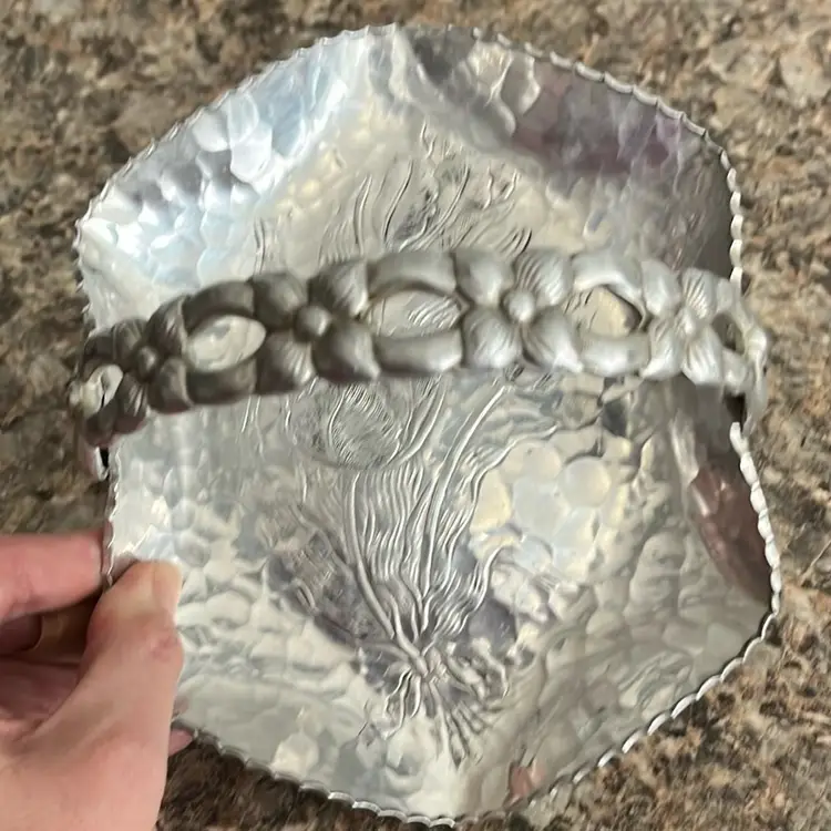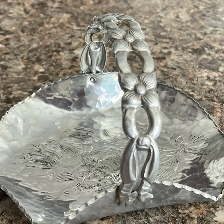 Hammered aluminumware gained significant popularity in the mid-20th century, particularly in the United States, as a decorative yet functional material for tableware and serving pieces. Its lightweight nature, affordability, and the artisanal look achieved through hammering made it a favored choice for households seeking stylish home goods. Many pieces were designed with floral motifs and organic shapes, reflecting the Art Nouveau and Art Deco influences that persisted into the mid-century. Rodney Kent was a notable maker in this genre, known for his distinctive hammered aluminum designs.