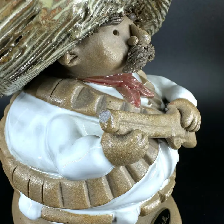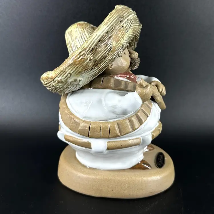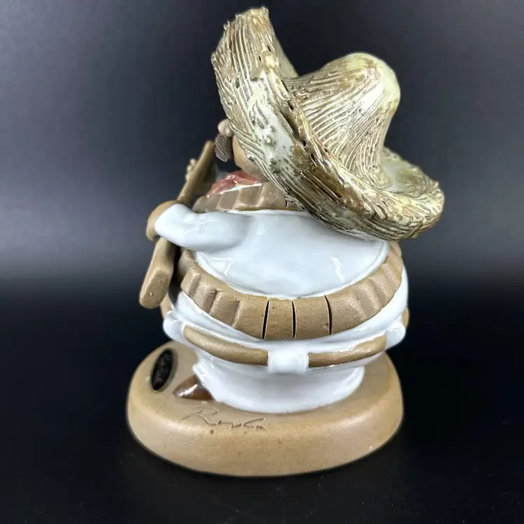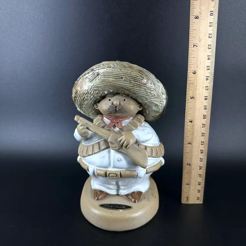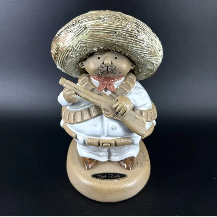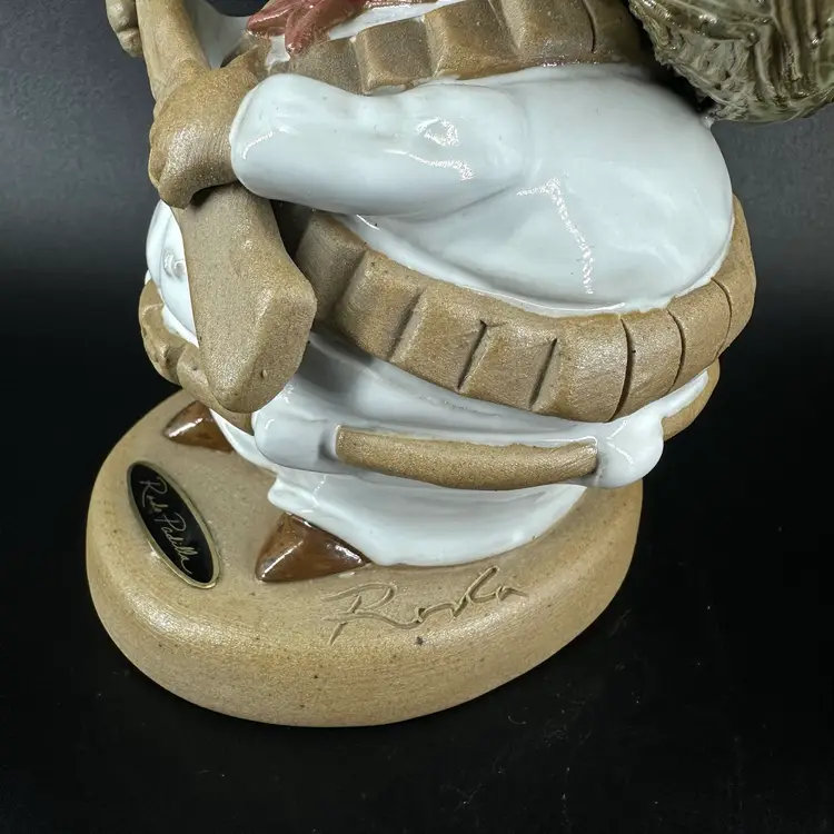 This Rodo Padilla sculpture is made of ceramic and features a cowboy with gun in hand. There are no cracks in sculpture, but a crack on the tip of the gun, as seen in pictures. It is engraved “Rodo” on the side, as well as a “Rodo Padilla” metal plaque on the front. Sculpture measures approximately 7” tall.