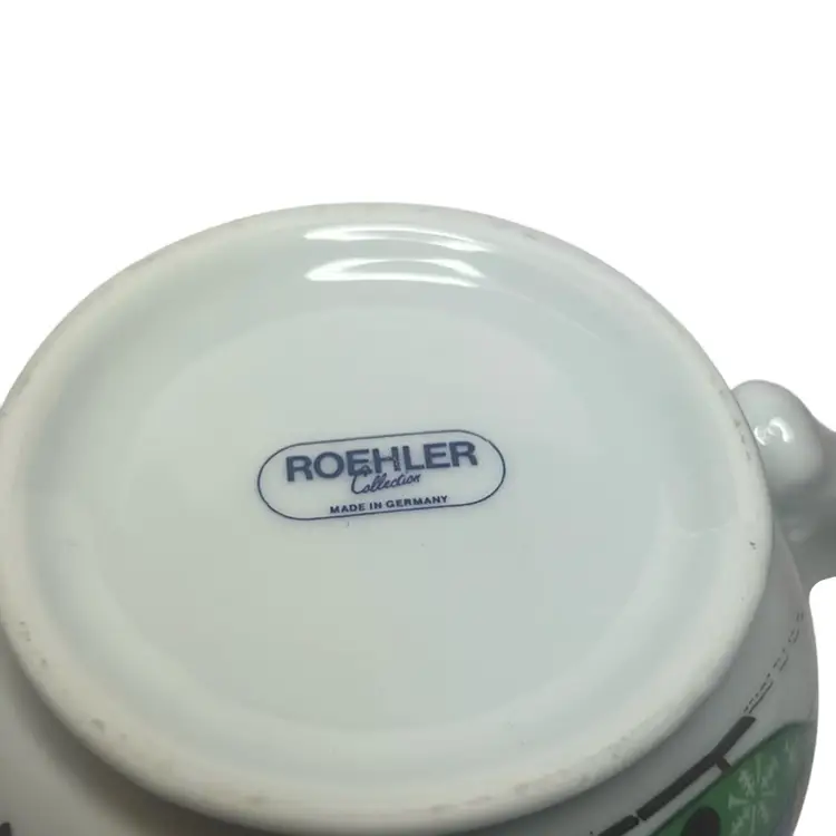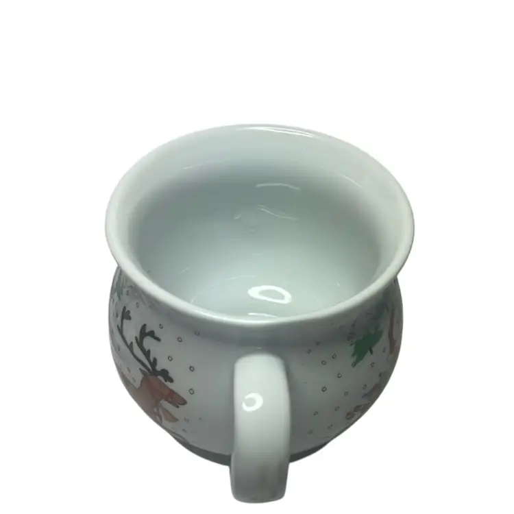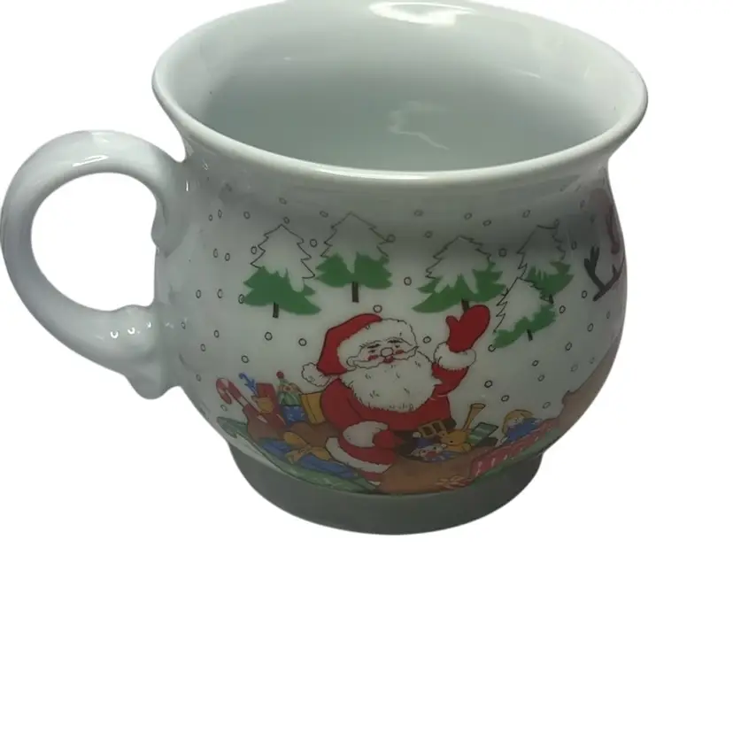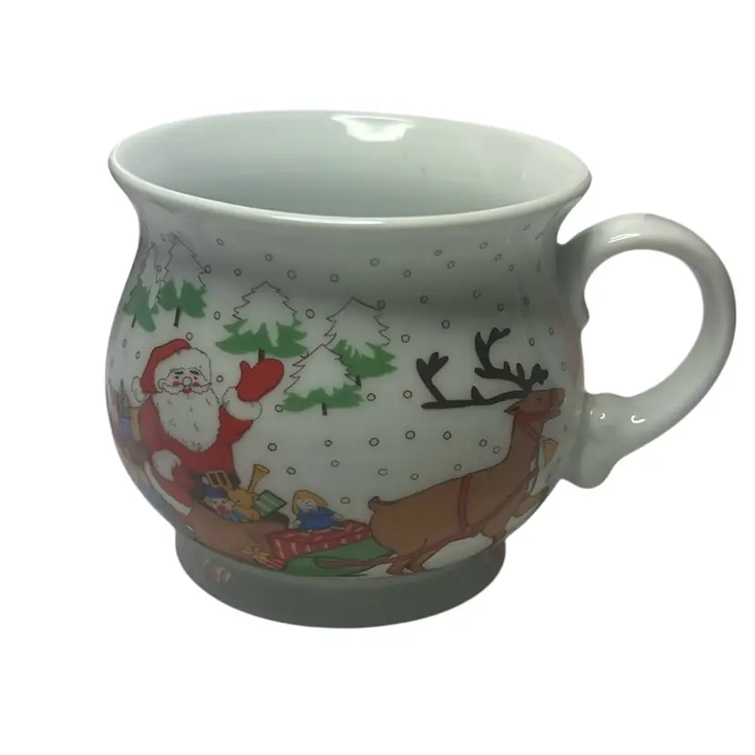 Has Santa on both sides and his sleigh being pulled By reindeer. Well made mug - no damage and measures 3.5” tall & 3.75” wide