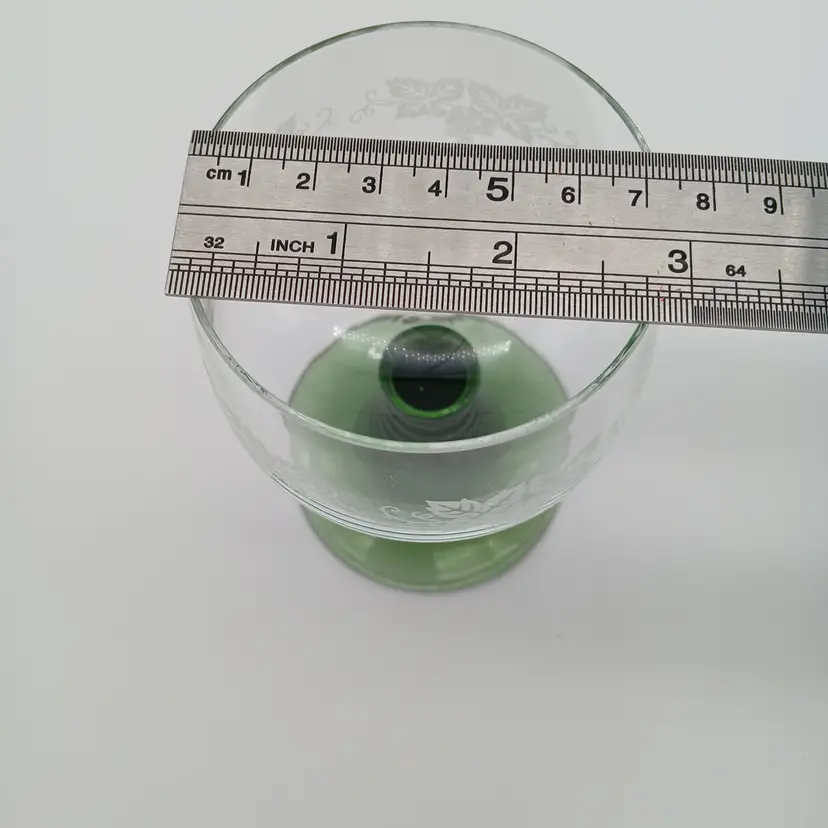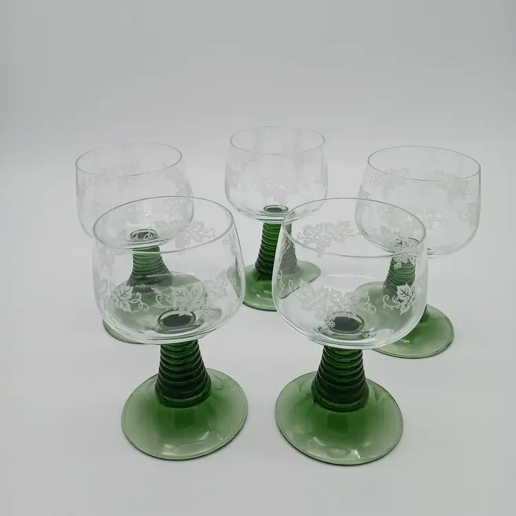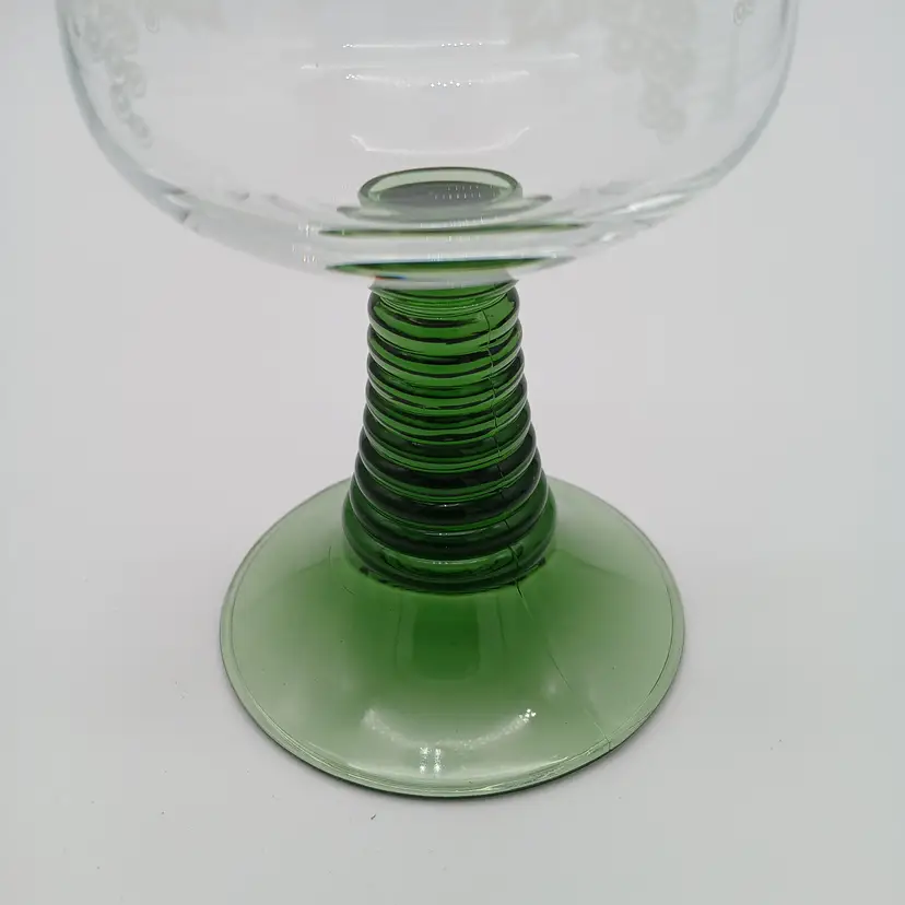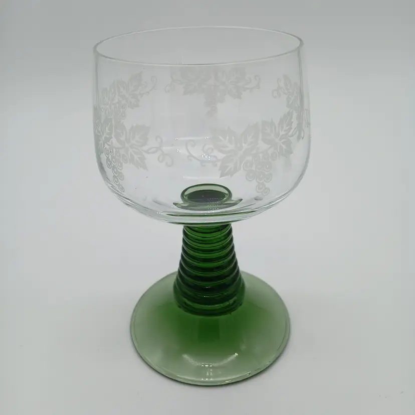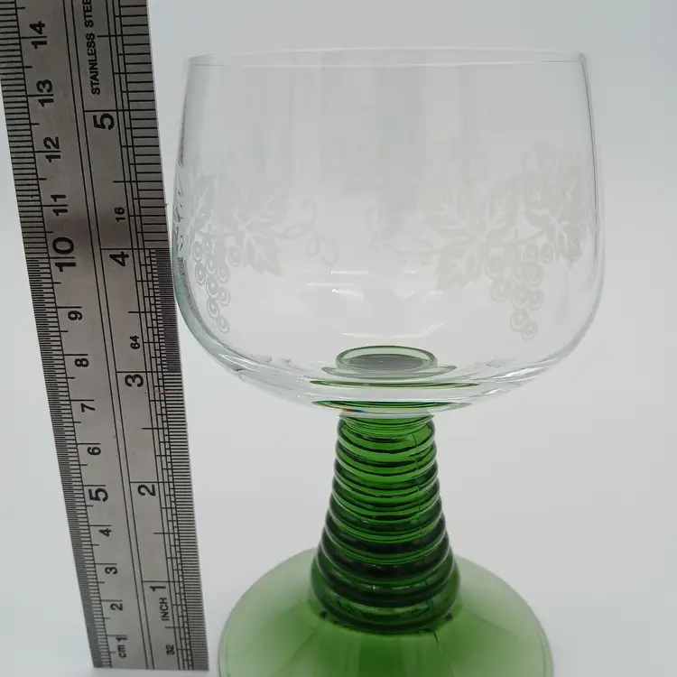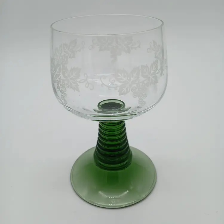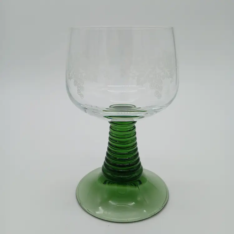 Beautiful vintage Roemer green beehive stem wineglasses! So pretty! Not quite 5.5" tall, these wineglasses are a perfect size for so may things! The grape etching on the clear part of the glass is beautiful. No chips or cracks, in perfect pre-owned condition. This listing is for one wineglass.