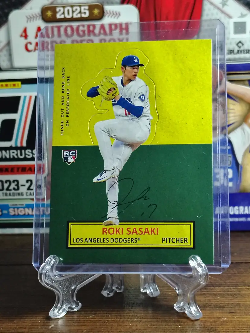 This card features Roki Sasaki, and is a 1964 Stand-Up Card from 2025 Topps Archives. The autograph is printed on the card and is NOT a real autograph.