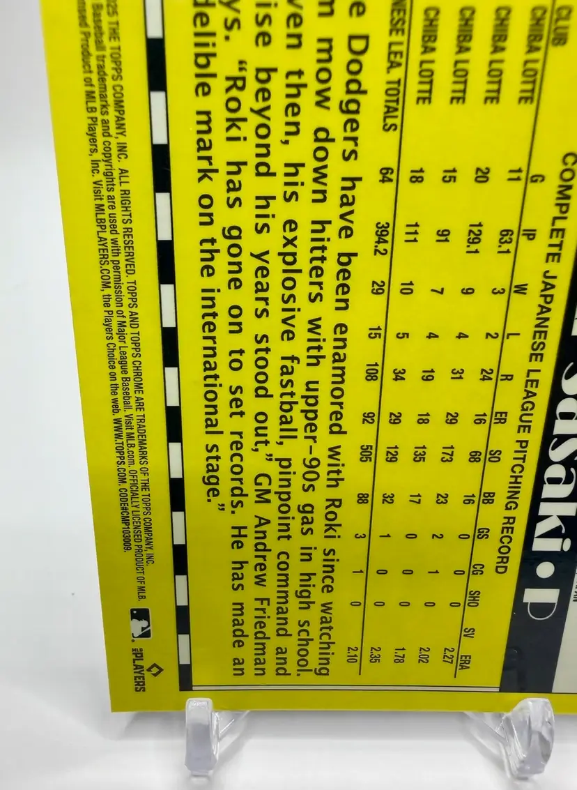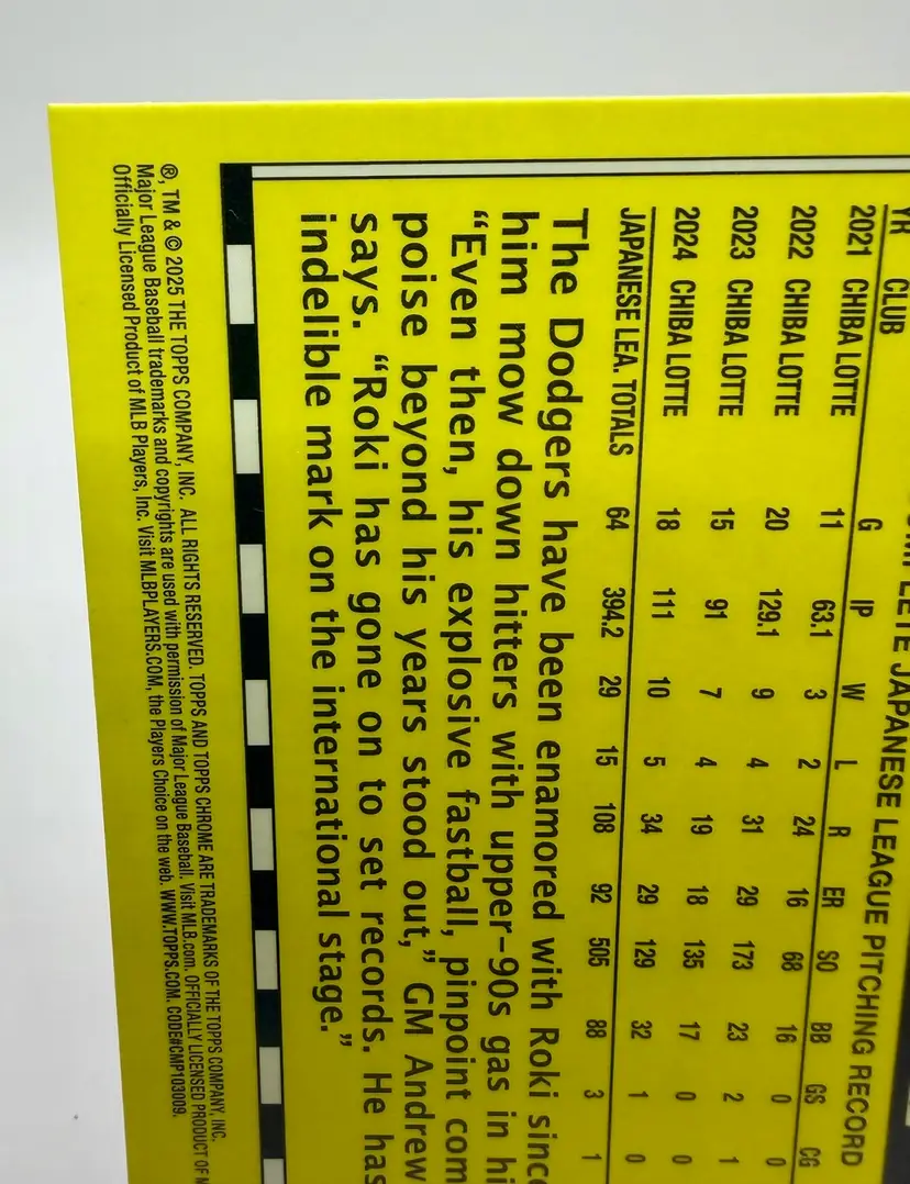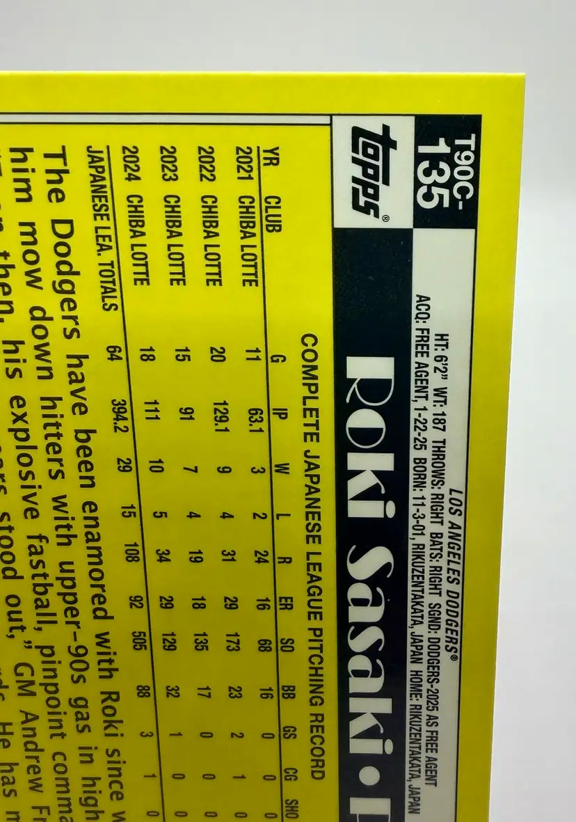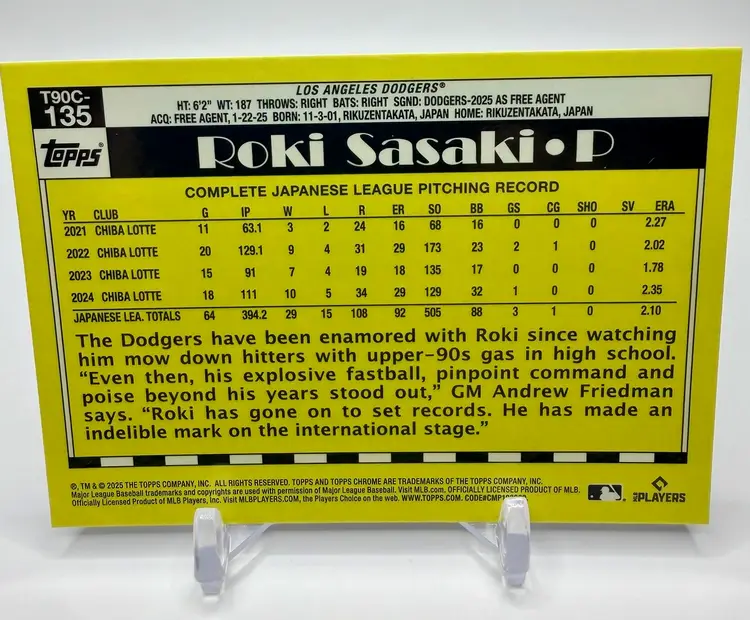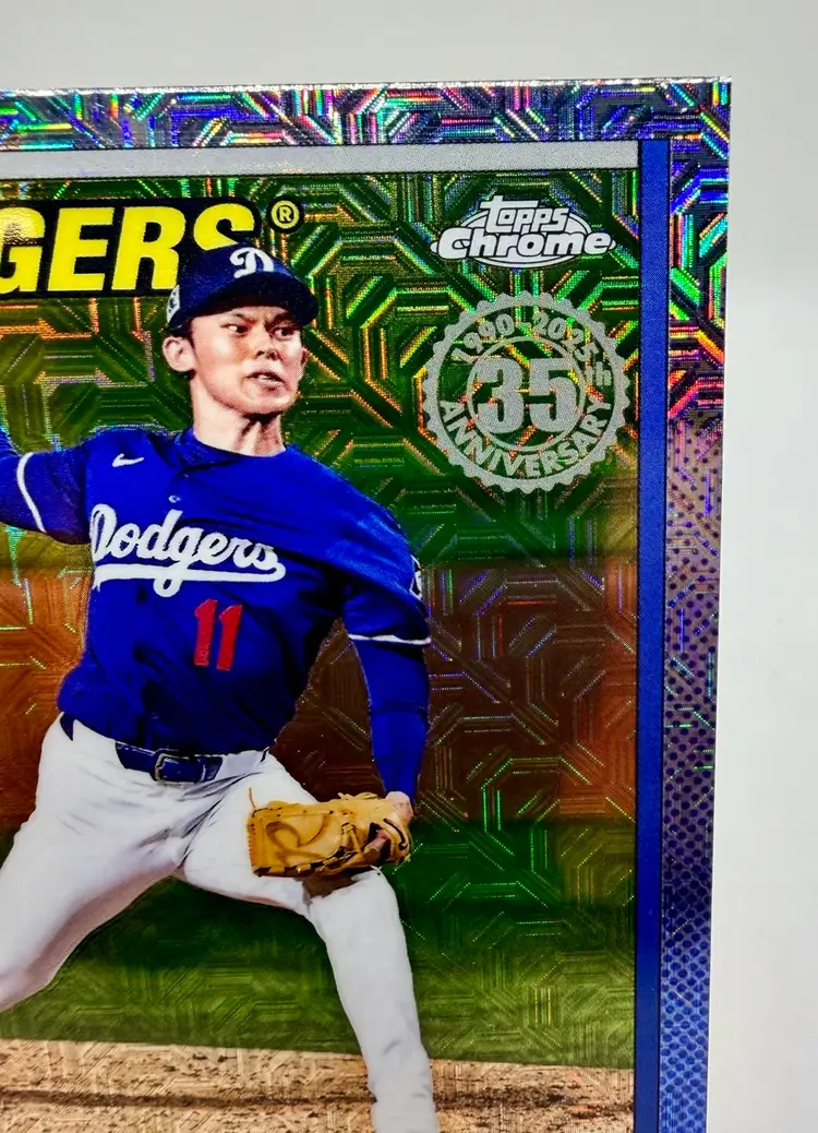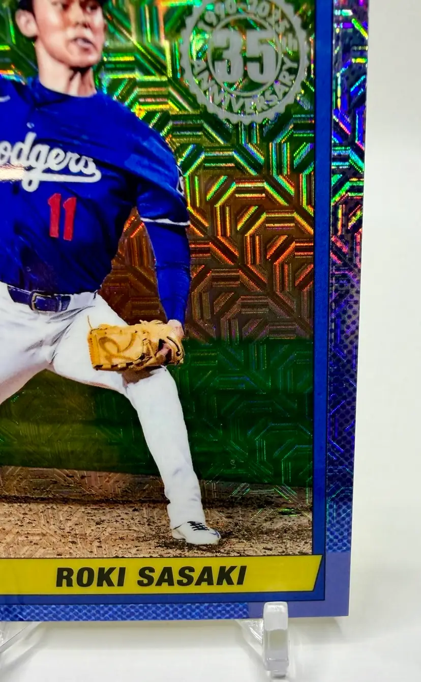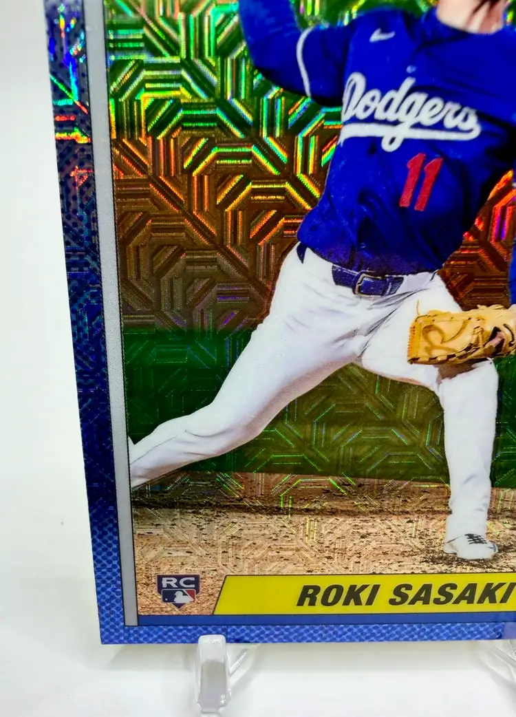 2025 Topps Series 2 trading card featuring Roki Sasaki of the Los Angeles Dodgers. This single-insert card is part of the 1990 Topps Chrome Silver Pack insert set, with a Mojo parallel variety. Please review the photos carefully to assess the condition of the cards. We do our best to provide clear, detailed images, especially for cards with noticeable flaws. Please note that some raw cards may show light wear, so we encourage close inspection. Cards will be shipped securely. Thank you for checking out our store and for your support! I'm on Instagram as @915_rookie_rush_trading_cards.