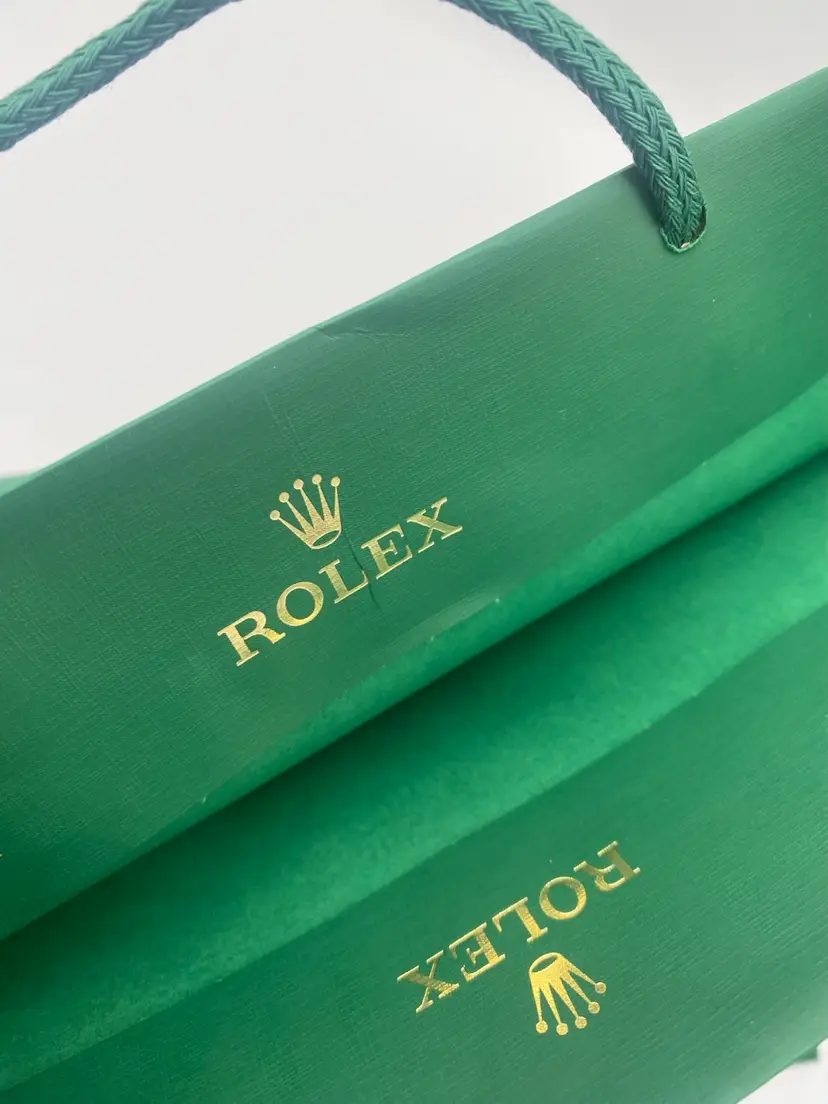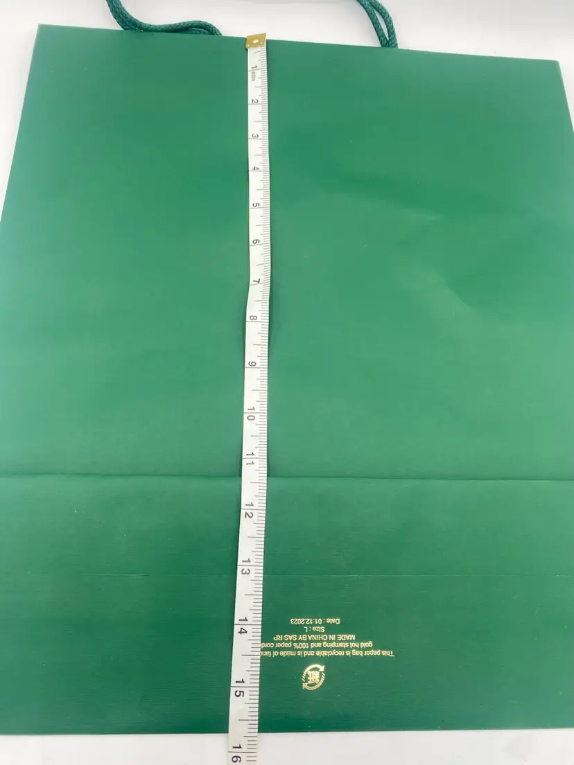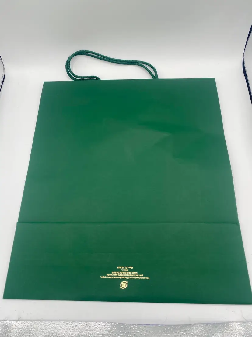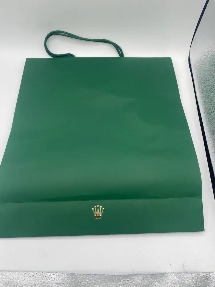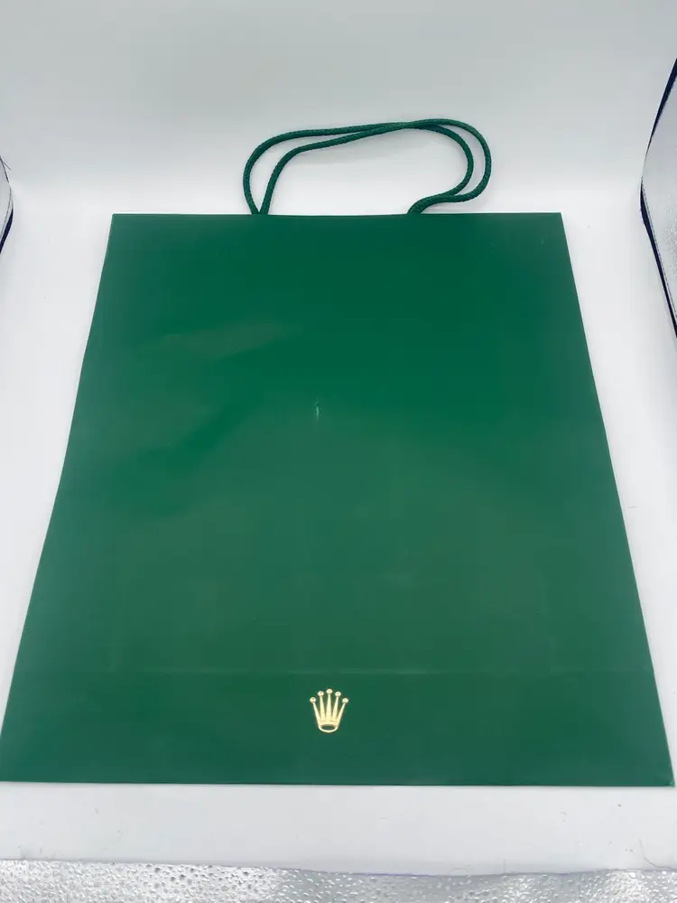 Add a touch of luxury to your shopping experience with this elegant green paper shopping bag from the renowned Rolex Boutique. Measuring 16” x 14”, this large tote is perfect for all occasions and features a solid pattern that exudes sophistication. The bag is reusable, making it an eco-friendly choice for those who value the environment. Crafted from high-quality paper material, this gift tote is perfect for adults who appreciate the finer things in life. The bag is adorned with the iconic Rolex character, adding a touch of glamour to your shopping experience. This item is brand new and has never been used, making it an excellent choice for those who want a pristine and reliable shopping bag.