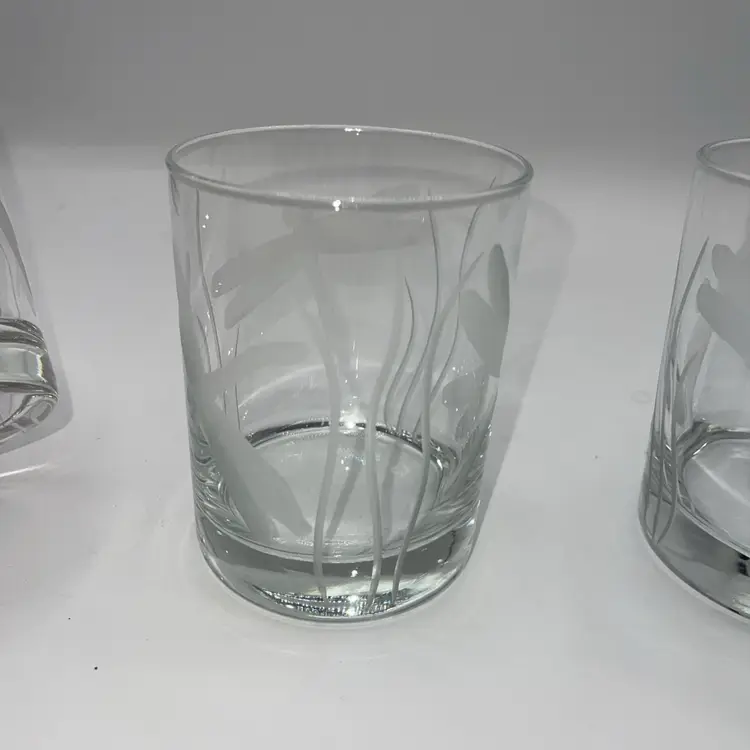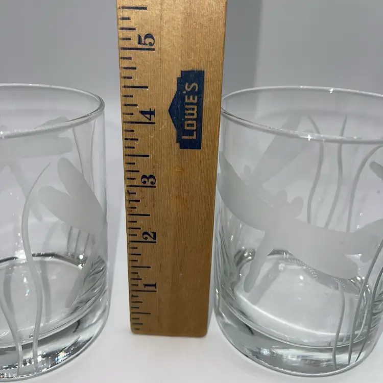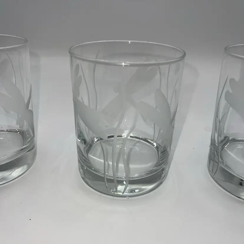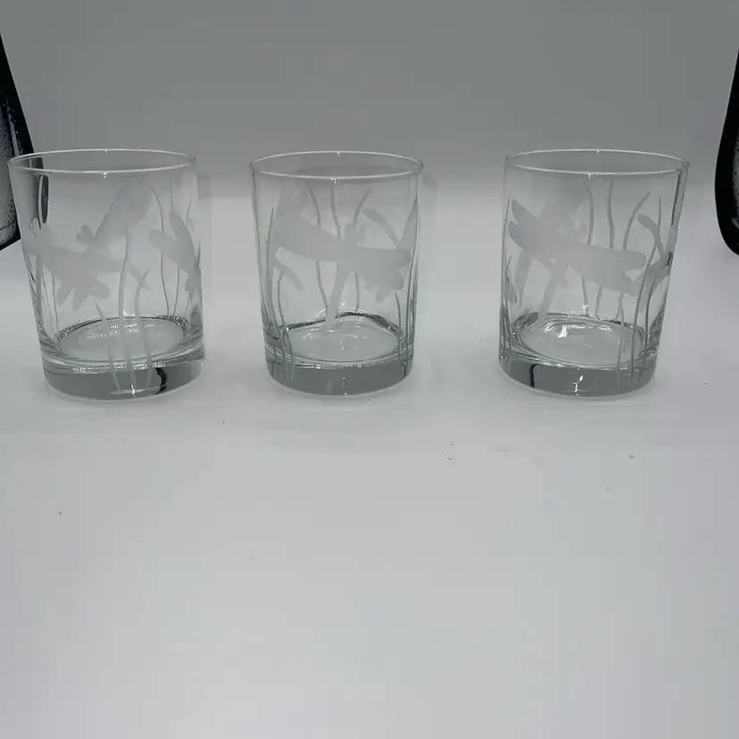 Rolf Double Old Fashion Set of 3 Etched Dragonfly and Reed 14 oz Glasses Barware 4.25”