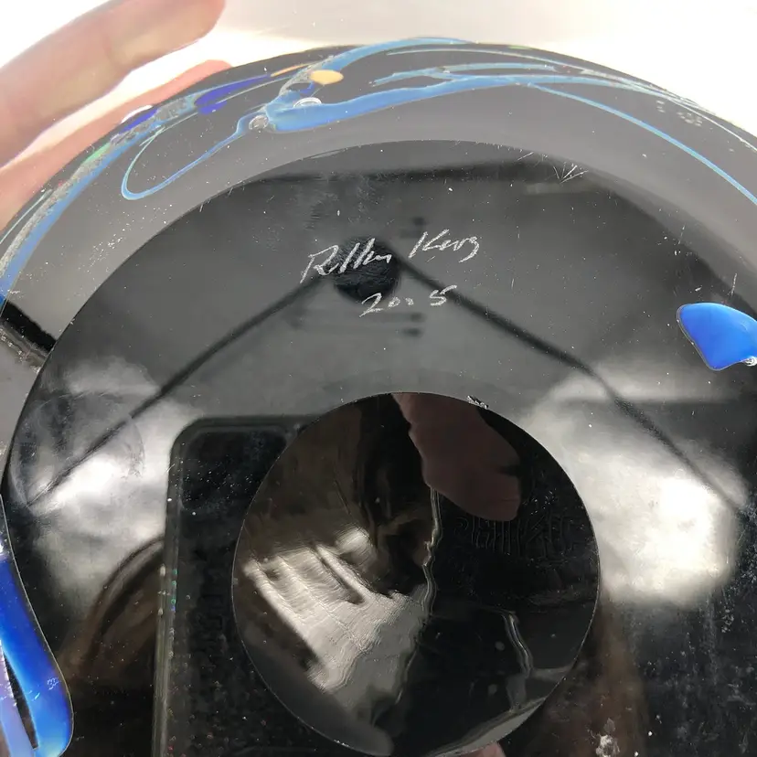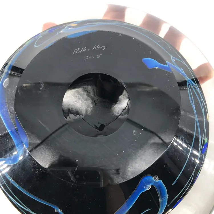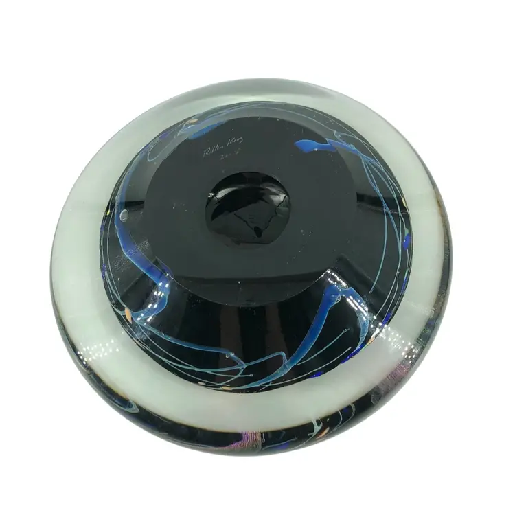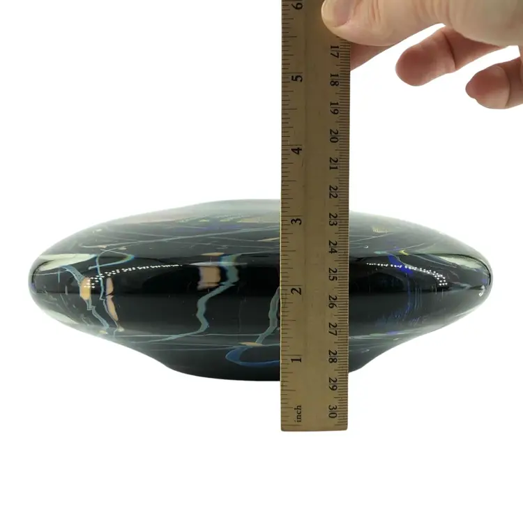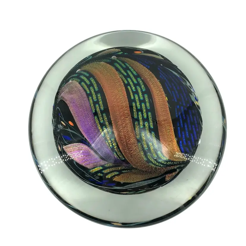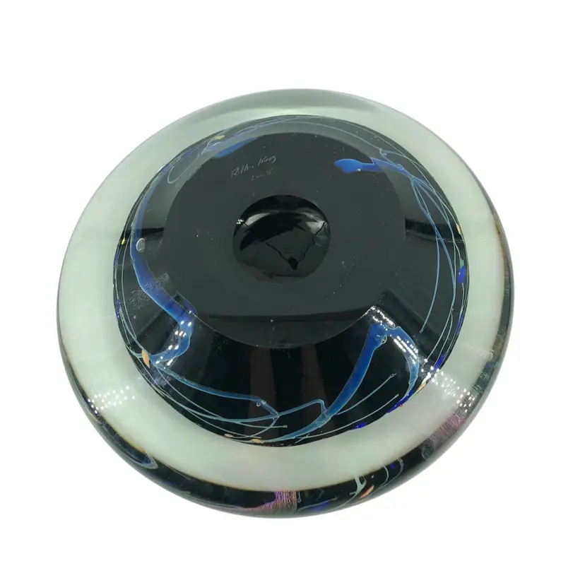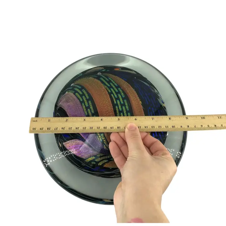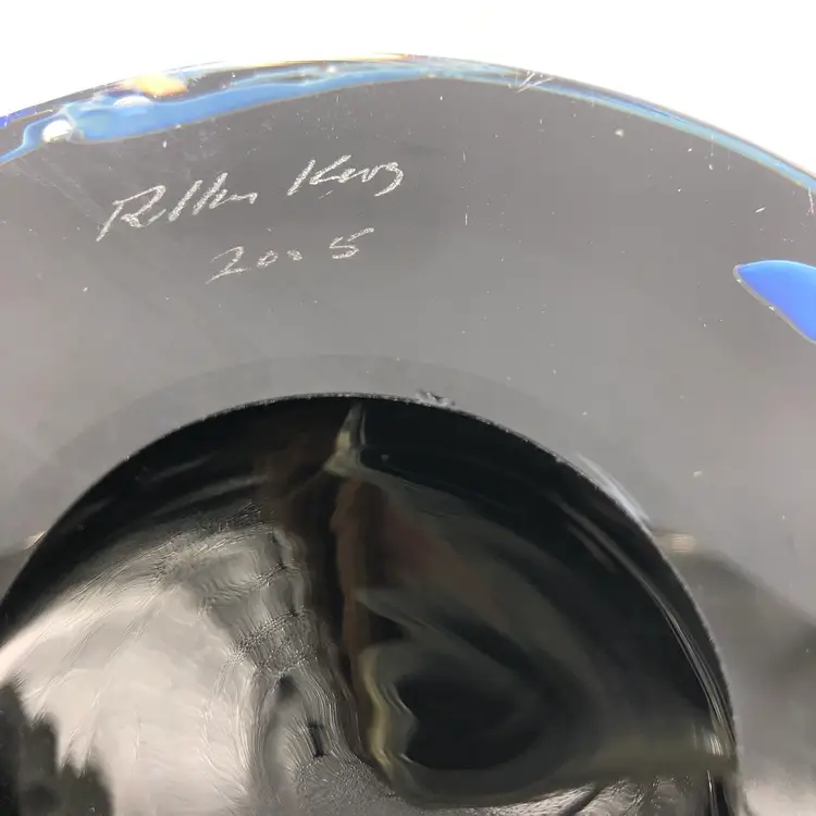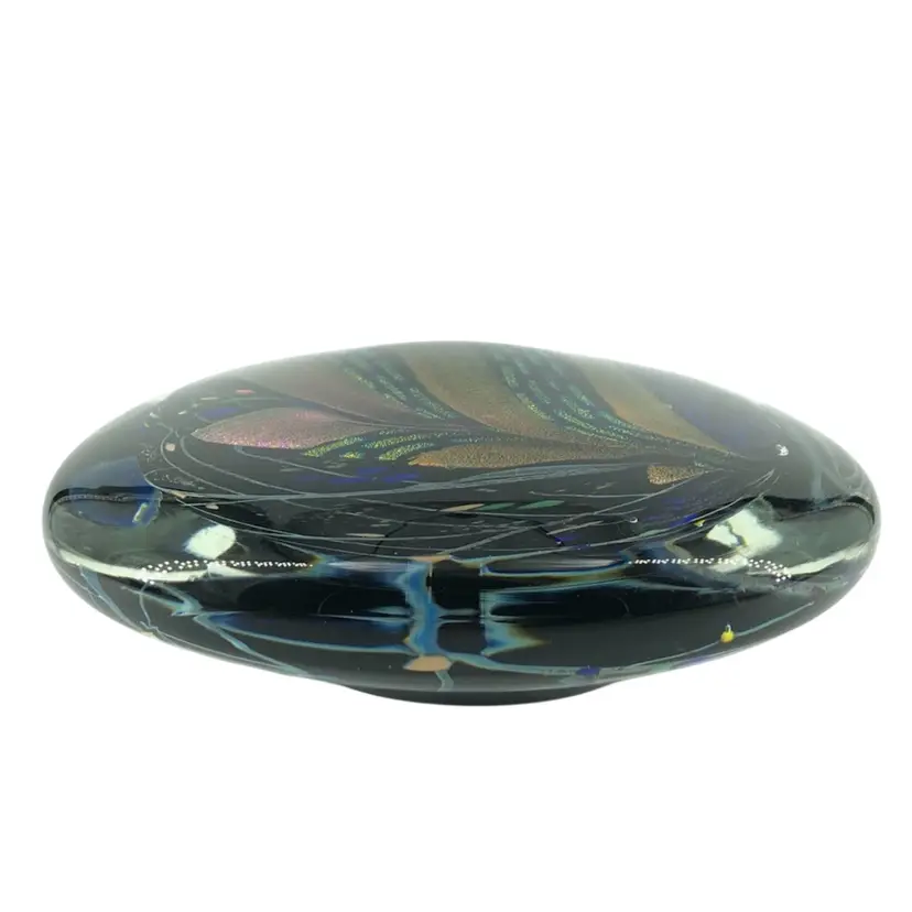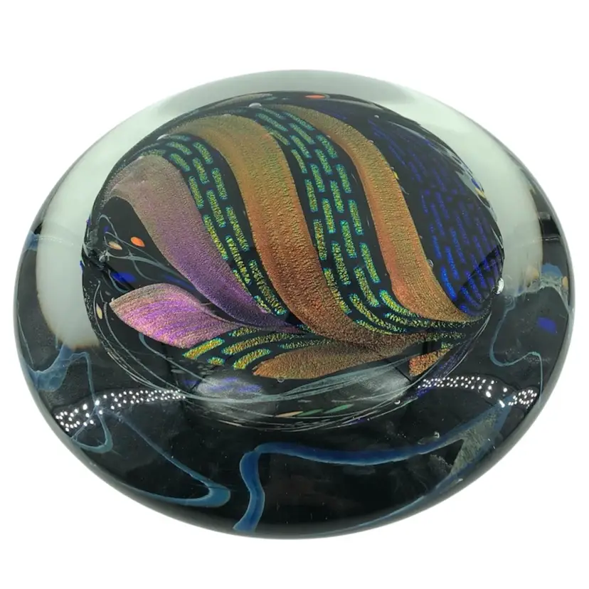 Rollin Karg Dichroic Art Glass Sculpture Paperweight is approximately 9.5” wide. There is some scratches and chips can be seen in photos. Is signed “ Rollin Karg 2005”. There are no cracks. Height is approximately 4”.