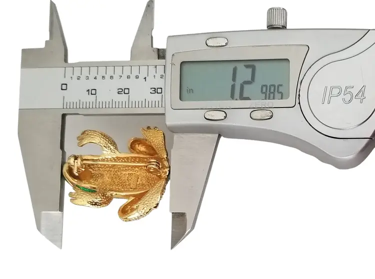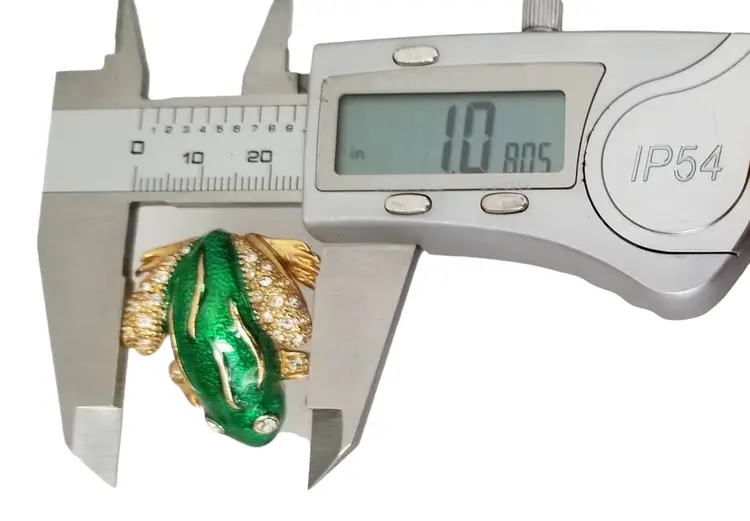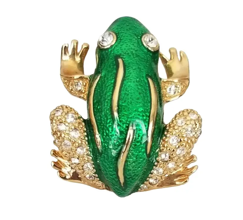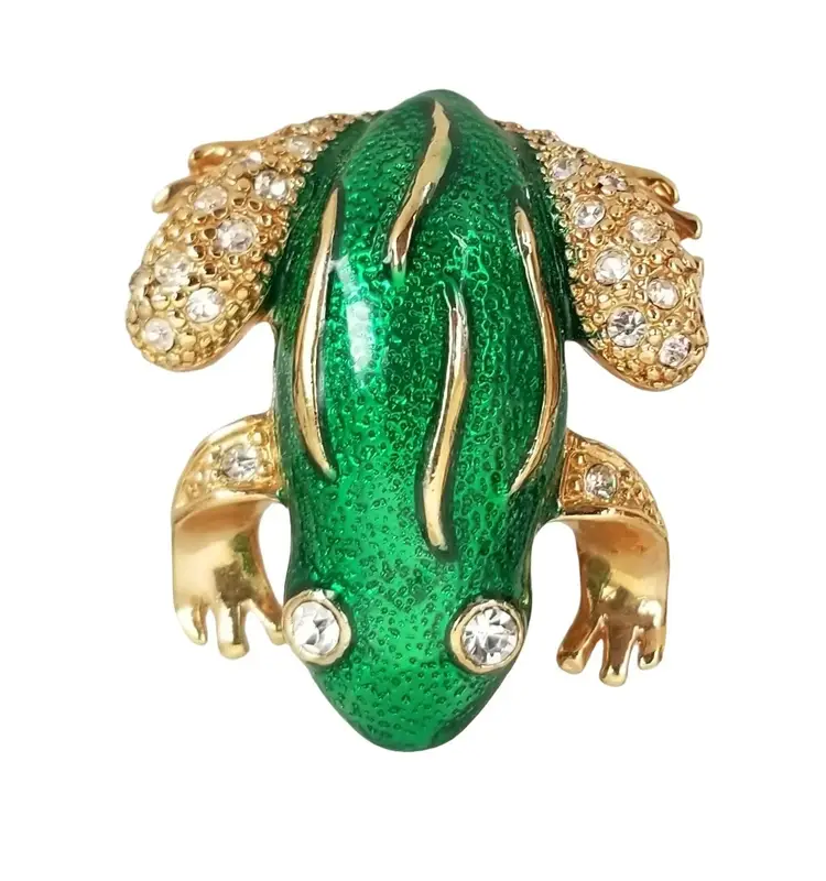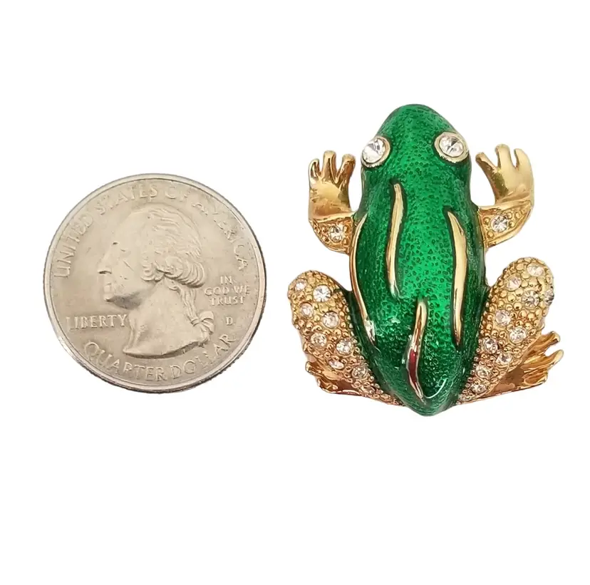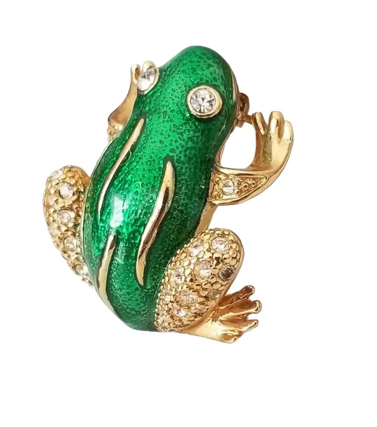The brooch features a whimsical frog design with green enamel detailing, which adds a touch of elegance and sophistication to the piece. The rhinestones on the frog's body give it a glittering effect making it looks perfect for everyday use or casual and formal event. This brooch pin measures approximately 1 inch wide and 1.2 inches high. The back is marked ROMAN, finished with a secure locking pin that functions properly.