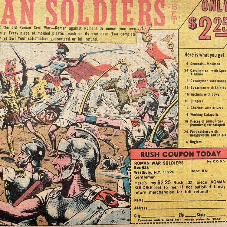 Roman Soldiers Set Army Men Toys Print Ad Civil War Battle Scene Vintage 1970s Framable Advertisement (Ad Only, No Toys Included) 132 Piece Roman Soldiers 2 Complete Roman Armies Fight again the battles of the old Roman Civil War – Romand against Roman! Or mount your own attack against a town or city. Every piece of molded plastic – each on its own base. The set included mounted generals, cavalrymen with spears and armor, spearmen with shields, archers with bows, slingers, chariots with drivers, working catapults, ammunition, foot soldiers and buglers Condition: Ad Only, No Toys Included. The paper is toned, discolored, brown. Marks and sports in the white border. Measures 10-1/4 inches x 6-1/2 inches Packaged in a plastic sleeve inside a rigid envelope Visit my store to see more vintage ephemera, advertising, novelties, gifts, estate sale and yard sale finds https://district.net/u/finderspickerspaper SKU B16