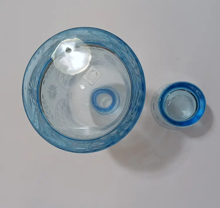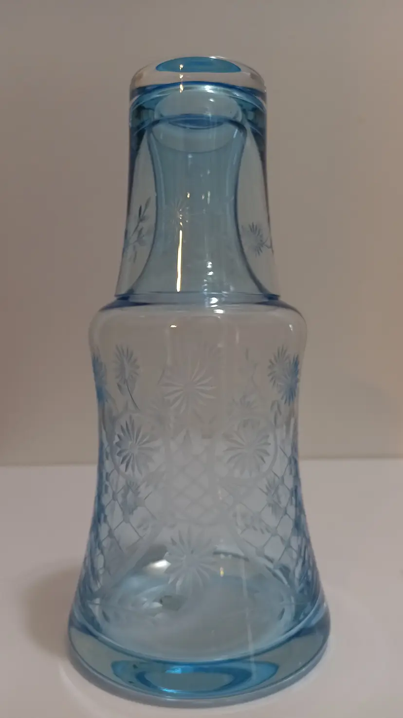 Gorgeous Romanian Glass Tumble Up; Pretty Little Etched Flowers Embody this Exquisite Creation; Sticker on Bottom Reads Made in Romania; Very nice Condition; No Chips or Cracks! 9"T x 4"W