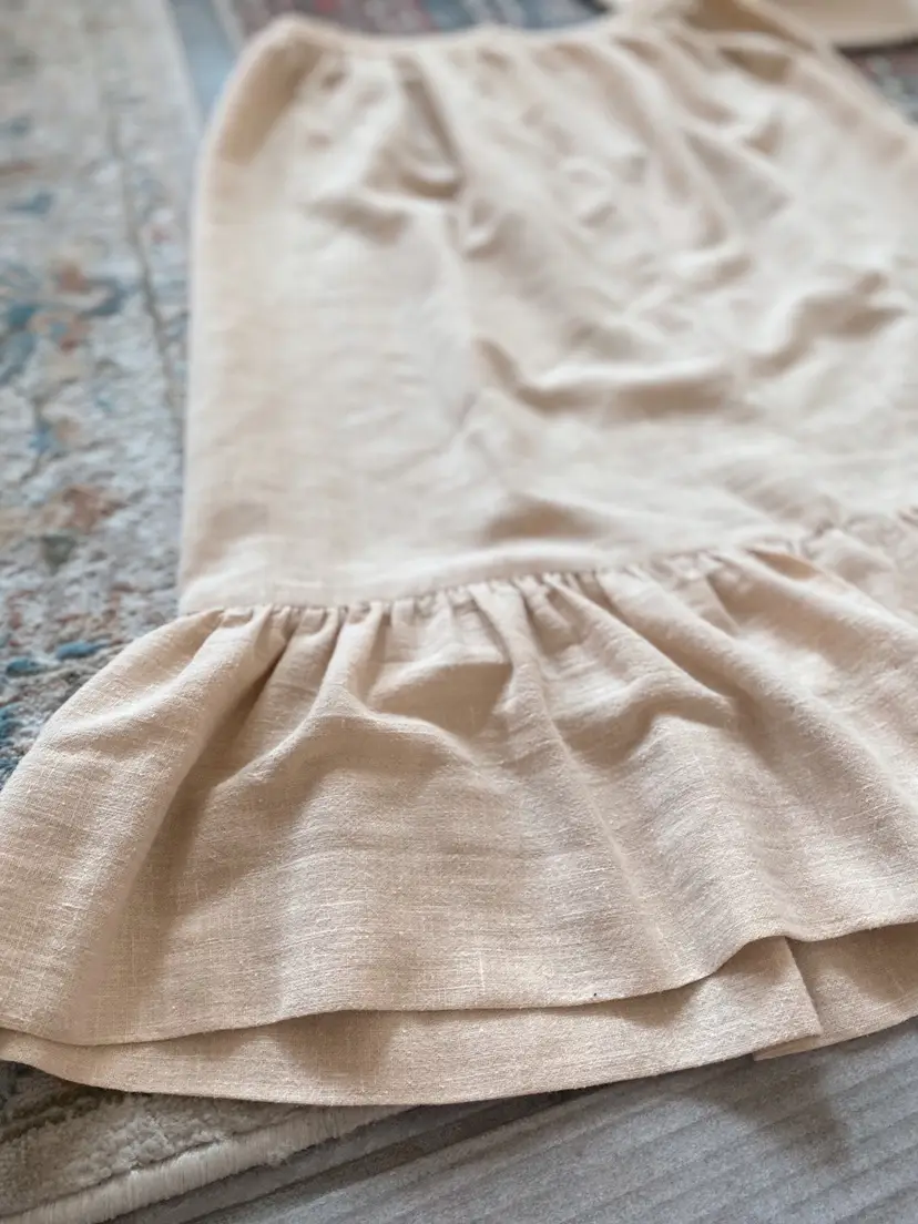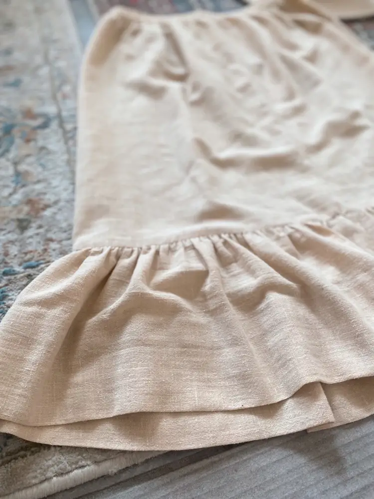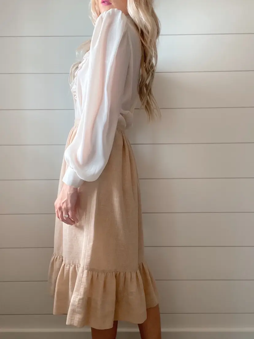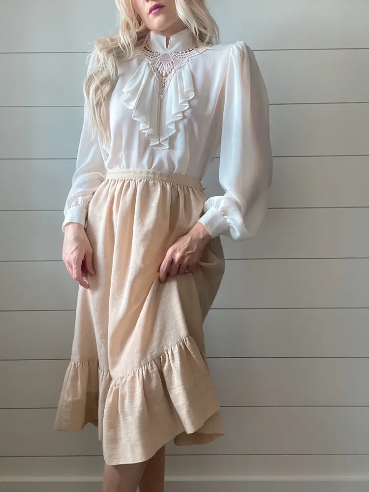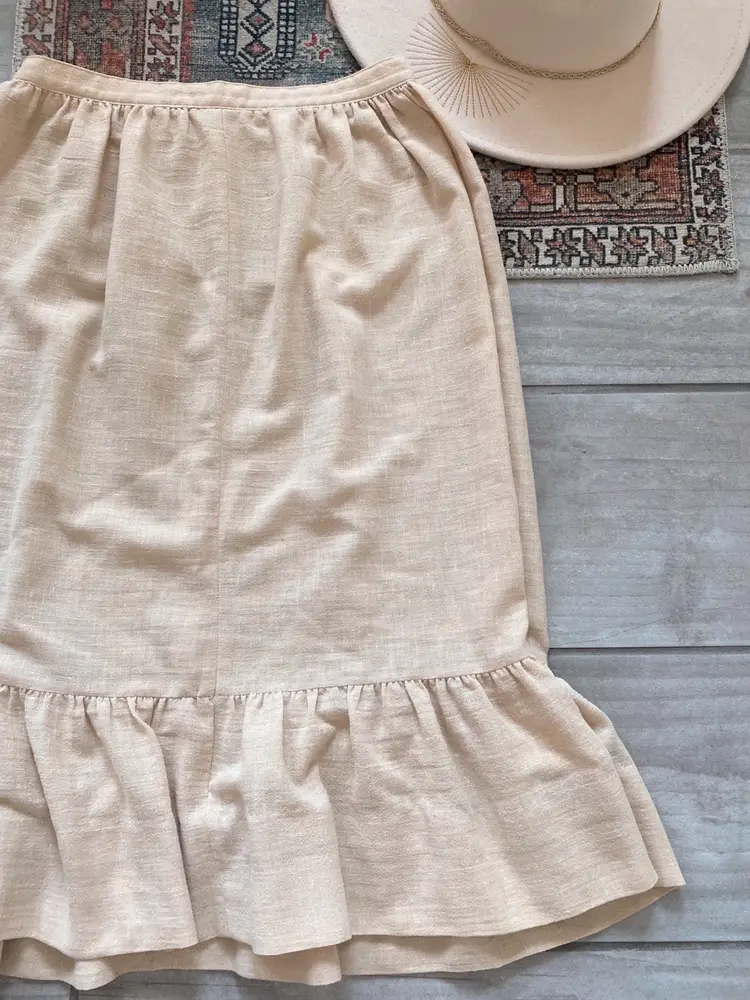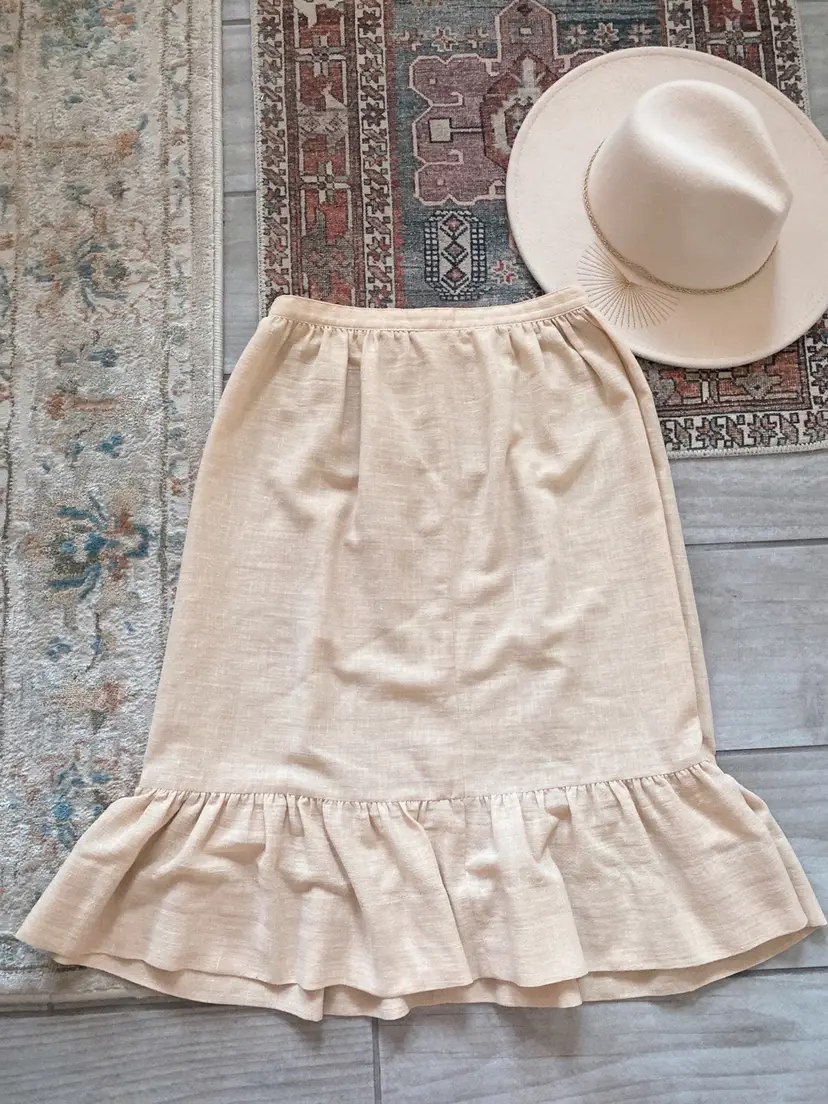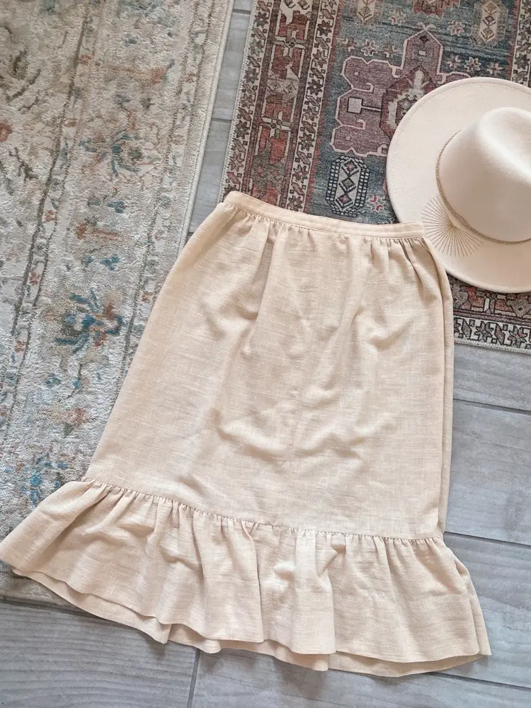 Vintage Romantic Cotton Ruffled Skirt ✨ This pretty neutral toned skirt is a lightweight cotton and is unlined. It has a bottom ruffle and the silhouette is formfitting, yet flowy.
