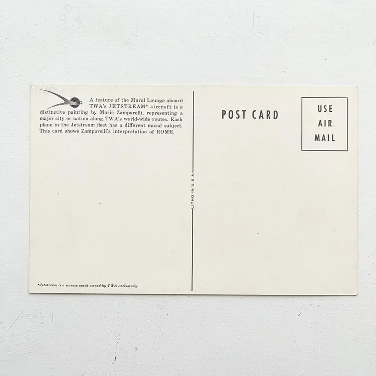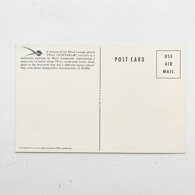 Rome Vatican City Italy Postcard Pretty Girl TWA Airlines Advertising 1970s A feature of the Mural Lounge aboard TWA's Jetstream aircraft is a distinctive painting by Maric Zamparelli, representing a major city or nation along TWA's world-wide routes Each plane in the Jetstream fleet has a different mural subject This card shows Zamparelli's interpretation of Rome Pretty Italian Girl Woman standing by fountain Litho in USA Condition: Unused. Wear on the corners. Measures 5-1/2 inches x 3-1/2 inches Packaged in a plastic sleeve inside a rigid envelope Visit my store to see more vintage ephemera, advertising, novelties, gifts, estate sale and yard sale finds https://district.net/u/finderspickerspaper SKU B10