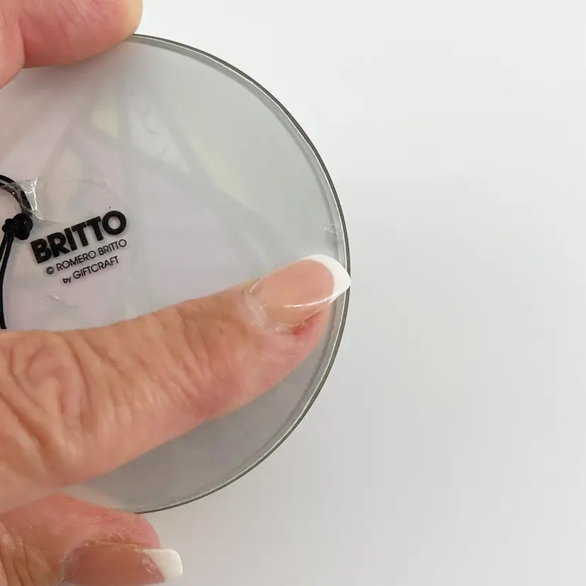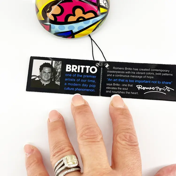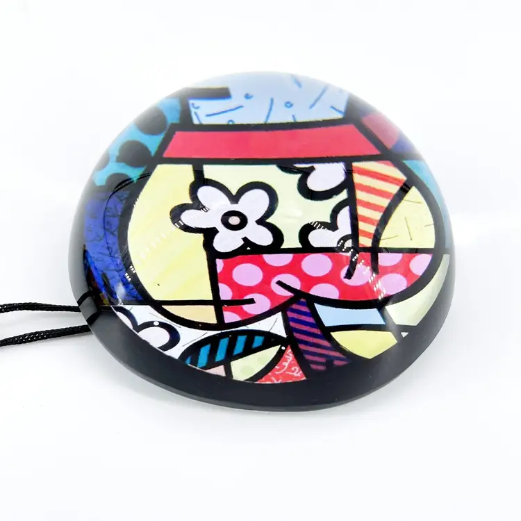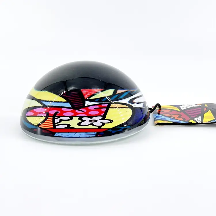 This glass dome paperweight was made in 2009 and designed by Romero Britto for Giftcraft and is part of his Glass Icon Apple collection. It is 1.5" tall and 3" in diameter and is in excellent condition. There is a bubble on the bottom under the flat base, manufacturing defect.
