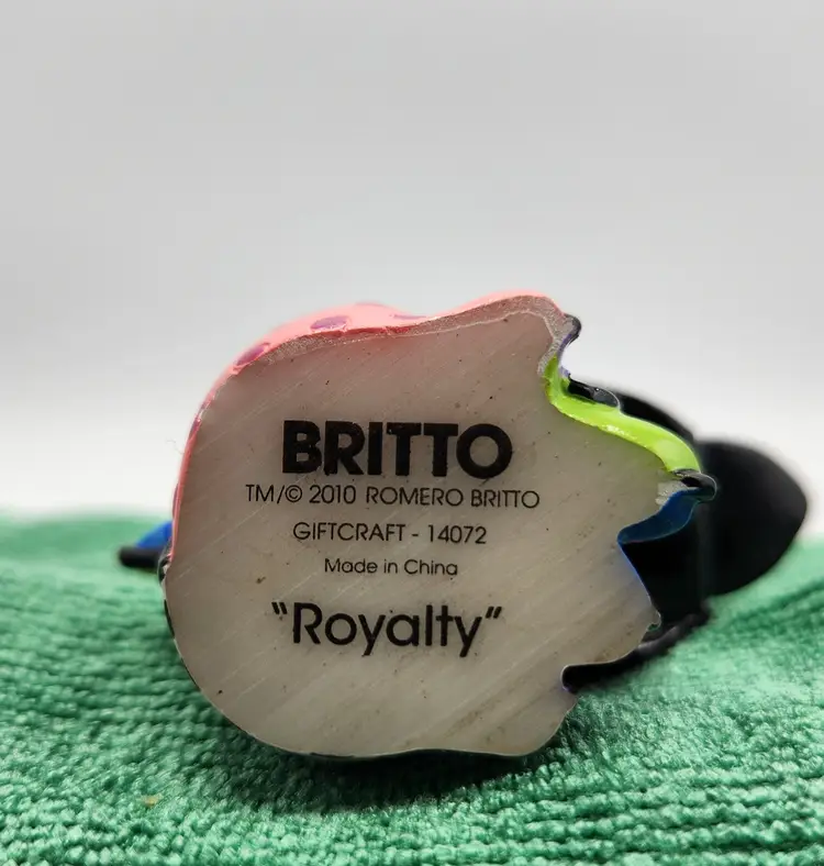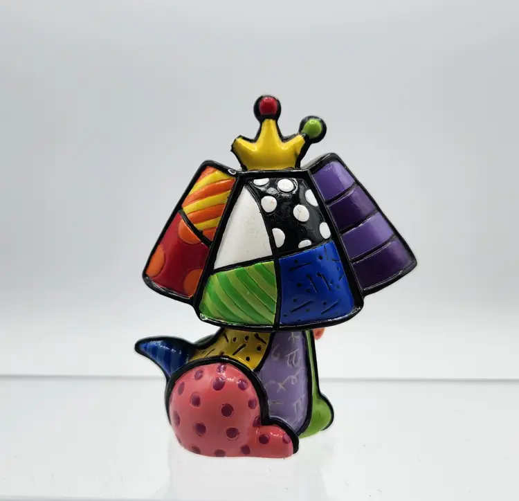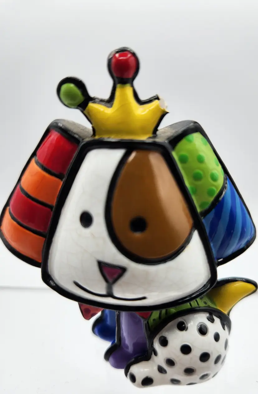 2010 Romero Britto "Royalty" Colorful dog with crown. Is missing a "jewel". Has some crazing. 2.5" H