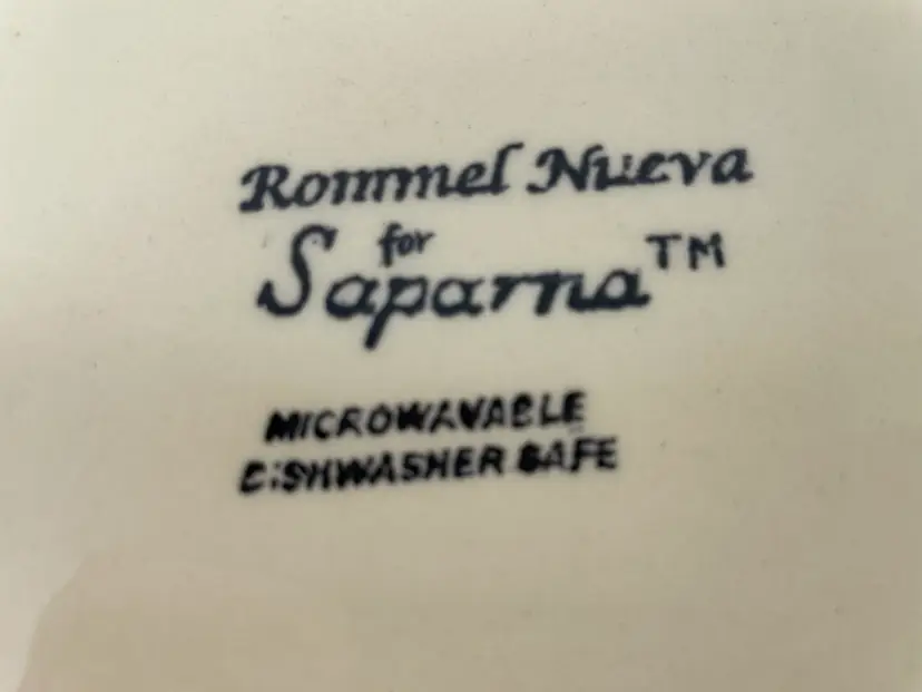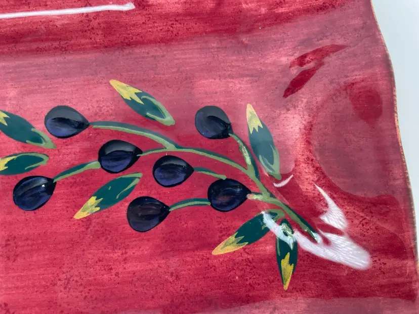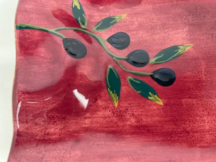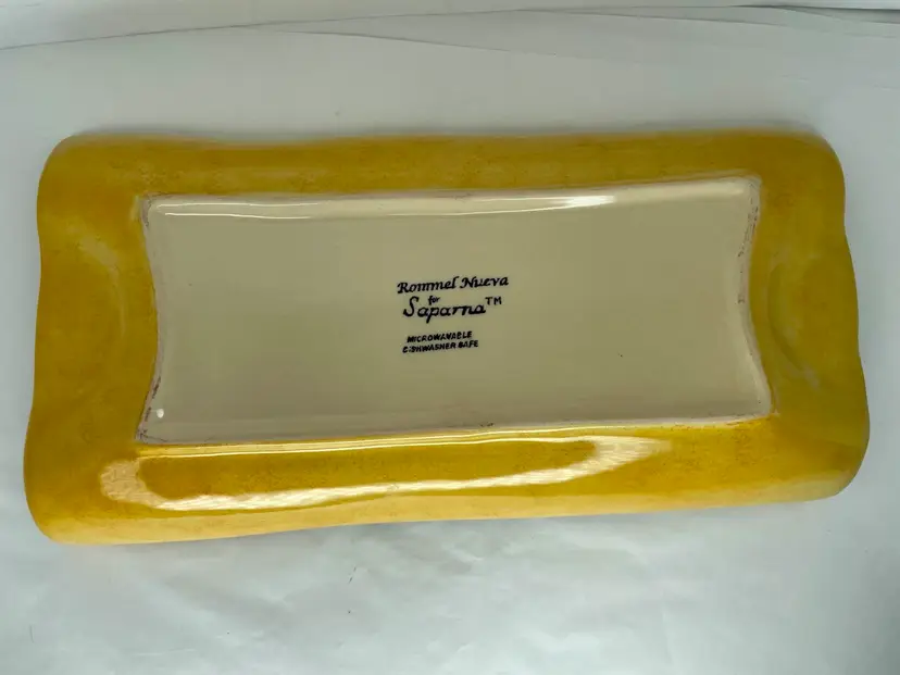 The Rommel Nueva for Saparna serving tray is a vintage ceramic piece, featuring a retro design with a multicolor pattern of olives. Measuring 14.25 inches in length and 7 inches in width, the rectangular tray has a glossy finish and a height of 1.75 inches. It is microwave and dishwasher safe, making it practical for serving a variety of foods. This original piece from the 1990s is perfect for serving charcuterie or other delicious treats in a stylish and food-themed manner.