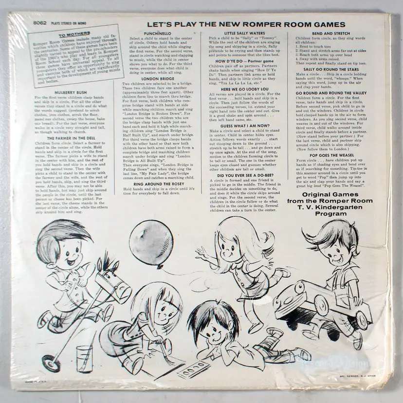 Romper Room Games include many old favorites which children have enjoyed through the centuries. Some of theses games have been slightly varied to appeal the pre-schoolers of the 1960's who play and learn in Romper room School each day. For all the youngsters these games have universal appeal. To all youngsters they offer an opportunity to sing and exercise both of which are significantly important to the development of young minds and bodies.