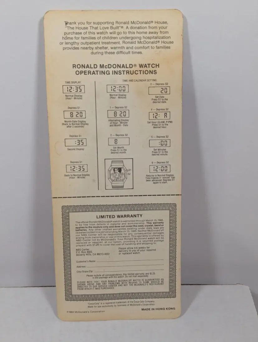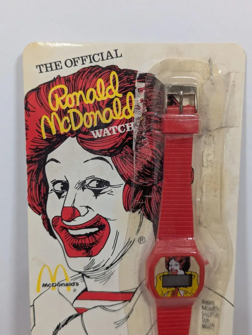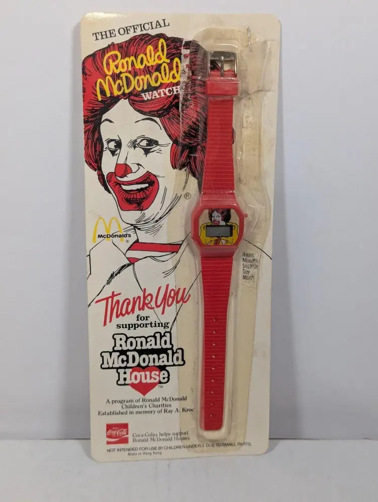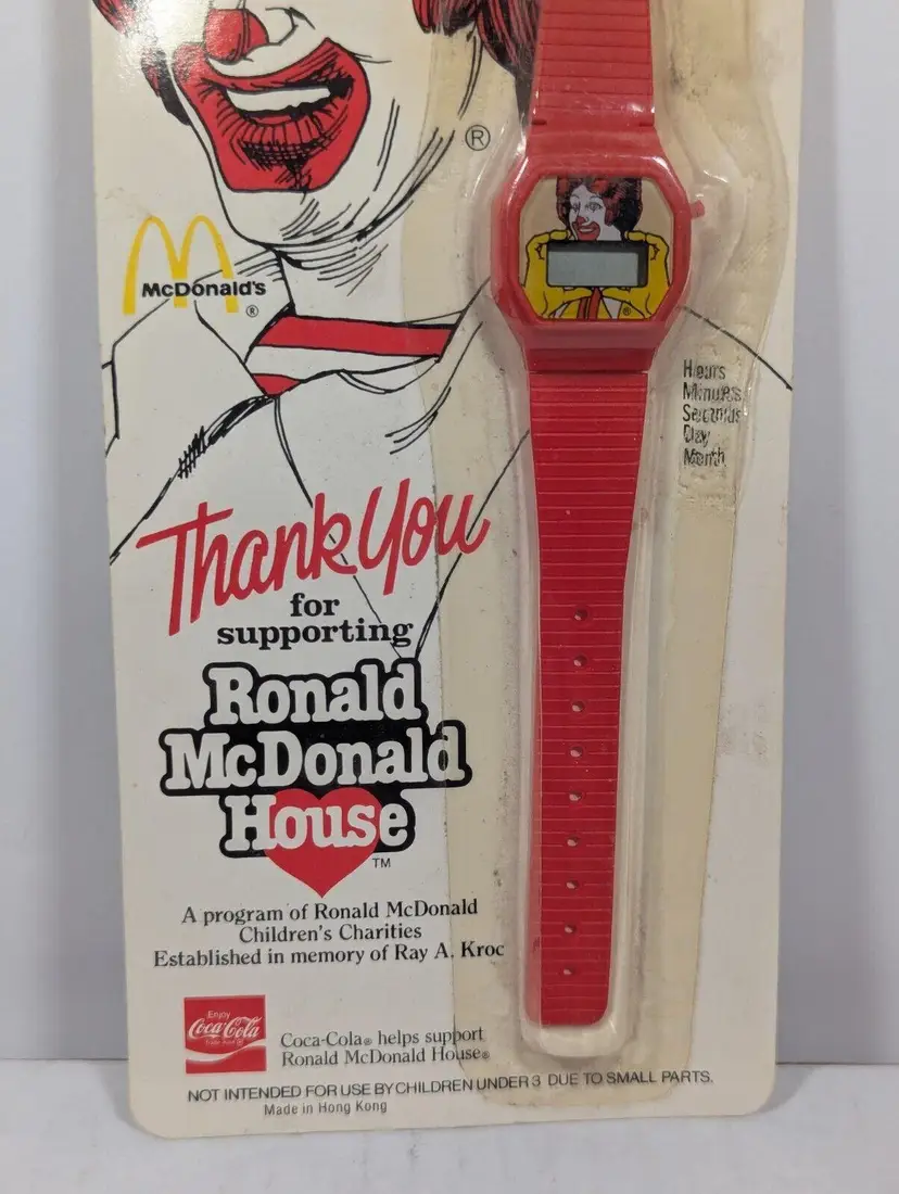 This is a rare and collectible Ronald McDonald watch from 1984, created in partnership with Coca-Cola to support the Ronald McDonald House. The watch features a red design with the iconic McDonald's logo and is an original piece. It is a perfect addition to any advertising or McDonald's collection, as well as a unique gift for fans of the brand. The watch is in good condition and is ready to be displayed or worn. The plastic packaging is showing some fading and the top shows some separation and has been taped.