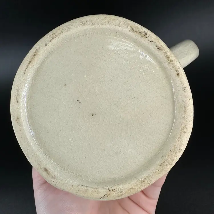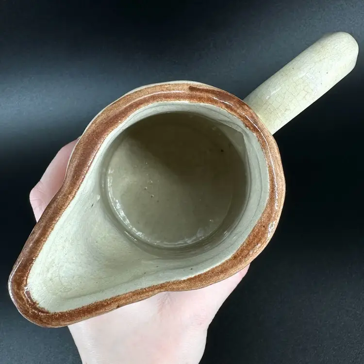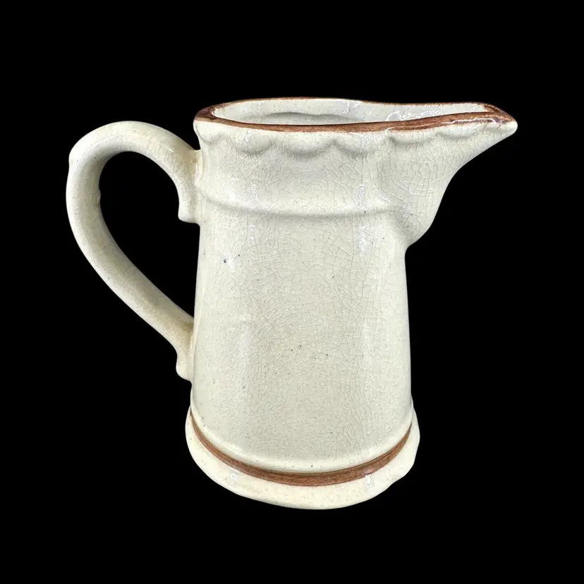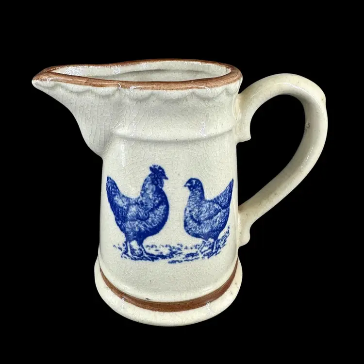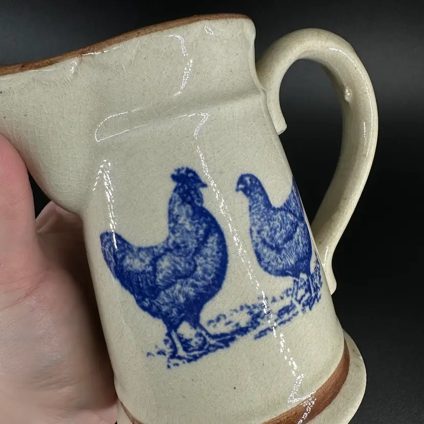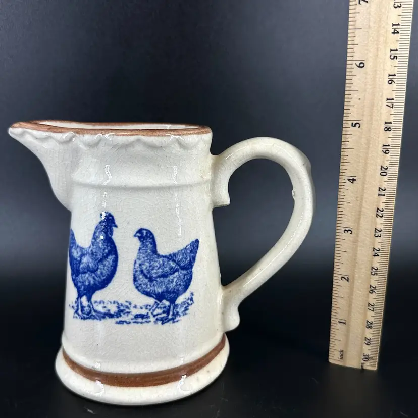 Country style decor pitcher made of stoneware. Features printed blue rooster and hen. No chipping in pitcher. There is crazing in the glaze all throughout. No signatures or markings. Pitcher measures approximately 5” tall.