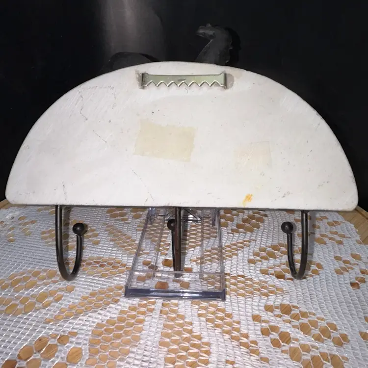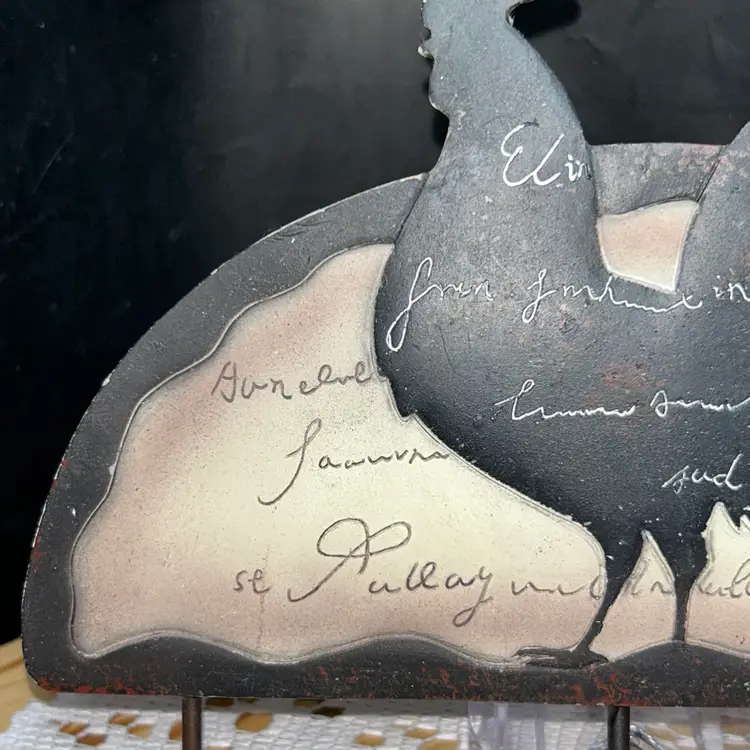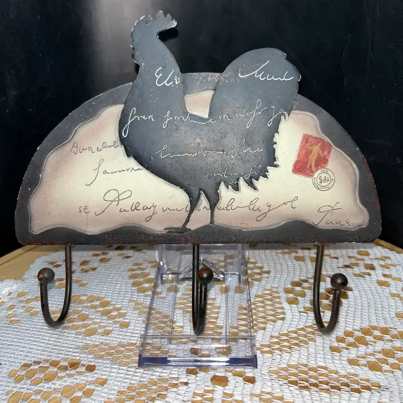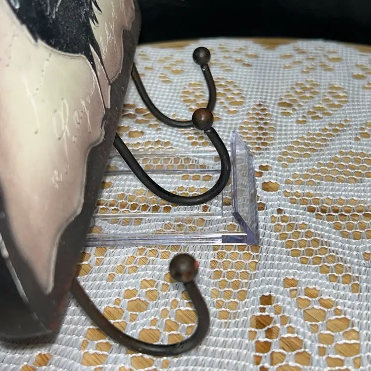 Decorative top is 7.25” wide, and 5” tall. Hooks drop1.75” before bending upwards. Sawtooth hanger on back. Made of resin.