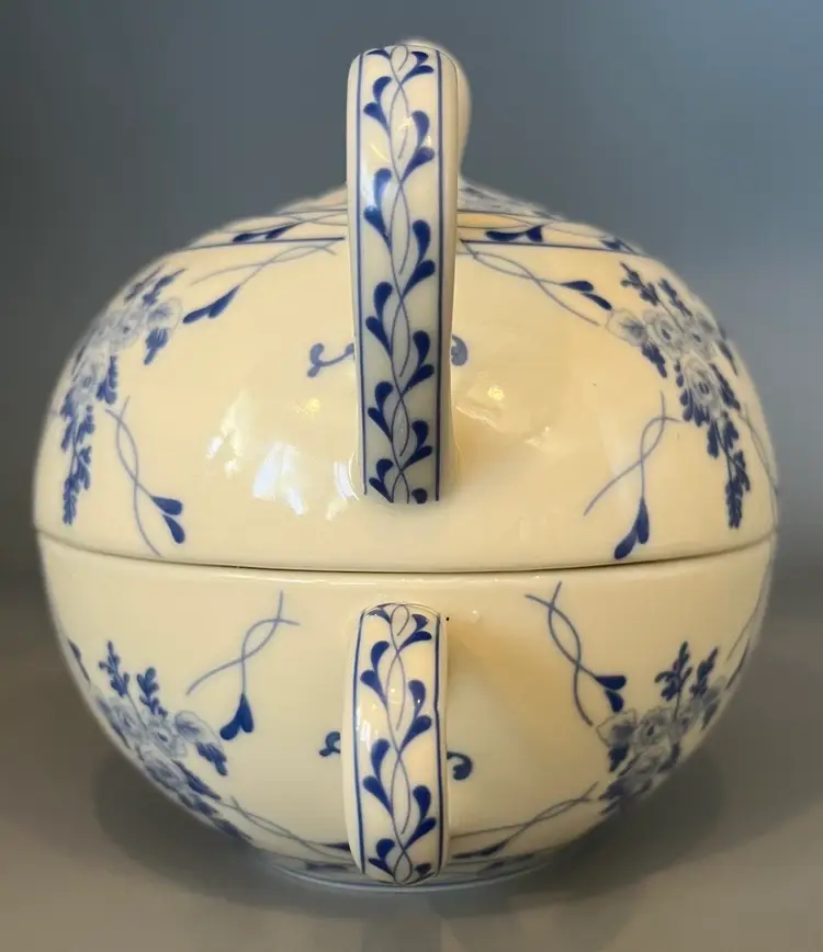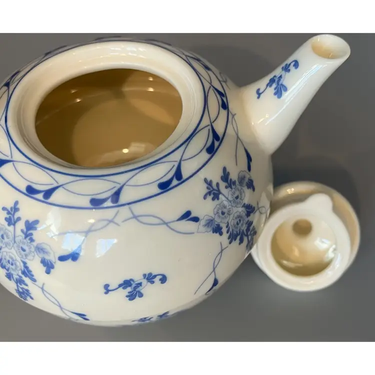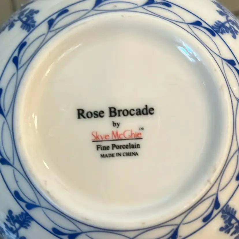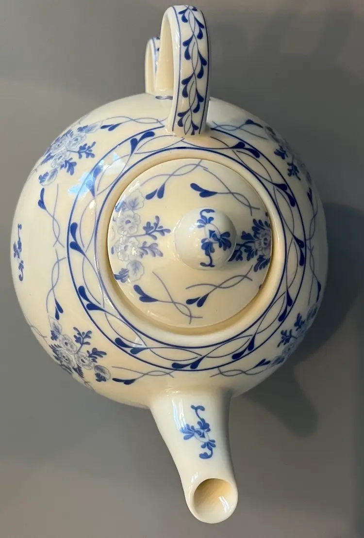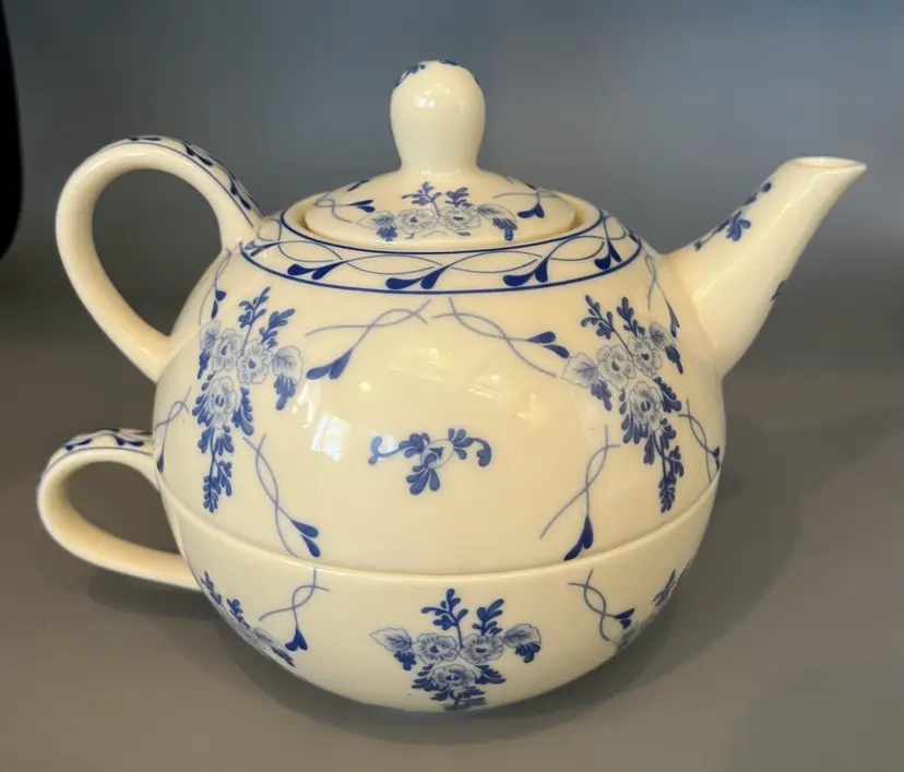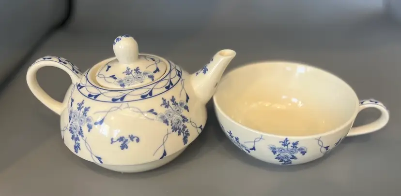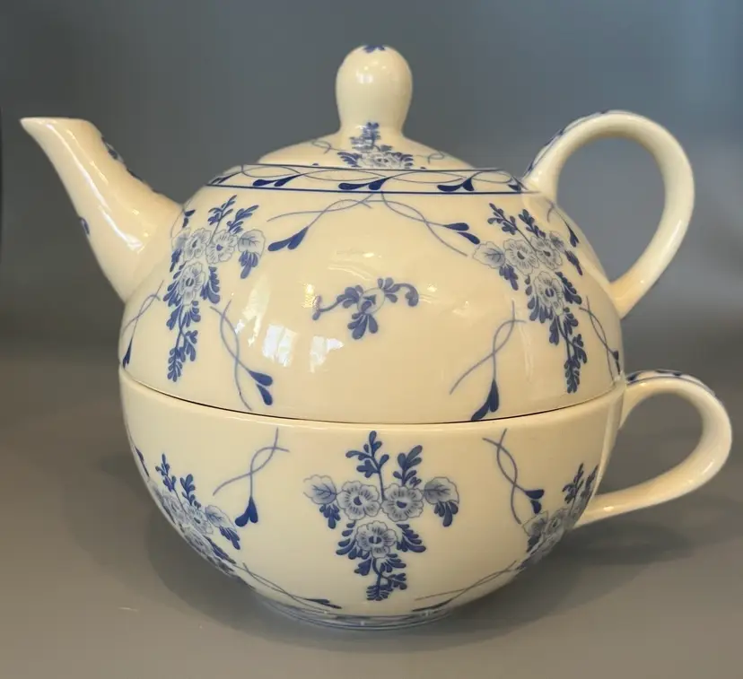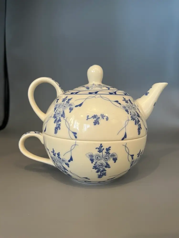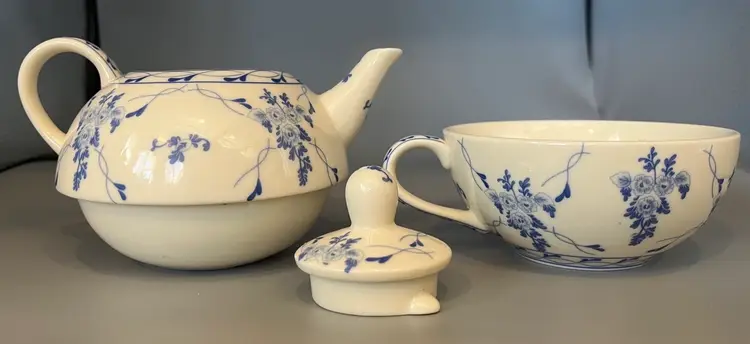 Vintage Rose Brocade Fine Porcelain Blue & Cream Tea For One Lidded Teapot with Cup by Skye McGhie