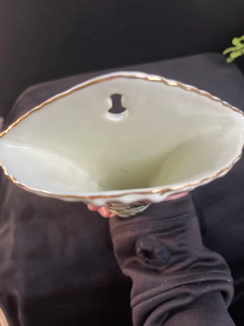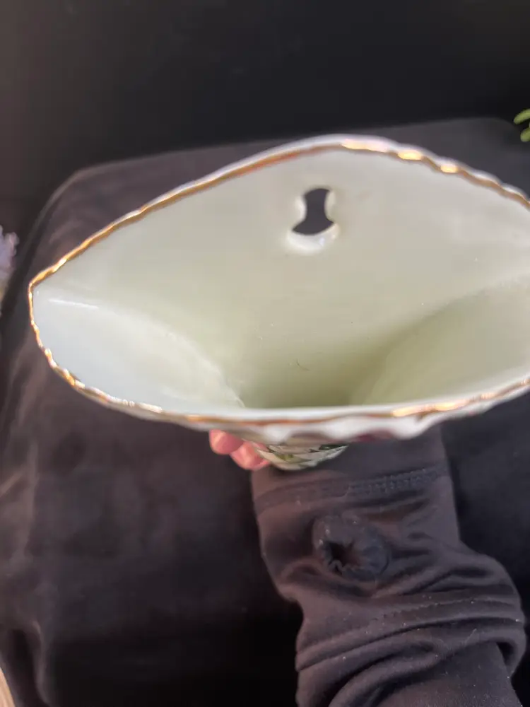 Beautiful roses, leaves and vines-Gold paint accents on rim. This is really pretty and would add pop to any gallery wall! This is in excellent vintage condition. No chips, cracks or call outs. It measures approx 7.5"H, 4.5"W, & 1.5"Deep, 8 Oz