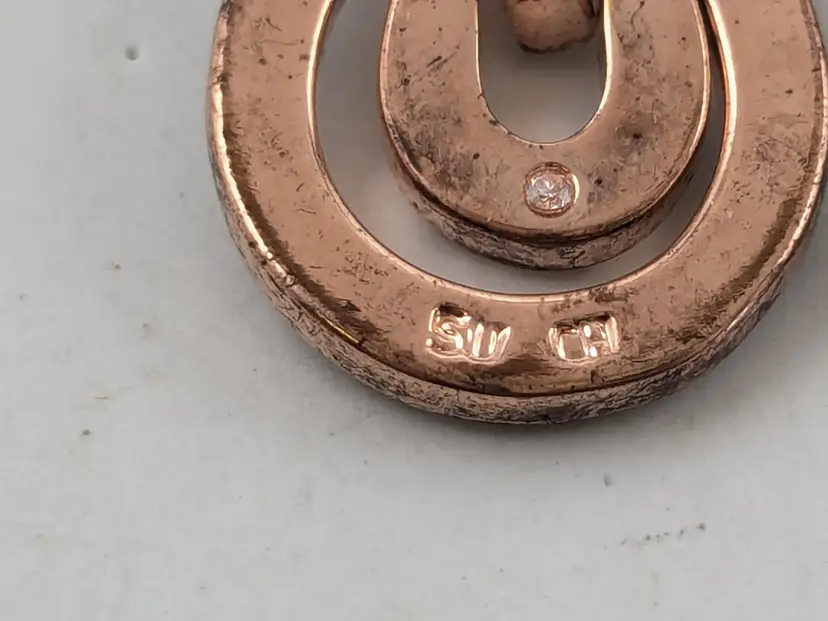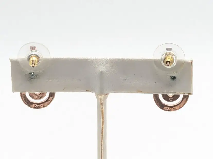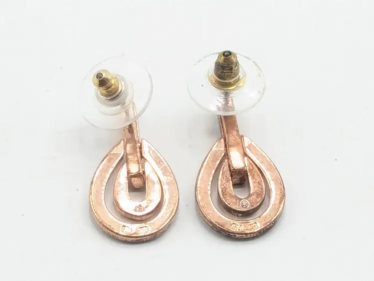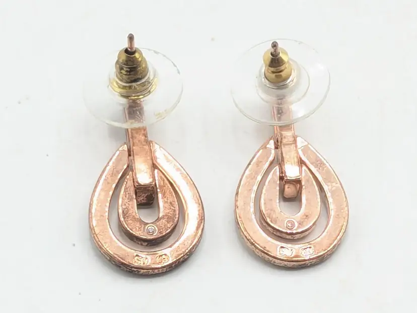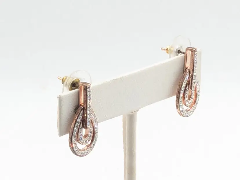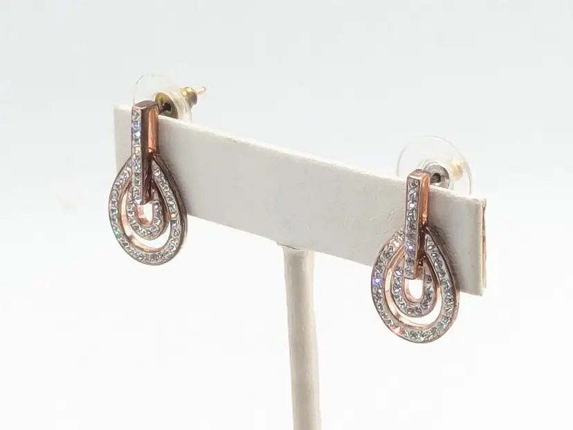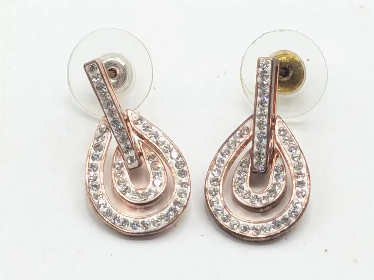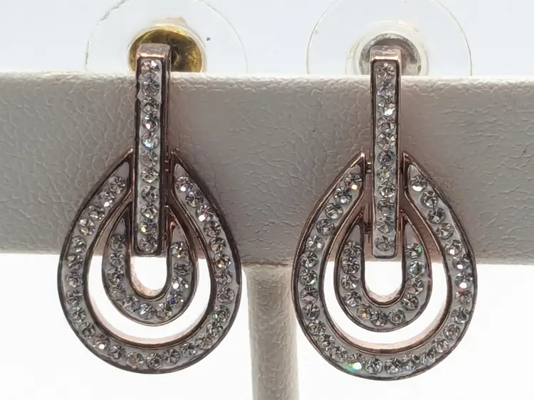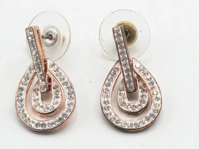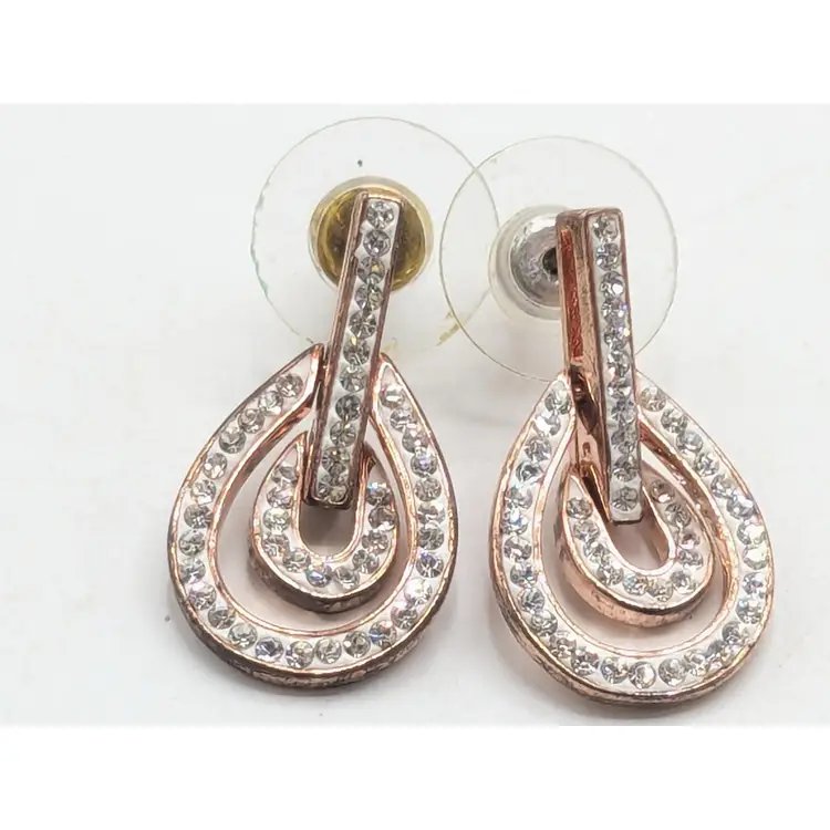 Stylish rose gold tone teardrop earrings adorned with sparkling rhinestones. Perfect for adding a touch of sparkle to any outfit. Measures approximately 1"length and 1/2" wide. (EN2)