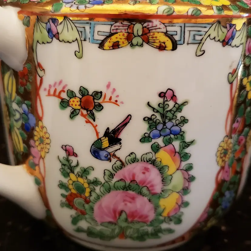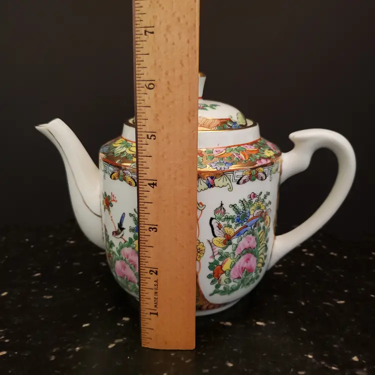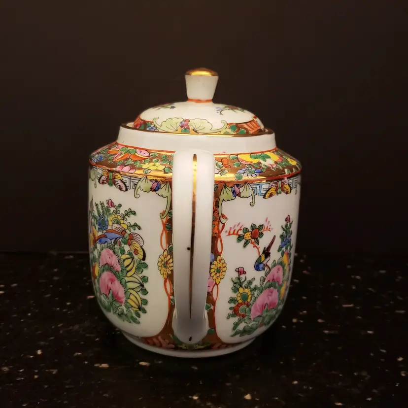 Vintage Chinese porcelain teapot featuring the "Rose Medallion" pattern, characterized by alternating panels of flowers, birds, butterflies, and figures hand-painted motifs with rich gilt accents. Famille Rose Cantonese exported porcelain, produced during the early-to-mid 20th century.