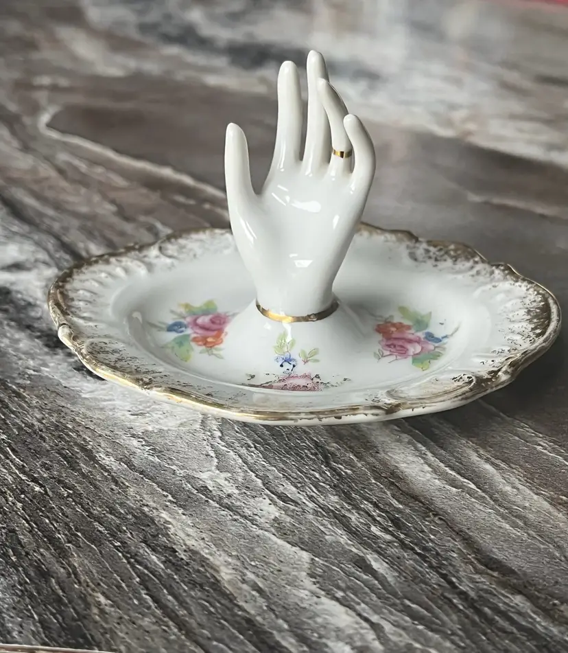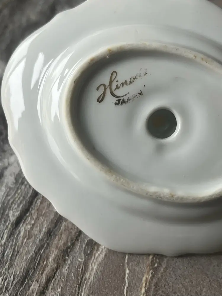 A pretty vintaged ring holder decorated with roses and trimmed with gold. The bottom is marked with a name but I can only read Hin and Japan. Approximately 4 inches wide and 2 3/4 inches tall. Some rubbing on the gold and one of the roses. Free of any nics and such.