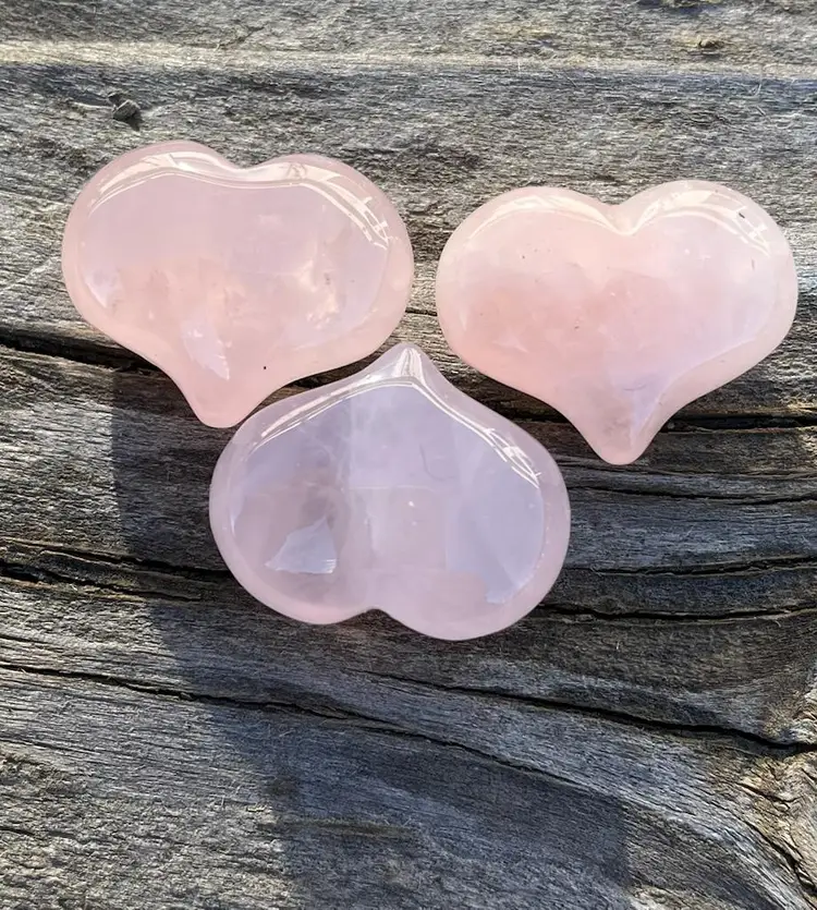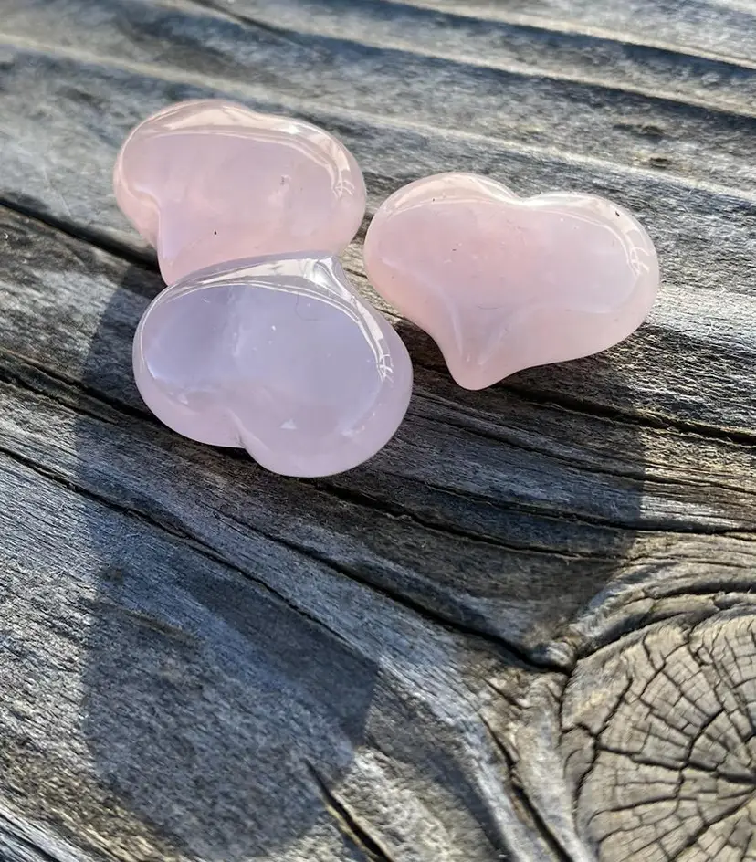 Pretty Rose Quartz Hearts that are perfect for tucking into a Valentines Day card, 30 grams for the three. Approximately 1/2 inch tall and 1 inch wide. Progressive shipping including all items in my store.