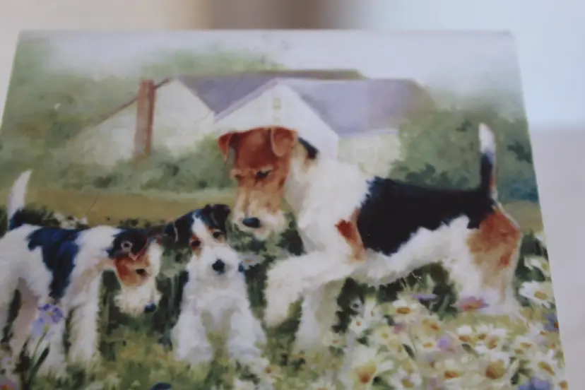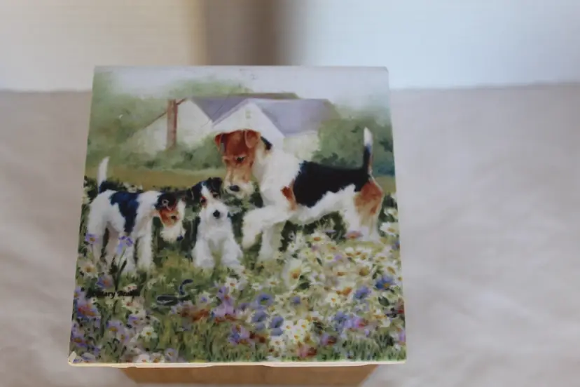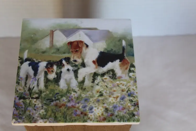 The Rosemary Millette Wire Fox Terrier Ceramic Tile is a collectible item featuring a beautiful ceramic design of a group of three Fox Terriers in a flower field. Made in the United States, this tile showcases the charm and personality of this beloved dog breed. Perfect for dog lovers and collectors alike, this tile adds a touch of whimsy and nostalgia to any space. 4 felt pads are on the underside that could be removed if desired. It measures 4.25 in by 4.25 in weighing 5.1 oz.