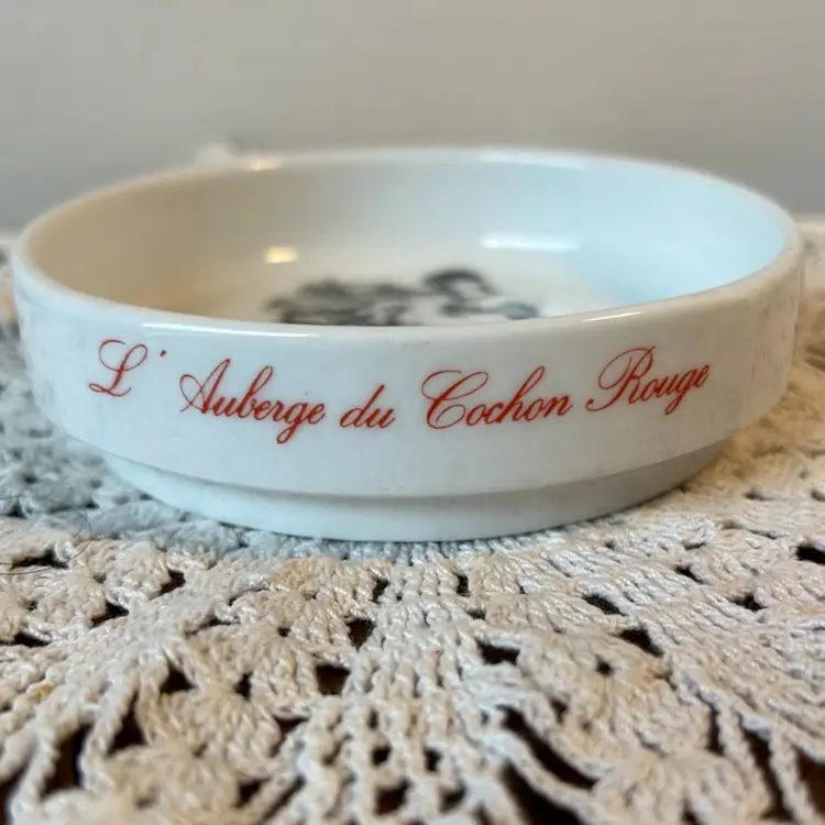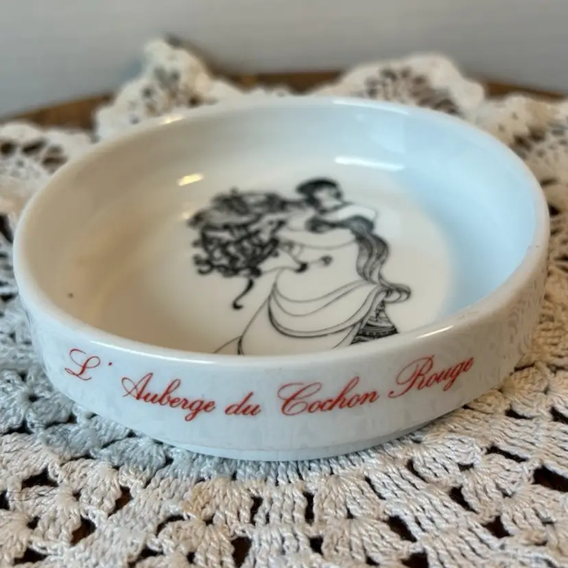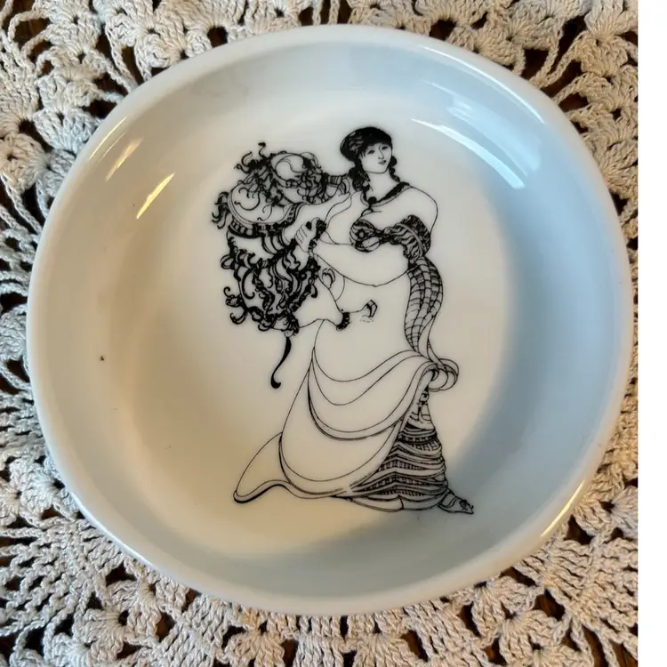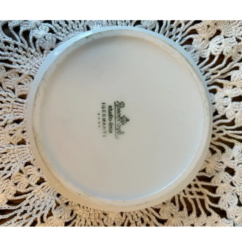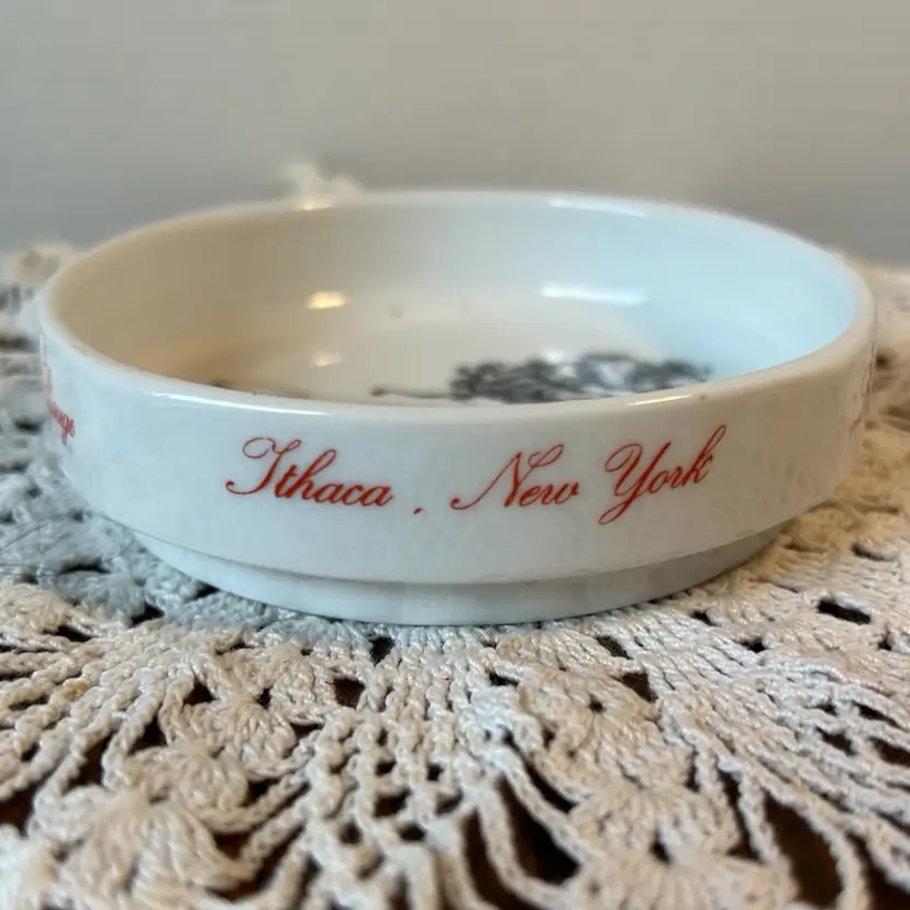 Made out of ceramic and in perfect condition. Only has “shelf wear” on the bottom. Measures 4” in diameter by 1” deep.