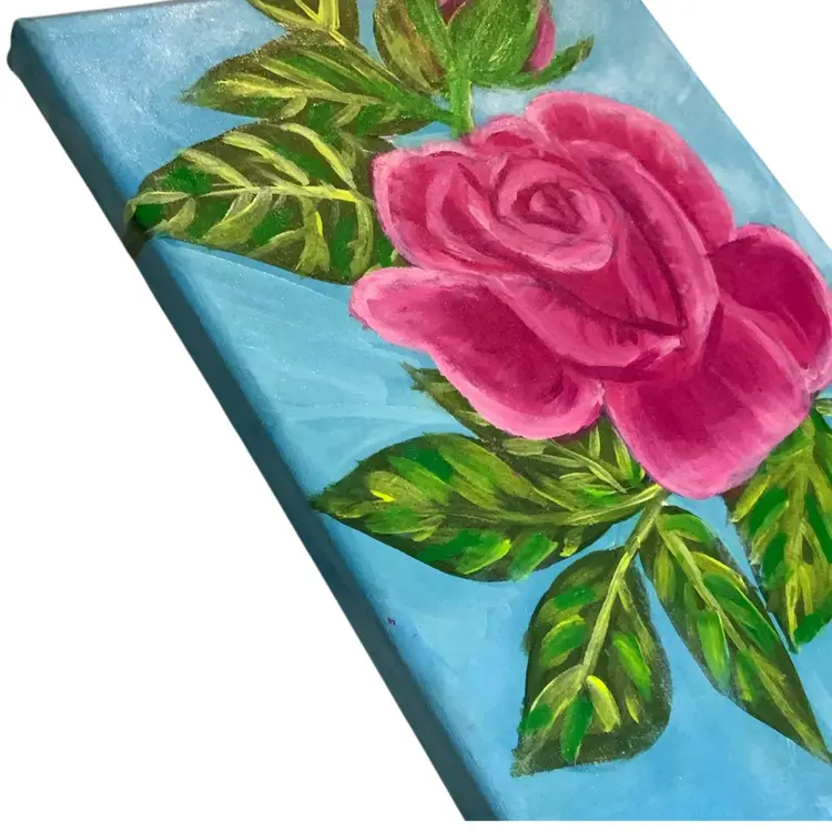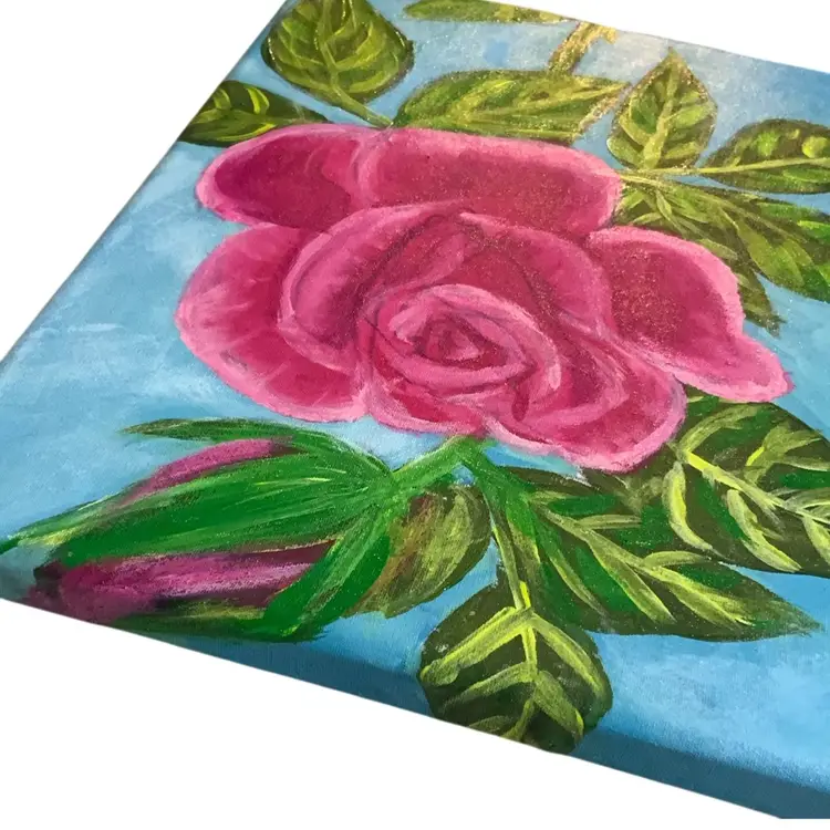 New painting by me for Bloomin Florals on Niknax.net 10” by 8” Acrylic on canvas. This is an acrylic painting of a magenta rose and rosebud with pink and white accents and green leaves against a blue background. A great gift idea for Mother’s Day
