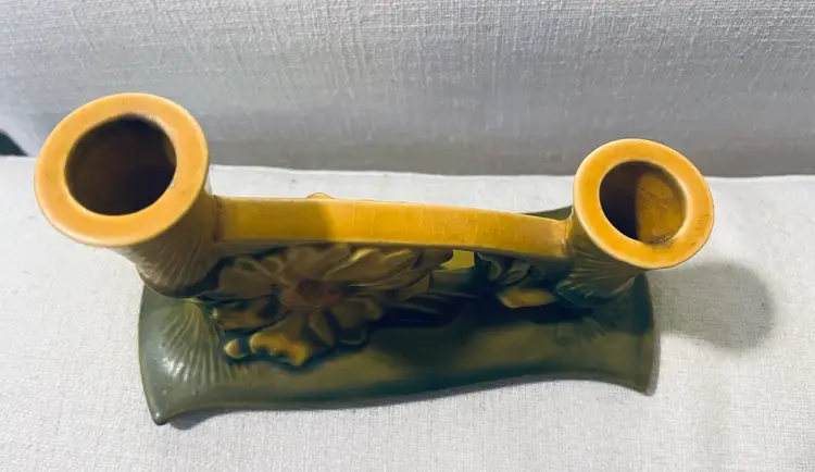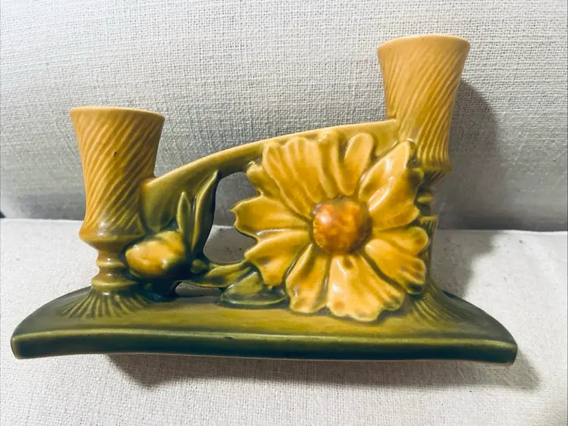 The Roseville Pottery 1153 Peony Candle Holder is a vintage piece of art pottery from the Mid 20th Century. Made in the United States, this multicolor ceramic candle holder features a floral pattern in the shape of peonies. With an impressed backstamp, this original Roseville piece exudes a theme of flowers, floral, and garden aesthetics, making it a charming addition to any decorative pottery and glassware collection. This