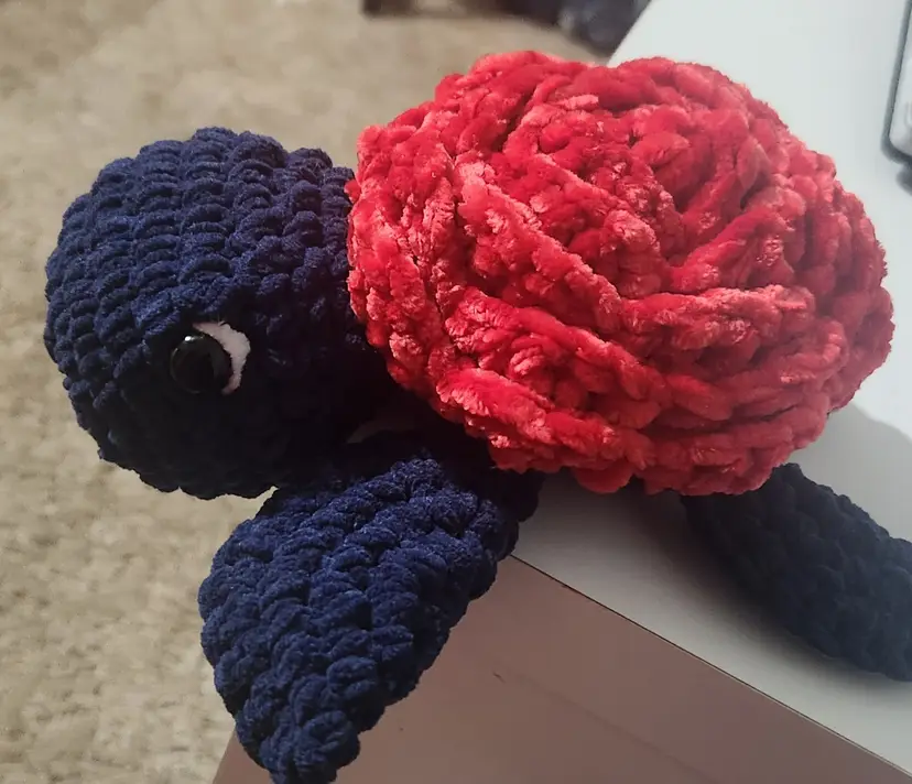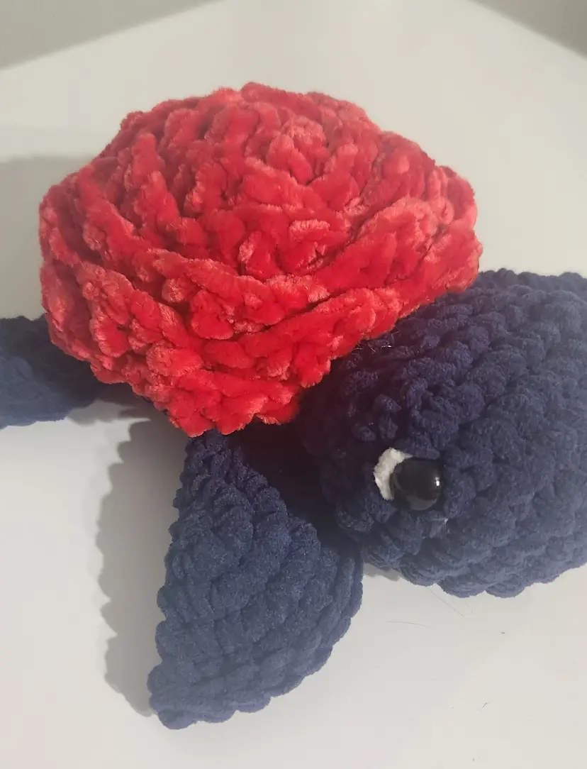 Rosie is a crocheted using chenille yarn. She has a beautiful red rose as her shell. Safety eyes are used for the eyes. Stuffed with fiberfill and made with lots of love.
