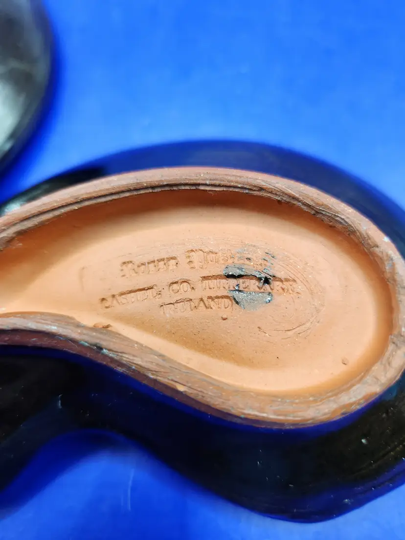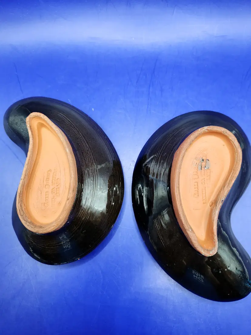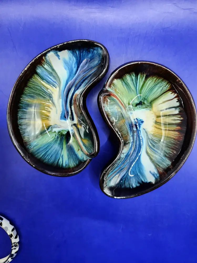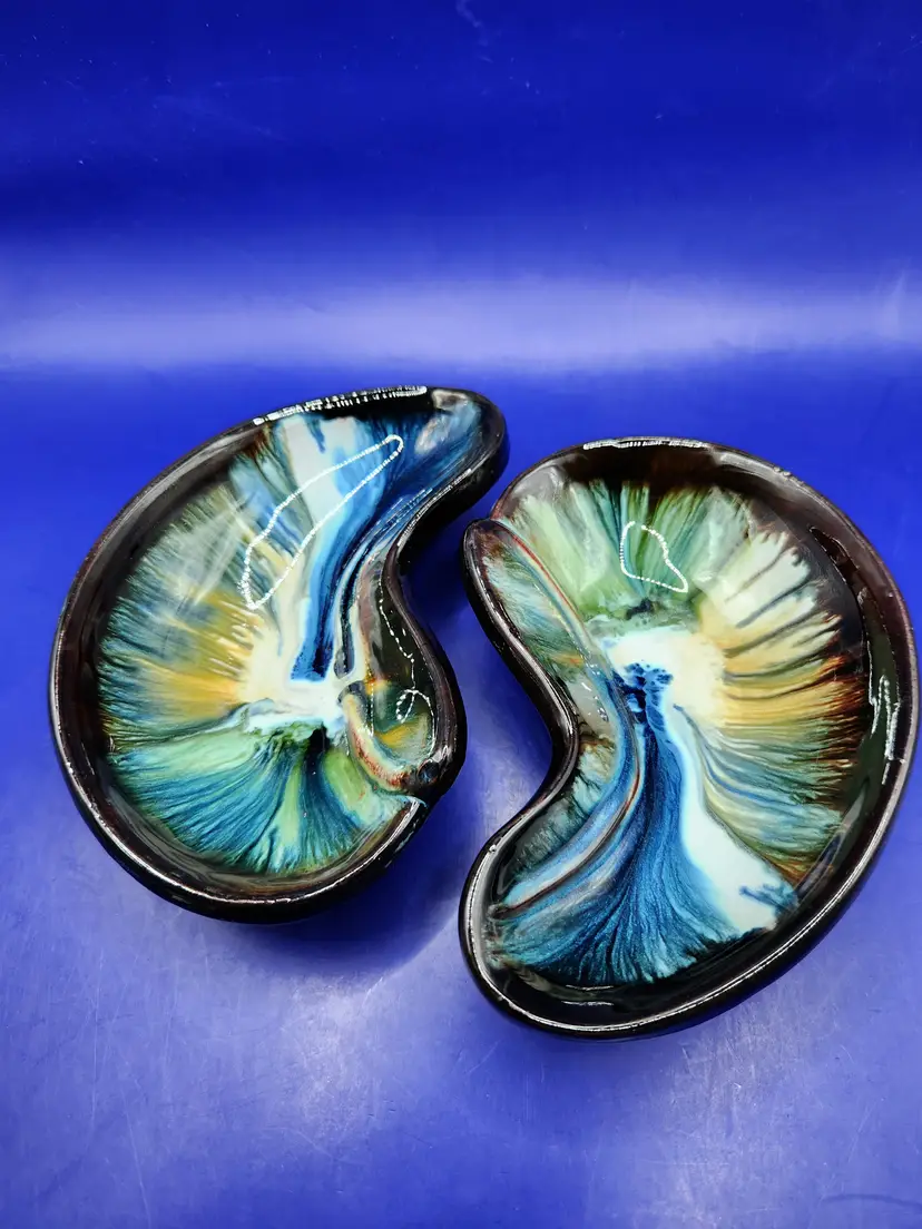 Rossa Pottery Cashel County Tipperary Ireland Oldest handmade pottery shop in Ireland -follow traditional methods - only hands and pottery wheel Pair of 2 Trinket Dishes Redware Beautiful design in green, blue, white and cream on black Bean shaped Each measures 5 inches long by 3 inches at widest