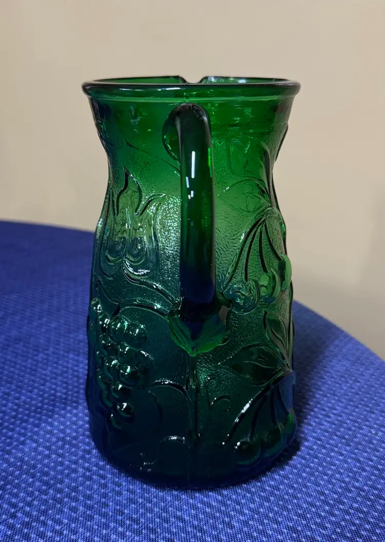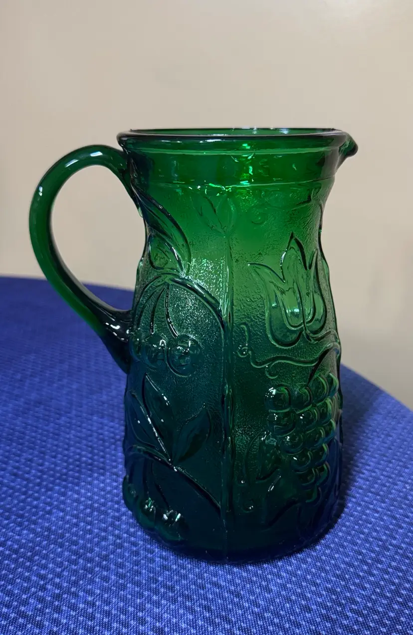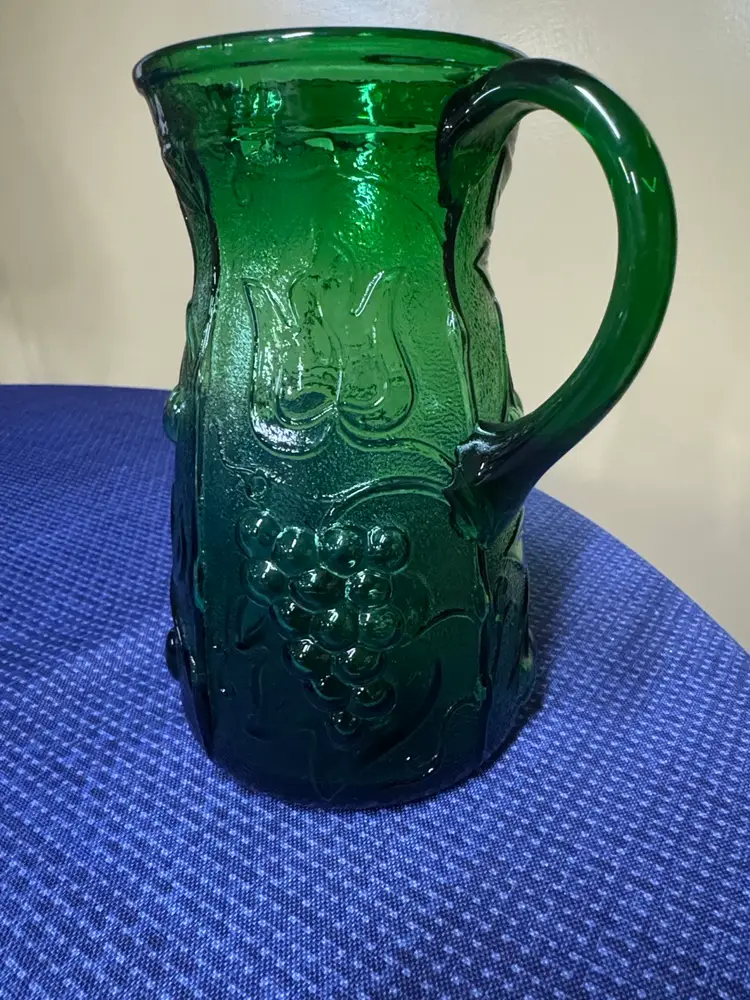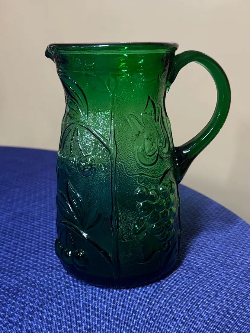 Rossini Empoli Italy Green Glass Pitcher 7.5” tall about 3.75” diameter Elegant green glass pitcher with embossed floral and grape design. Perfect for serving beverages. This vintage Rossini green glass pitcher was handmade in the region of Empoli Itlay. It is has a handcrafted applied handle and is adorned with a raised grape, leaf, and cherry pattern. It is the perfect green color and when light shines on it is even more stunning. The detail on this piece is just beautiful. It is eye-catching and is lovely as a pitcher or a vase. Excellent like new condition (1081108253)
