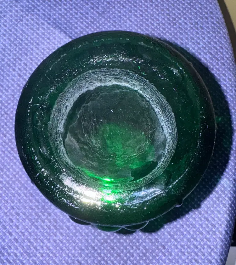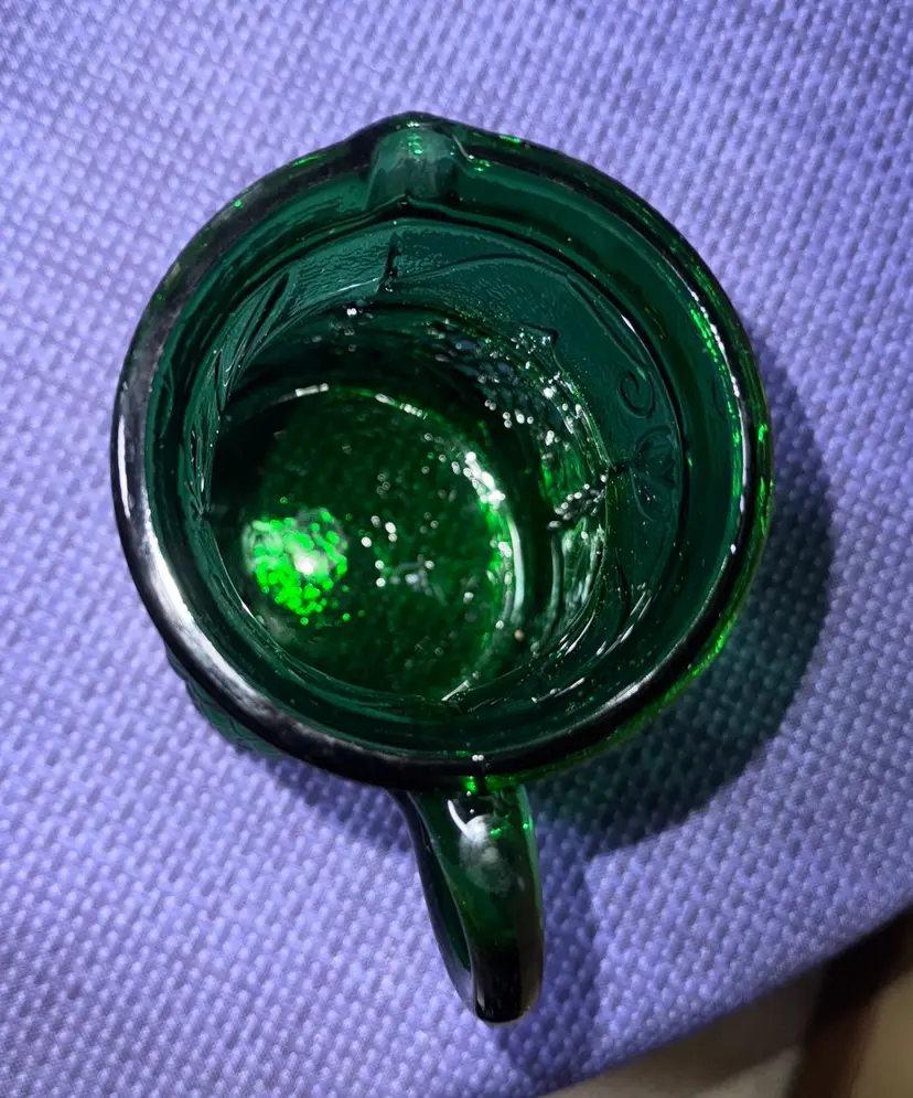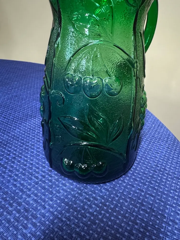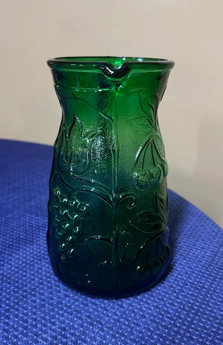 Rossini Empoli Italy Green Glass Pitcher 7.5” tall about 3.75” diameter Elegant green glass pitcher with embossed floral and grape design. Perfect for serving beverages. This vintage Rossini green glass pitcher was handmade in the region of Empoli Itlay. It is has a handcrafted applied handle and is adorned with a raised grape, leaf, and cherry pattern. It is the perfect green color and when light shines on it is even more stunning. The detail on this piece is just beautiful. It is eye-catching and is lovely as a pitcher or a vase. Excellent like new condition (1081108253)