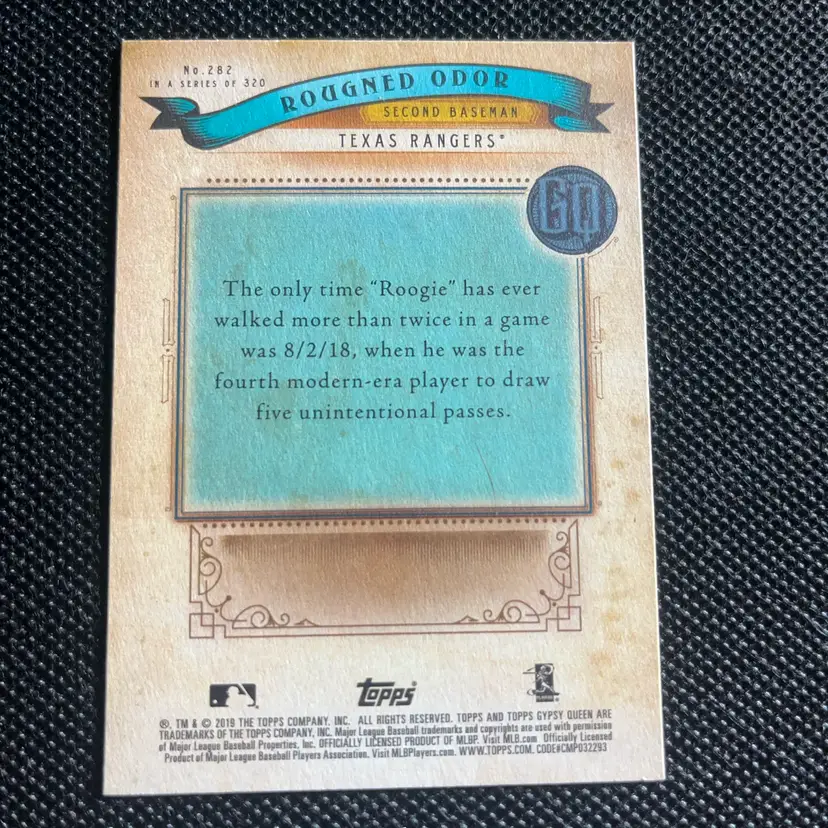 Rougned Odor #282 No Name variation from 2020 Gypsy Queen. These SPs remove the player name from the front and are noticeably tougher to pull. Card is clean, sharp, and stored safely since pulled. Perfect for Rangers collectors or anyone building the Gypsy Queen SP run.