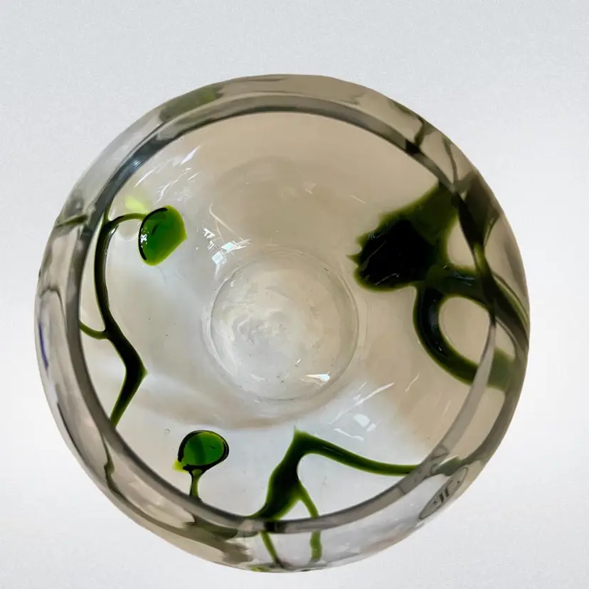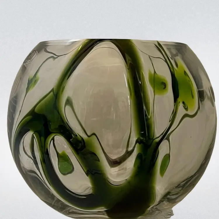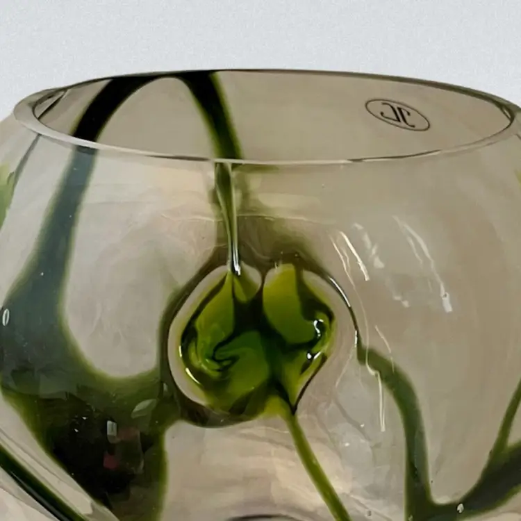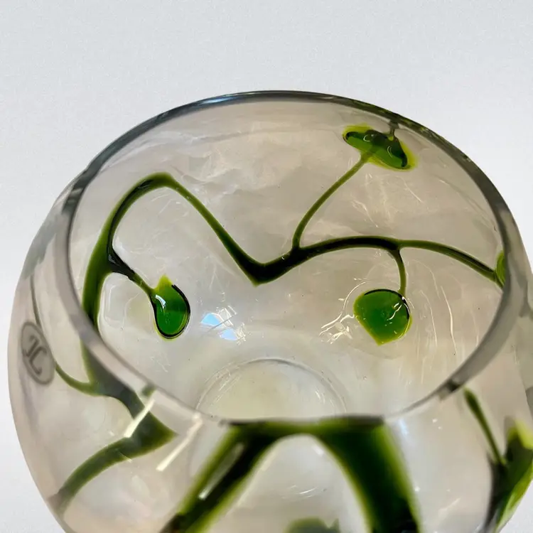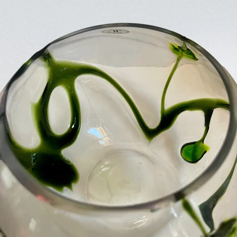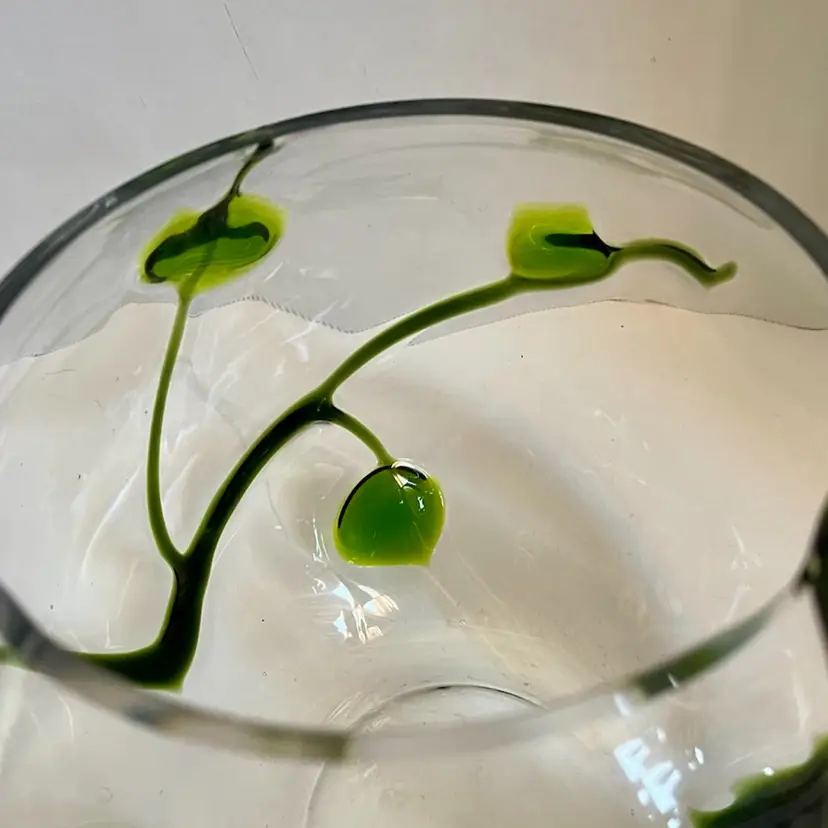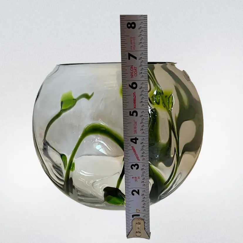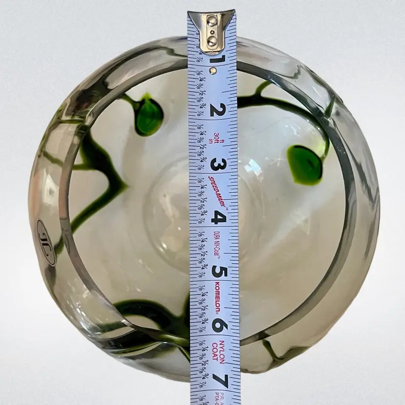 This stunning piece is heavy clear glass that is scattered with thick green leaf shapes and strands of glass that are abstract in design. Pictures do not do this justice. Condition: No chips or cracks, does have very light scratches near the base (see picture). Measurements: Approximately 6.5” T x 7.75” W. 25” circumference. Please see pictures for condition and measurements as they are a part of the description. Item # 2036, N10 Thank you for looking!
