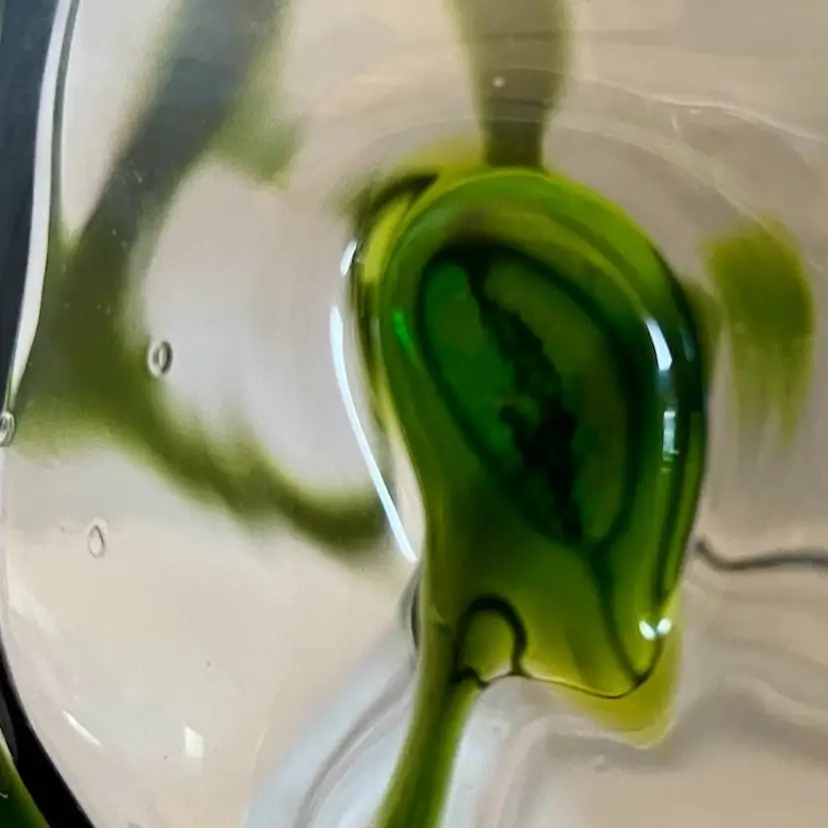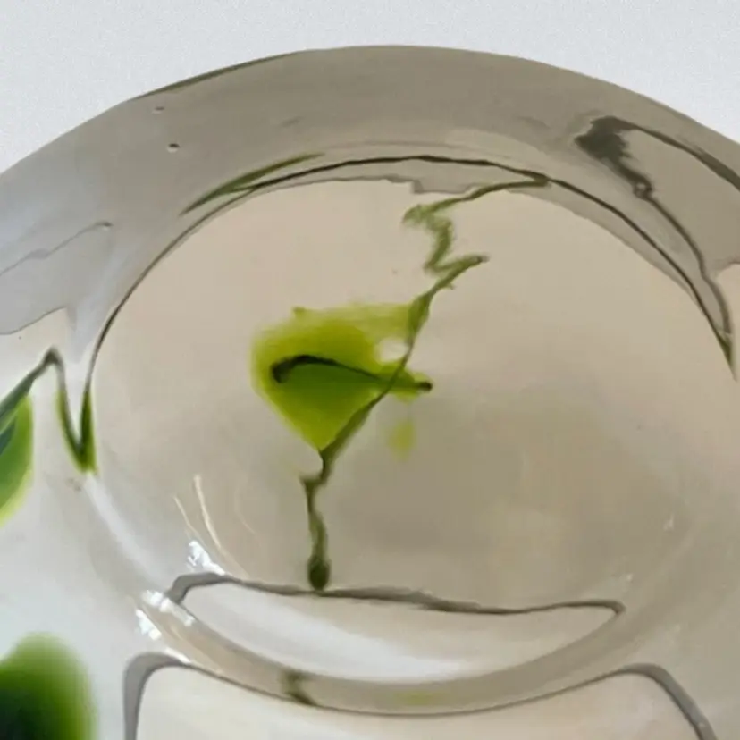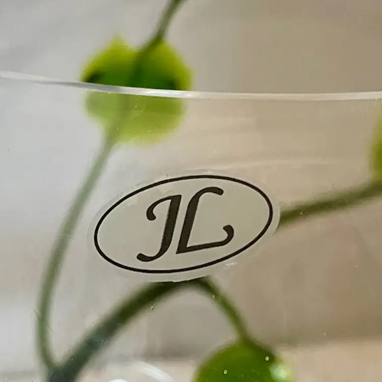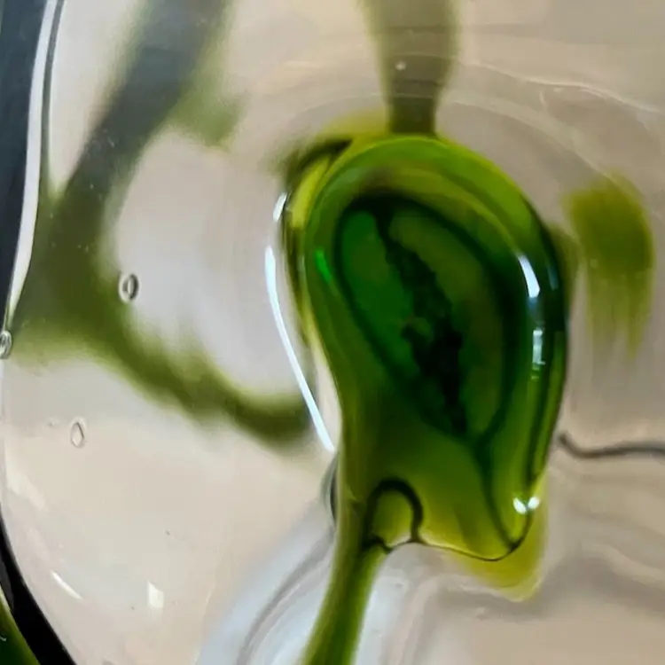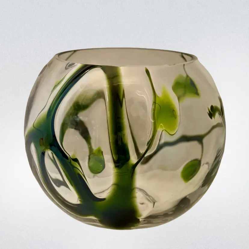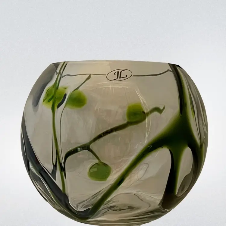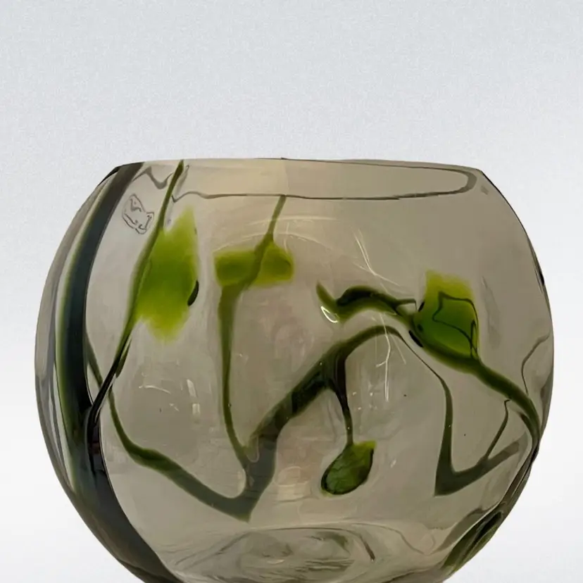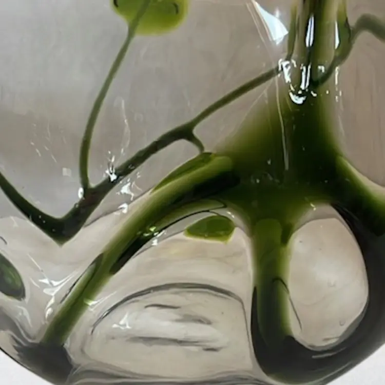 This stunning piece is heavy clear glass that is scattered with thick green leaf shapes and strands of glass that are abstract in design. Pictures do not do this justice. Condition: No chips or cracks, does have very light scratches near the base (see picture). Measurements: Approximately 6.5” T x 7.75” W. 25” circumference. Please see pictures for condition and measurements as they are a part of the description. Item # 2036, N10 Thank you for looking!