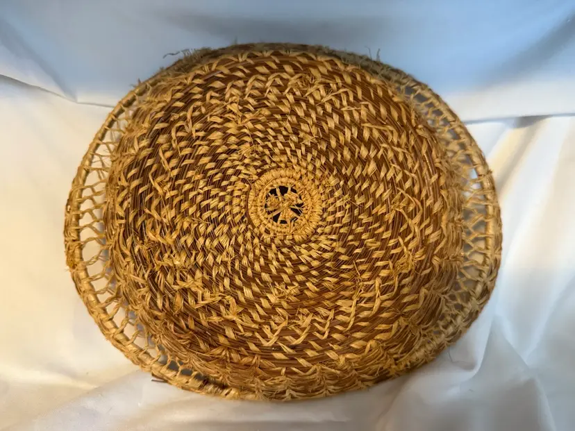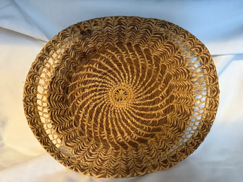 Delicate tray with woven pinwheel design. Perfect for bread or rolls! Measures 10 inches in diameter and is approximately 2 inches high.