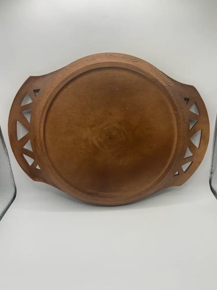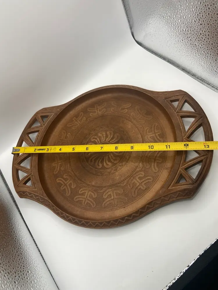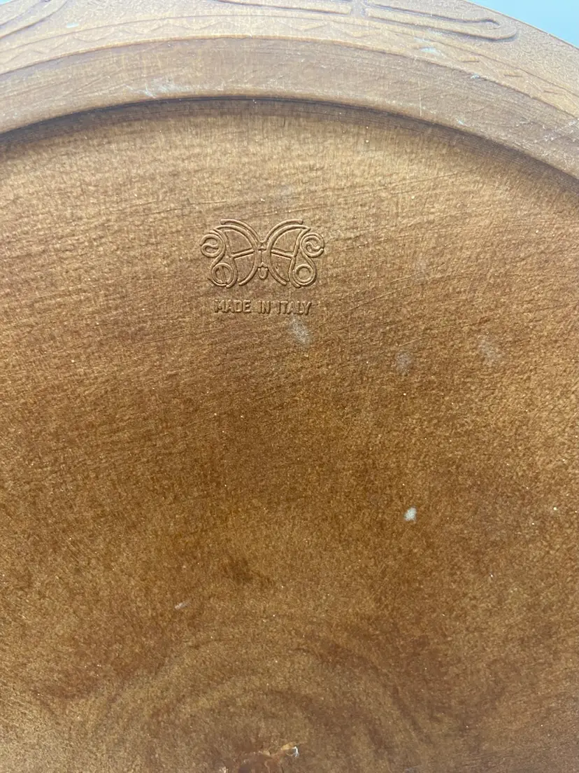 This is a light weight tray that is very pretty, and a great size. Not sure of material it is made of, but likely some type of plastic. It looks like real wood, and is Stamped on back “Made in Italy”. No issues noted.