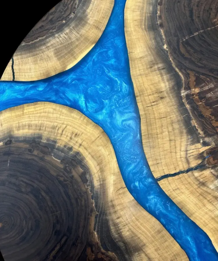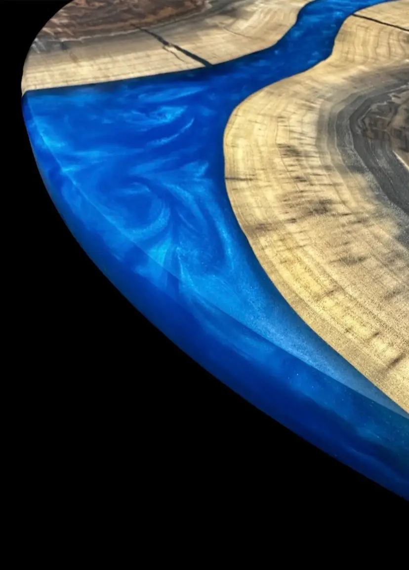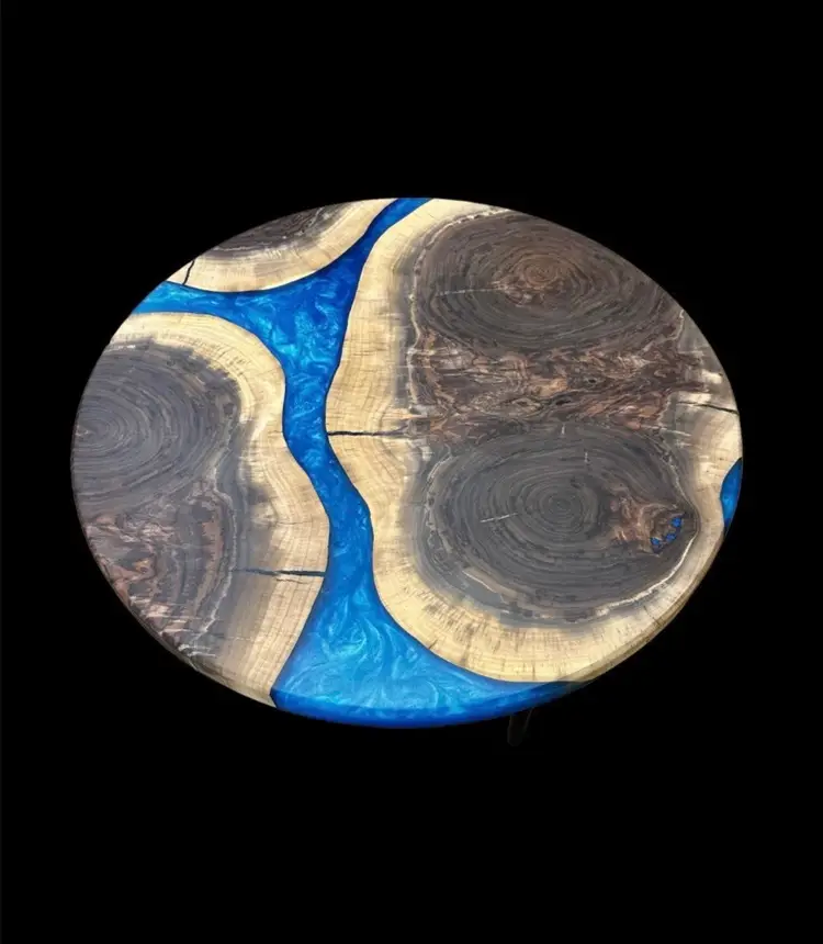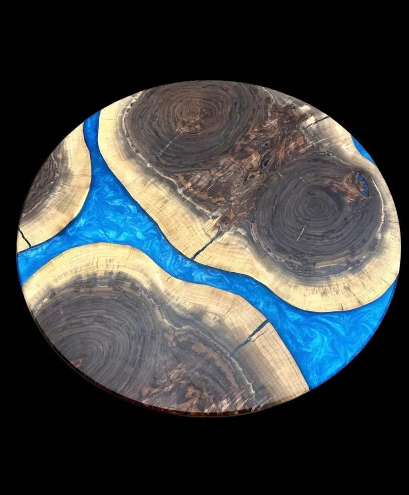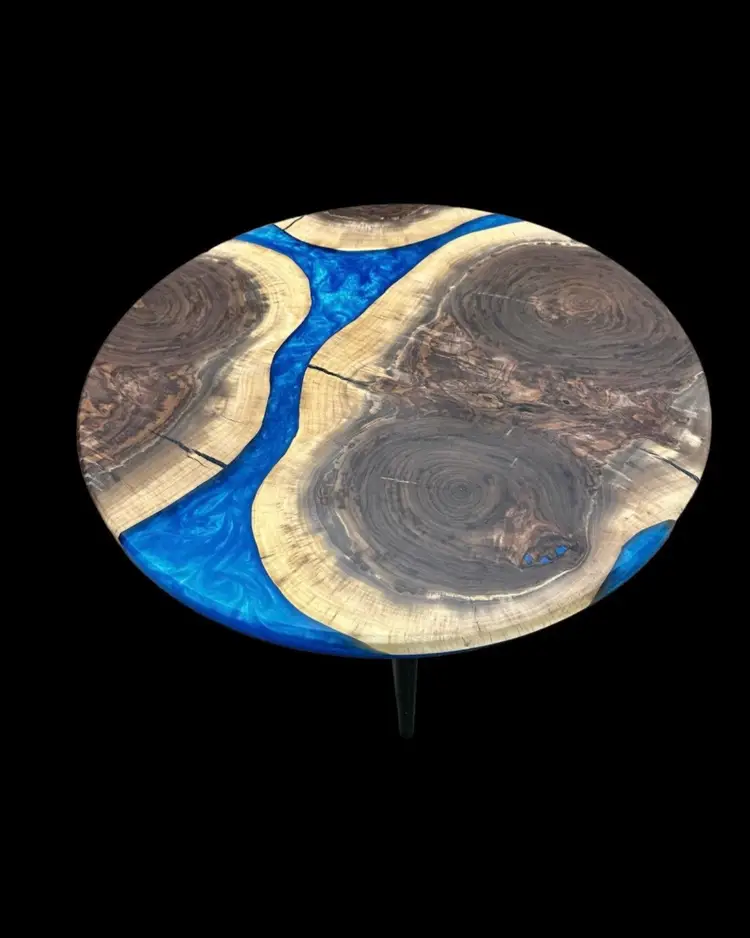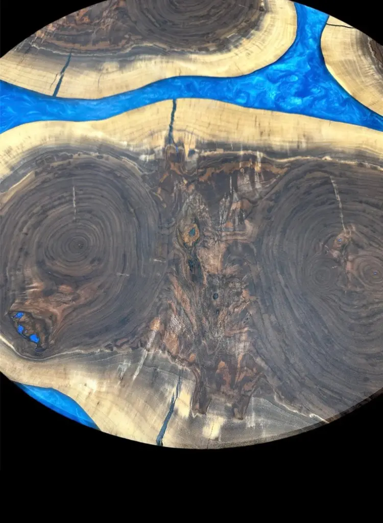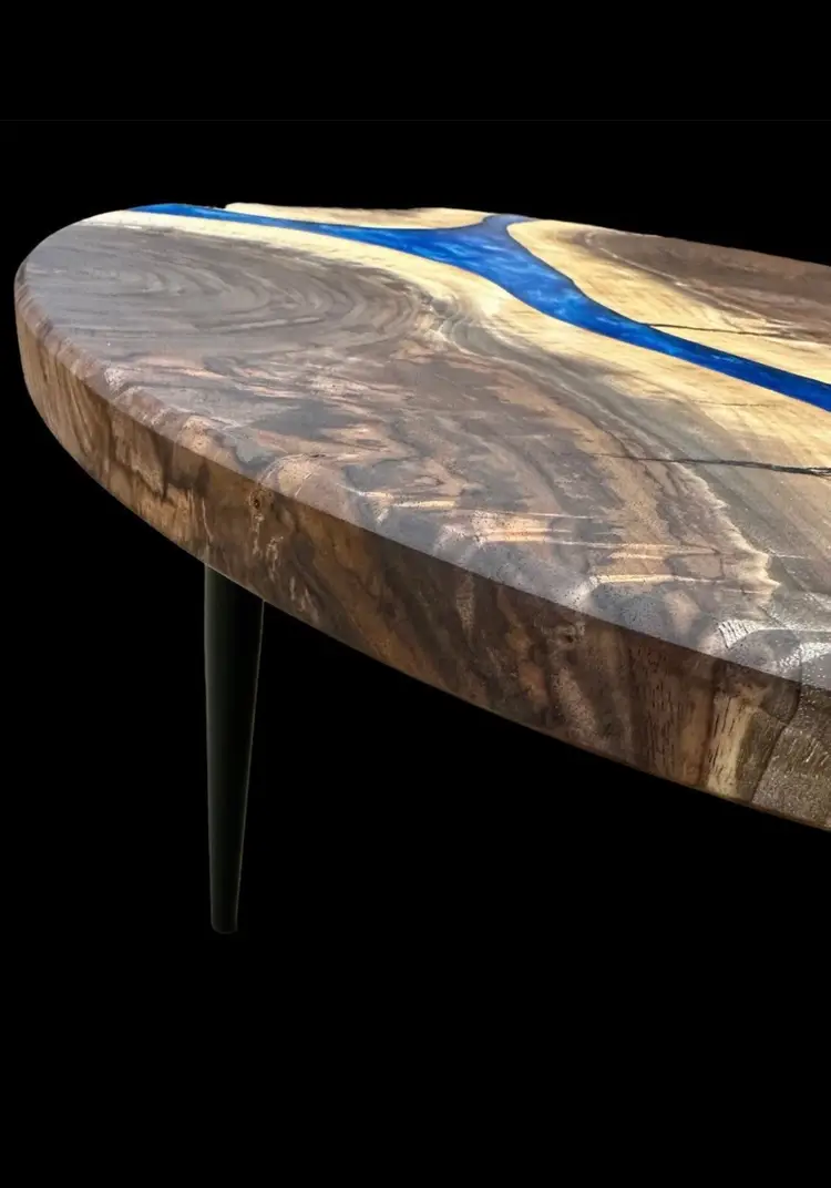 This table is made of American Black Walnut cookies (slabs) and cobalt blue epoxy resin.